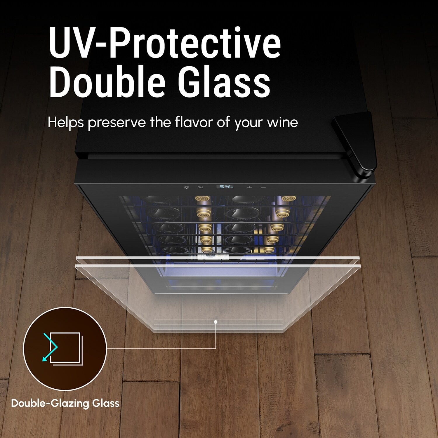 - Préservez la qualité de votre vin grâce à notre porte vitrée à double vitrage anti-UV. Ce dispositif bloque les rayons UV nocifs, garantissant ainsi la préservation du goût et des arômes parfaits de votre vin.