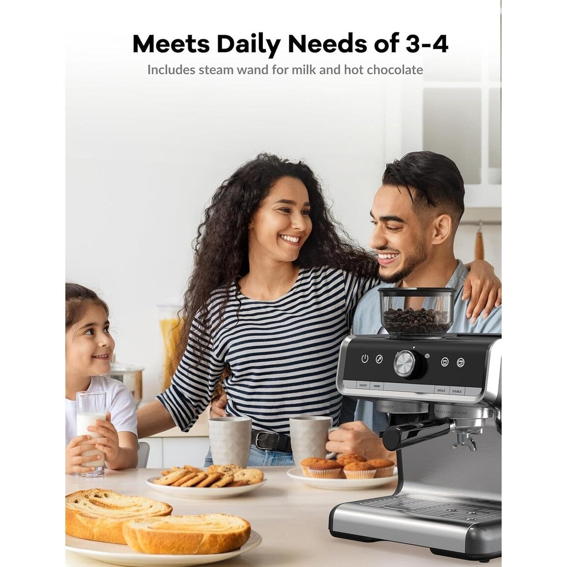 【Machine à expresso professionnelle 20 bars】 - Notre machine à expresso semi-automatique tout-en-un est équipée d'une pompe professionnelle de 20 bars et d'un puissant moteur de 1450 W, garantissant une extraction optimale pour un café plus riche et aromatique. Grâce à sa polyvalence, préparez facilement des cappuccinos onctueux, des lattes veloutés ou des expressos corsés, à la maison comme au bureau. 【Machine à café avec broyeur intégré】 - La machine à café est dotée d'un broyeur conique en acier inoxydable avec 30 réglages de mouture, vous permettant de personnaliser la finesse de votre mouture, de fine à grossière. Son design antistatique réduit les projections et assure une mouture homogène. 【Buse vapeur professionnelle】 - La puissante buse vapeur rotative à 360° vous permet de créer une mousse de lait onctueuse sans effort, sublimant les arômes et facilitant la réalisation de magnifiques mousses à la maison. Obtenez une mousse de lait parfaite pour vos cappuccinos ou un lait chaud idéal pour vos lattes, pour une expérience digne d'un café et laissez libre cours à votre créativité en réalisant des mousses de lait uniques. 【Contrôle précis de la température et grand réservoir d'eau】 - Cette machine à expresso est équipée d'un système de contrôle intelligent de la température PID, garantissant une eau à la température idéale pour une extraction optimale de l'expresso. Son réservoir d'eau amovible de 2,8 litres (95 oz) améliore la praticité et l'efficacité de la préparation et réduit la fréquence des remplissages. 【Facile à utiliser et à entretenir】 - Grâce à son panneau de commande simple et intuitif permettant de sélectionner la vapeur, l'eau chaude et les expressos simples ou doubles, cette machine à cappuccino avec broyeur intégré est extrêmement facile à utiliser. Son design élégant et compact s'intègre parfaitement dans toutes les cuisines et son réservoir d'eau et son bac d'égouttement amovibles facilitent le nettoyage.