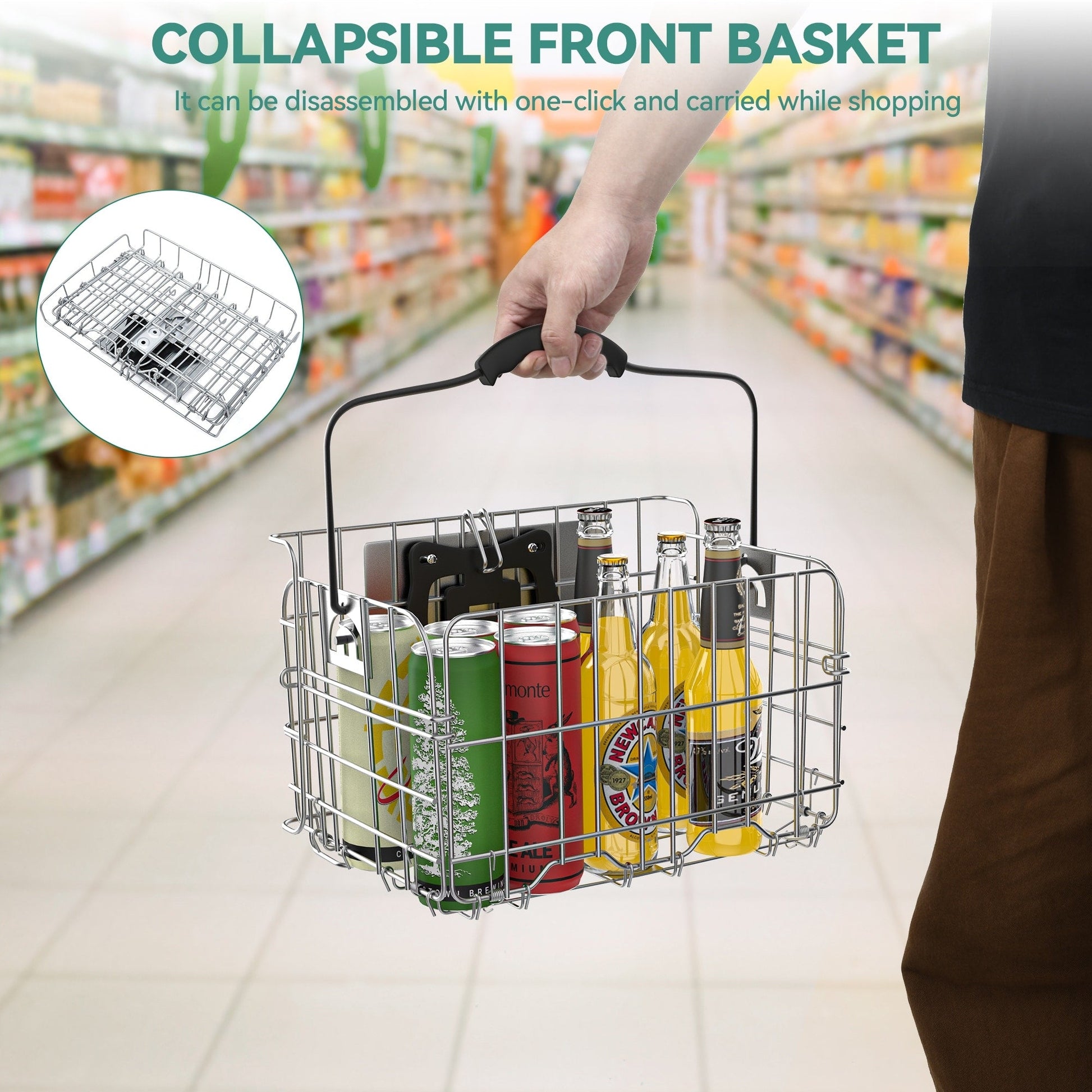 - Le panier avant est pliable et amovible, et vous pouvez le transporter pour faire vos courses grâce à un démontage facile par simple pression d'un bouton.