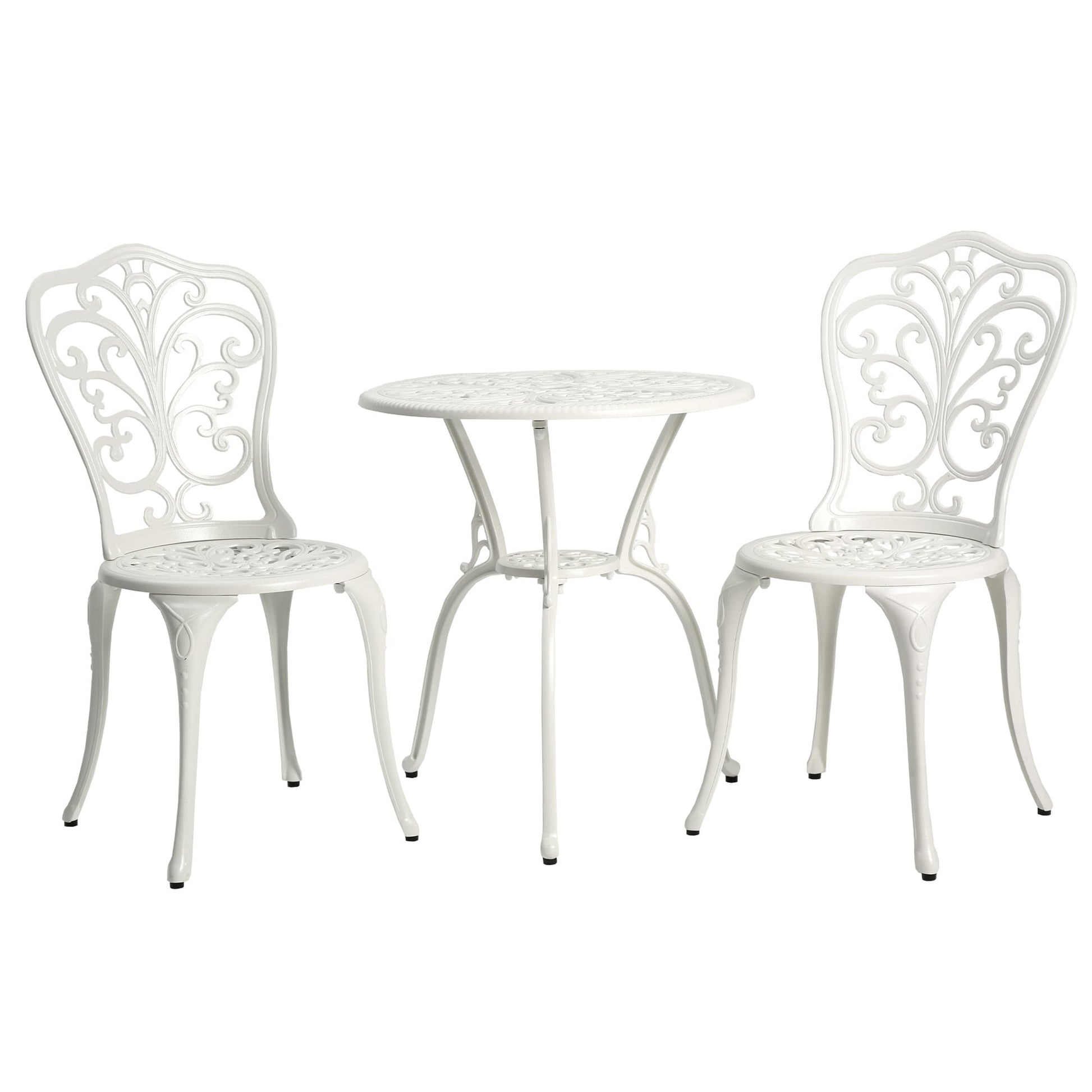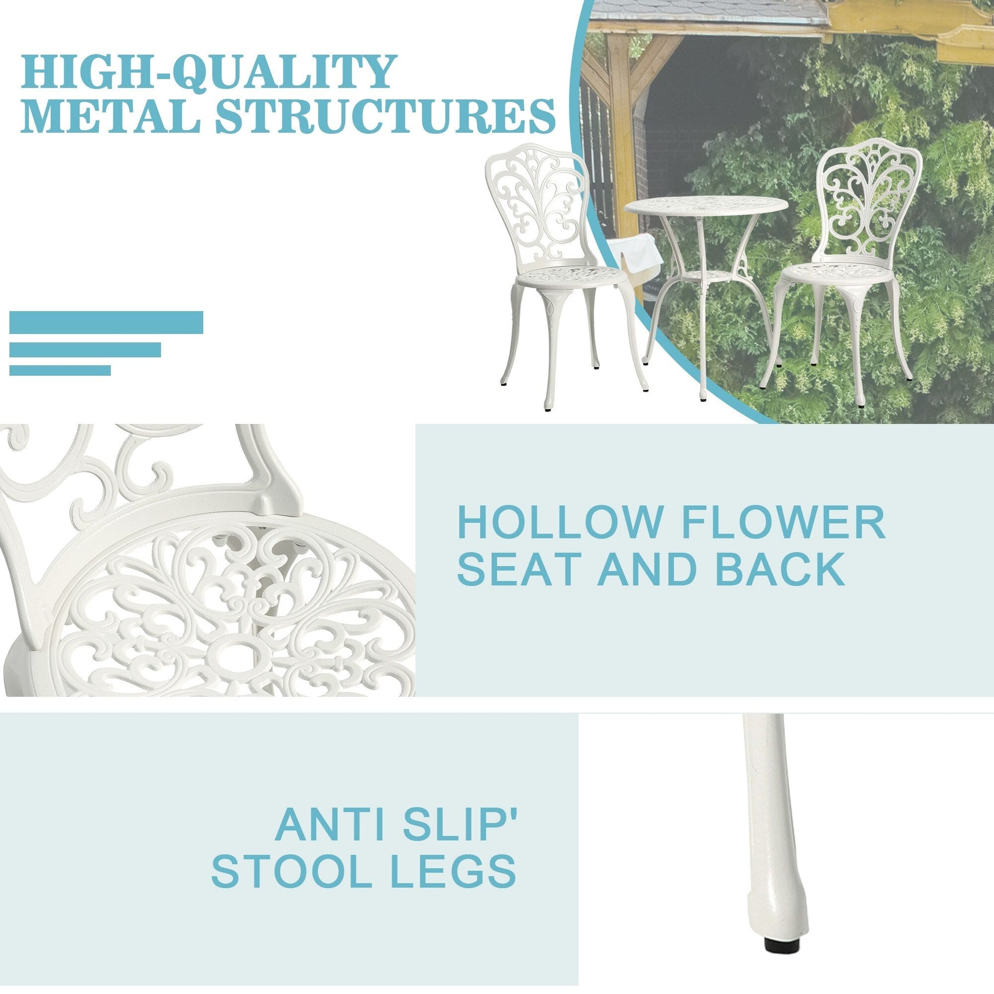 Profitez pleinement de votre espace extérieur avec cet ensemble bistro en aluminium composé de 3 pièces, orné de délicates sculptures de papillons et d'une finition cuivre antique. Fabriqué en aluminium moulé robuste avec un traitement antirouille et résistant aux intempéries, cet ensemble est conçu pour une utilisation par tous les temps et résiste à l'oxydation. Grâce à son trou intégré de 4,4 cm (1,75 pouce), vous pouvez y installer un parasol de 2,3 m (7,5 pieds) (non inclus) pour vous protéger du soleil et de la pluie. Facile à nettoyer et à monter, cet ensemble est idéal pour décorer votre cour, votre piscine, votre terrasse, votre jardin ou votre véranda.