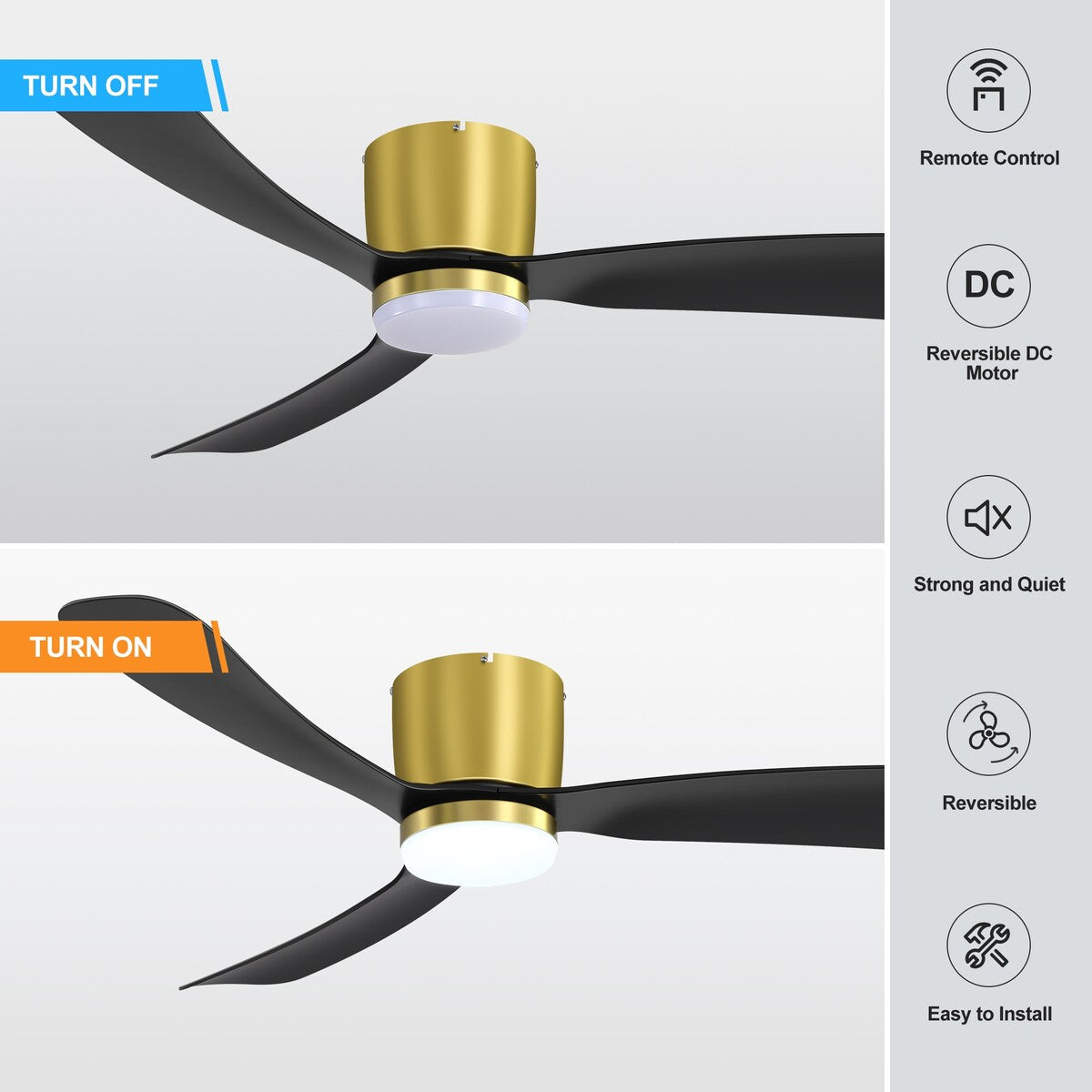 Ce ventilateur de plafond de 132 cm (52 pouces) est équipé d'un moteur CC réversible à 6 vitesses écoénergétique, intégré dans un boîtier épuré avec des bras architecturaux supportant 3 pales. Il dispose d'un éclairage LED 3000K et se contrôle facilement grâce à la télécommande incluse. Son moteur CC ultra-silencieux est 70 % plus efficace que les ventilateurs CA traditionnels.