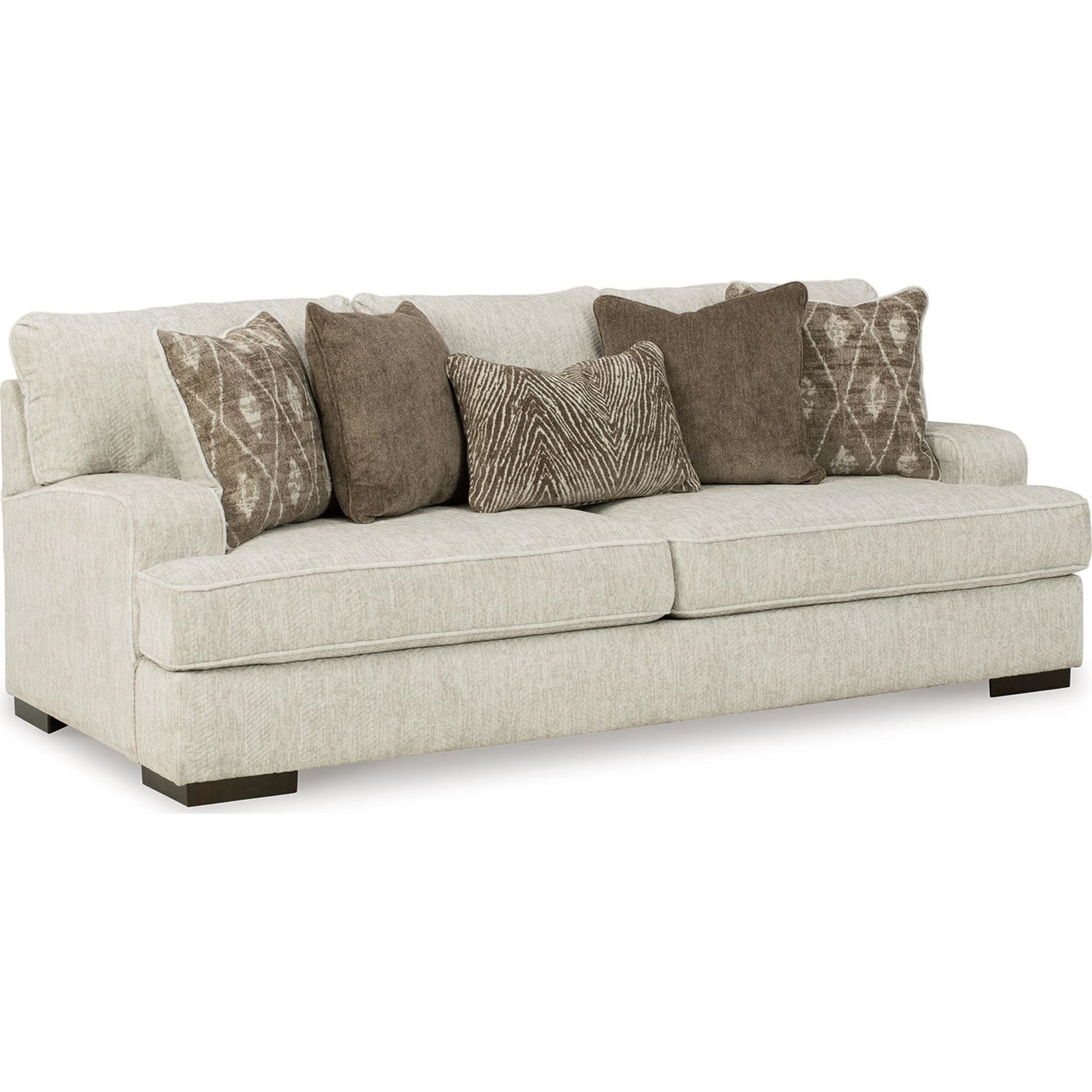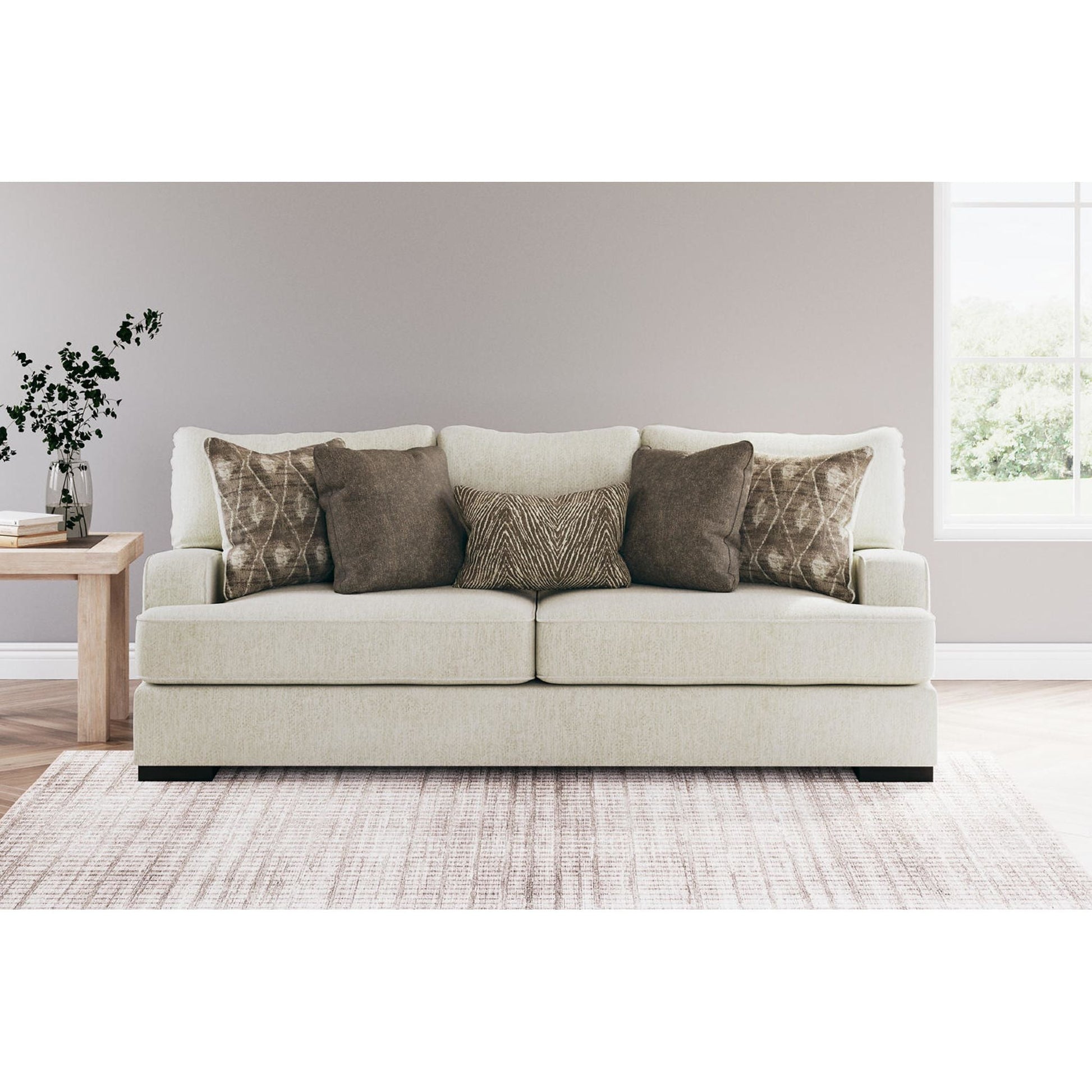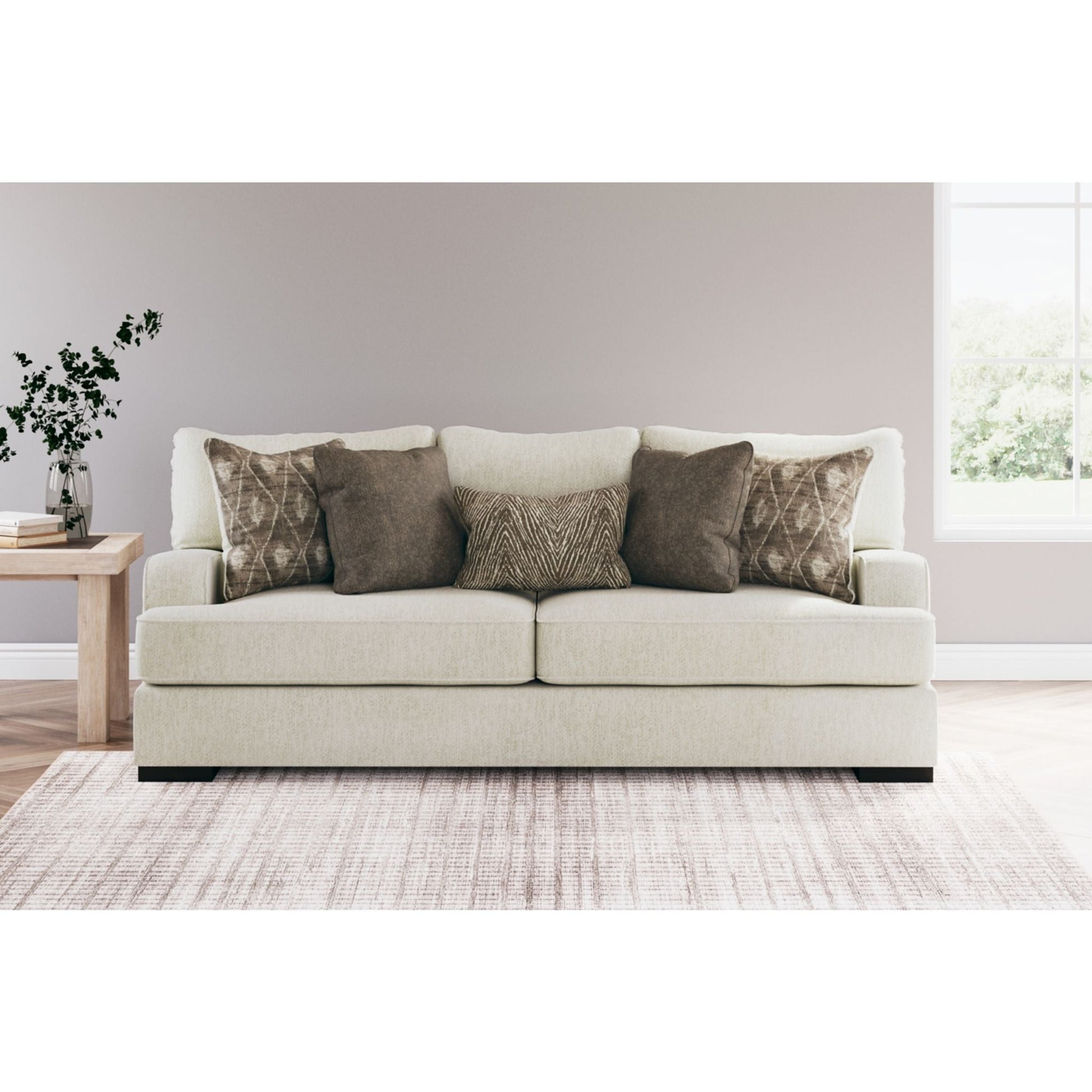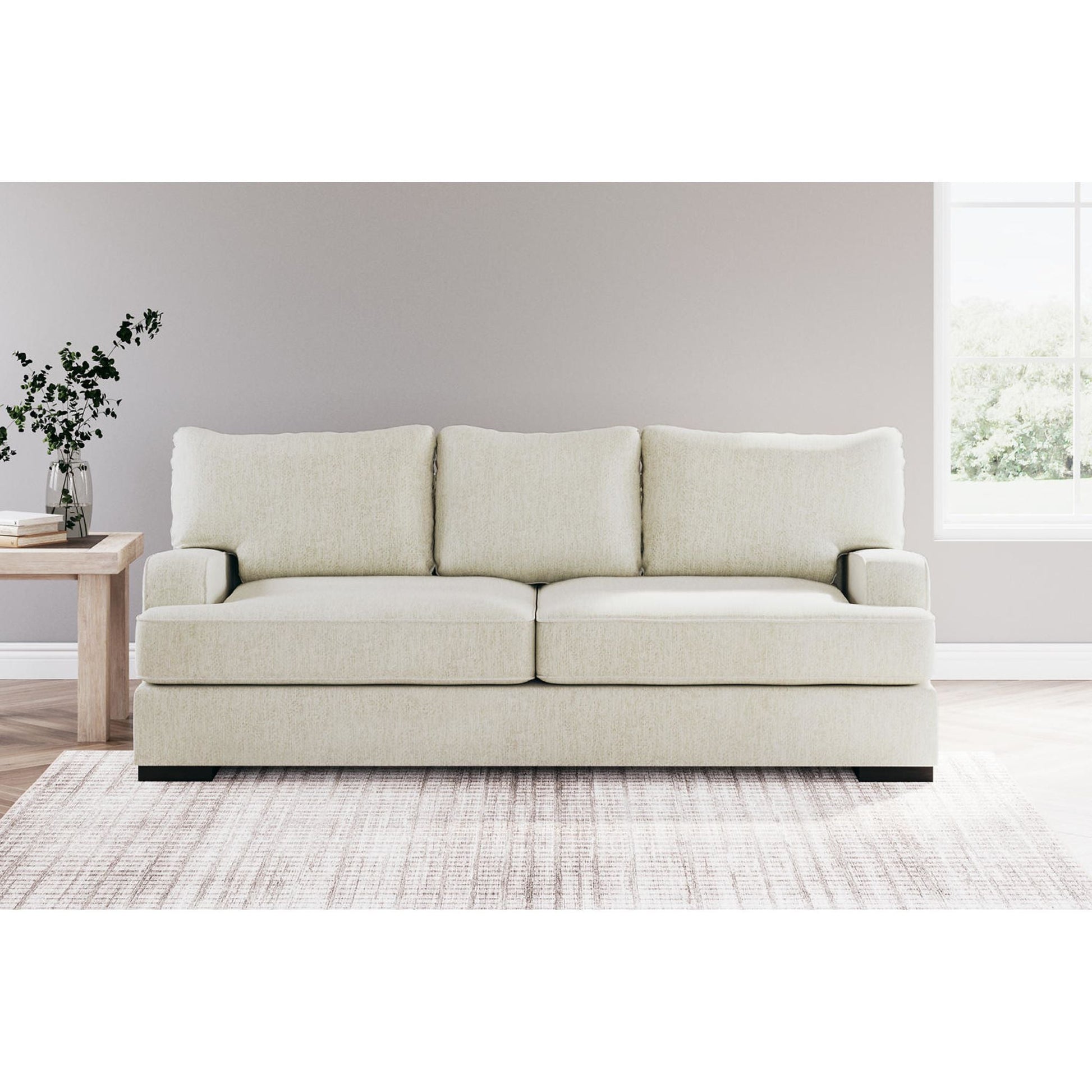Résolument moderne et d'une élégance décontractée, le canapé Alesandra s'intègre harmonieusement à de nombreux intérieurs. Son style unique se distingue par ses accoudoirs droits aux angles arrondis, ses coussins enveloppants et ses pieds bas en bois chaleureux. Le revêtement parchemin, subtilement texturé à chevrons, sublime les tons neutres.