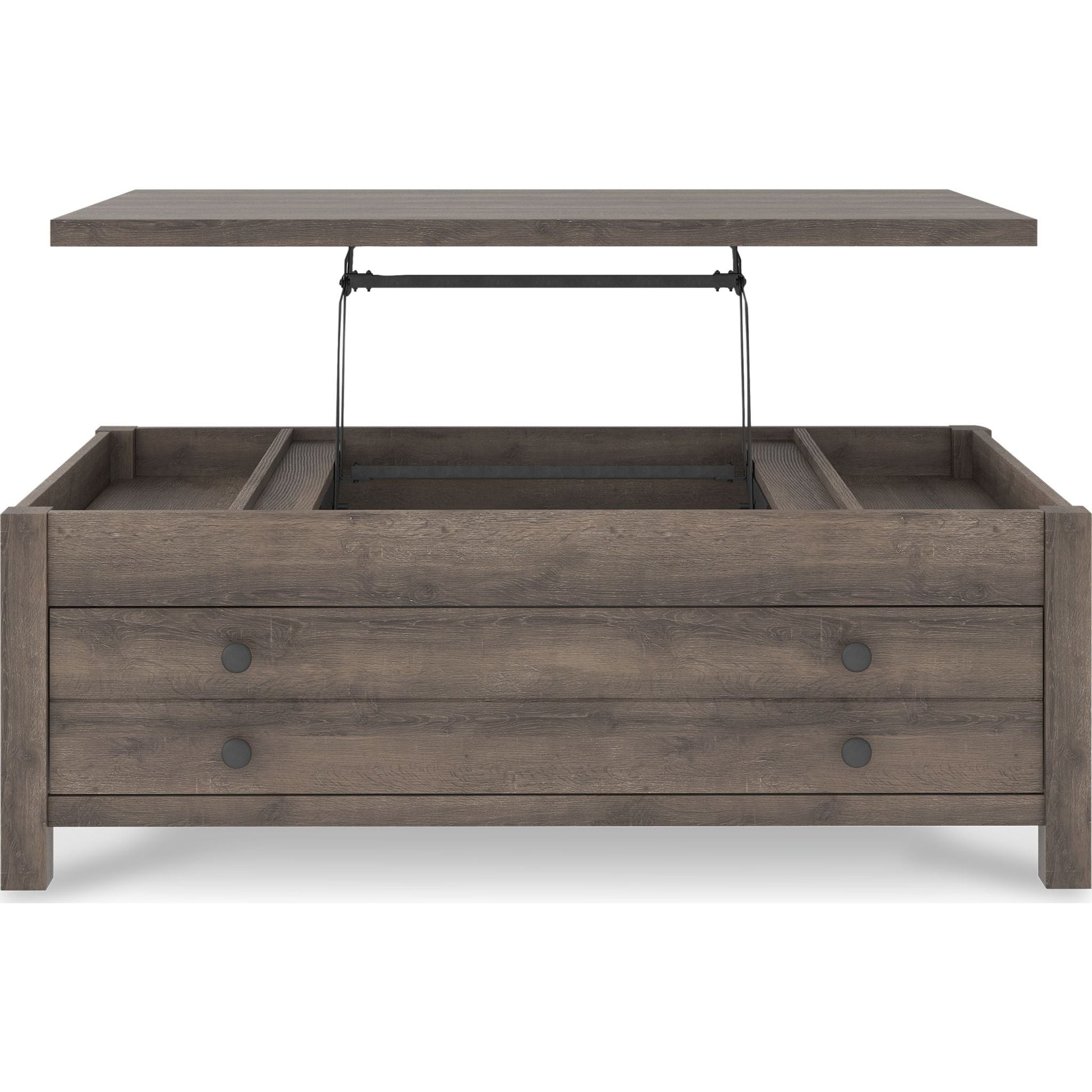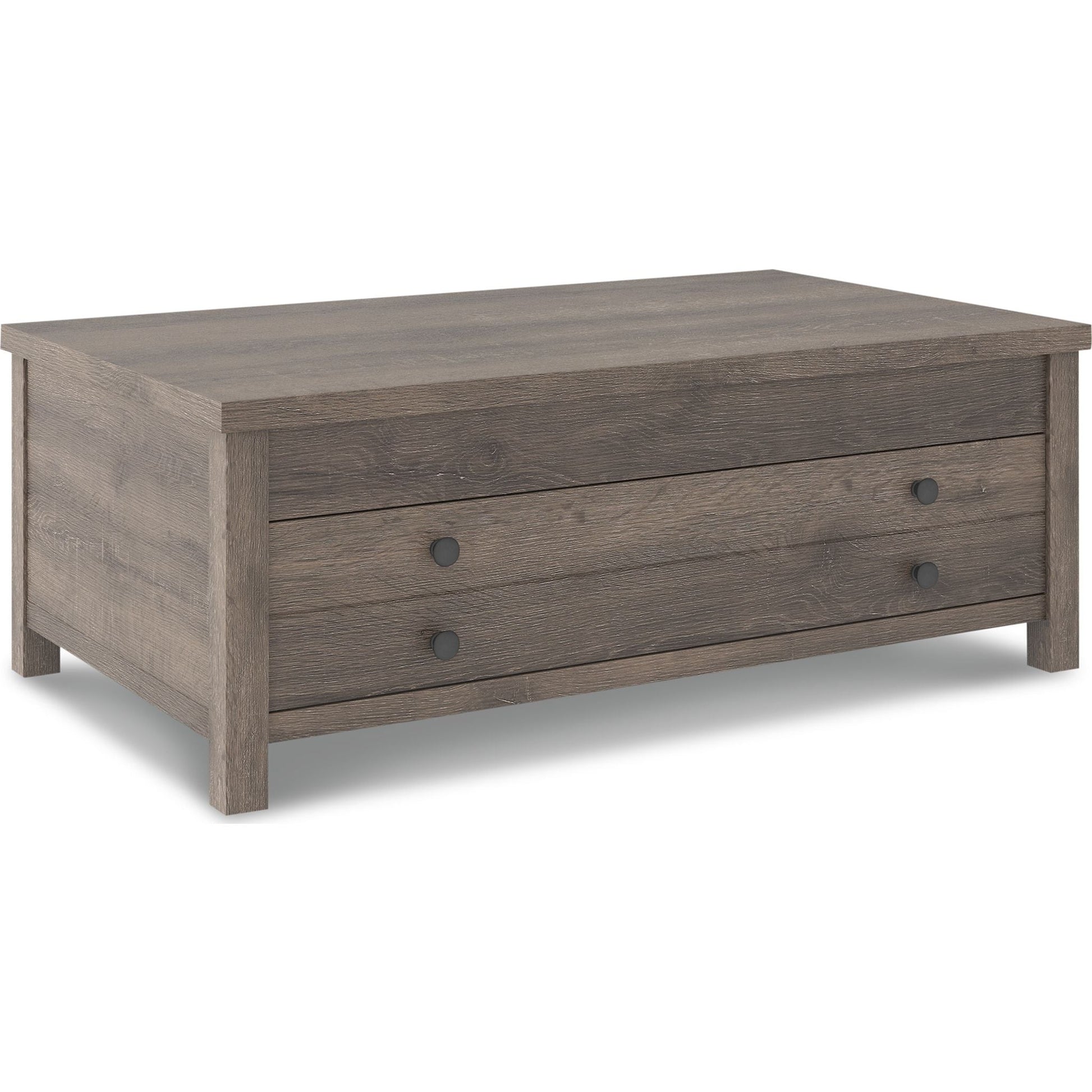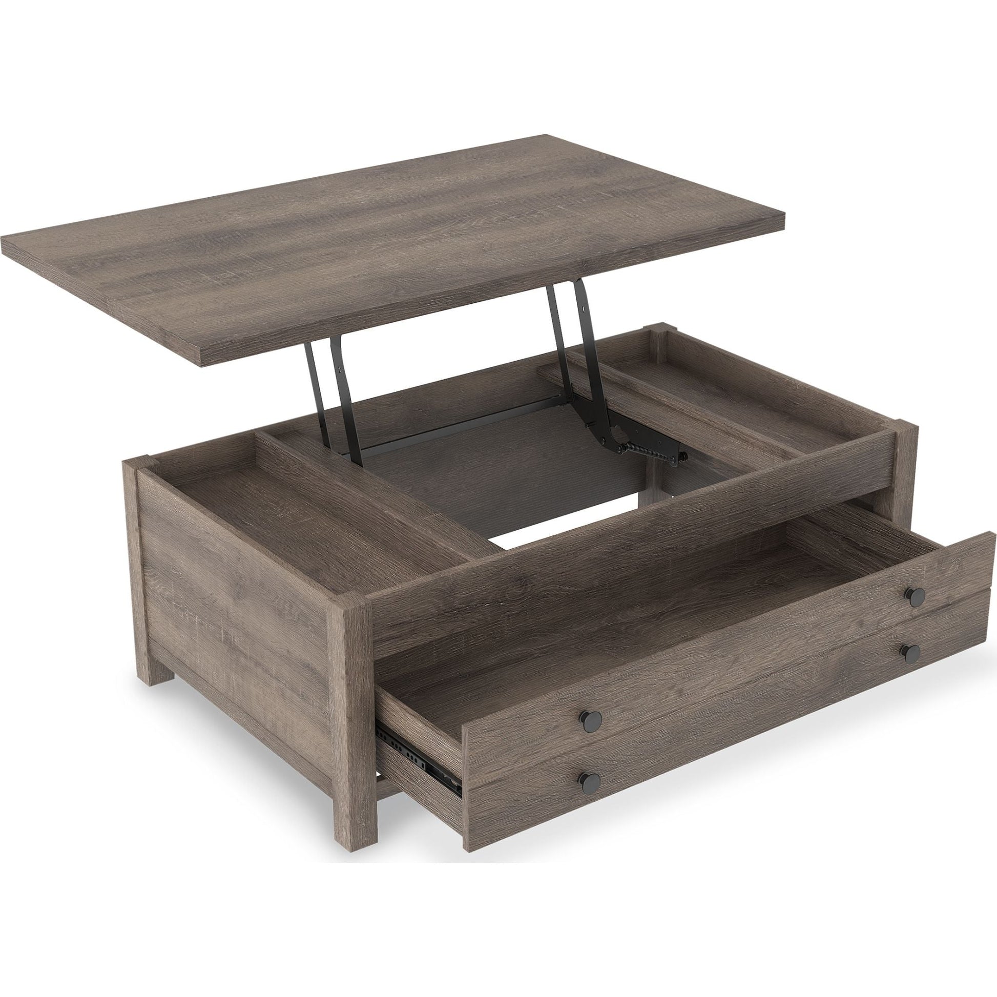 Rehaussez le style ferme moderne avec la table basse relevable Arlenbry. Arborant un élégant effet chêne vieilli et un design à croisillons, cette table est dotée d'un mécanisme à ressort pratique qui rapproche le plateau de vous. Polyvalente, elle vous permet de manger, travailler ou vous divertir confortablement installé(e) dans votre canapé.