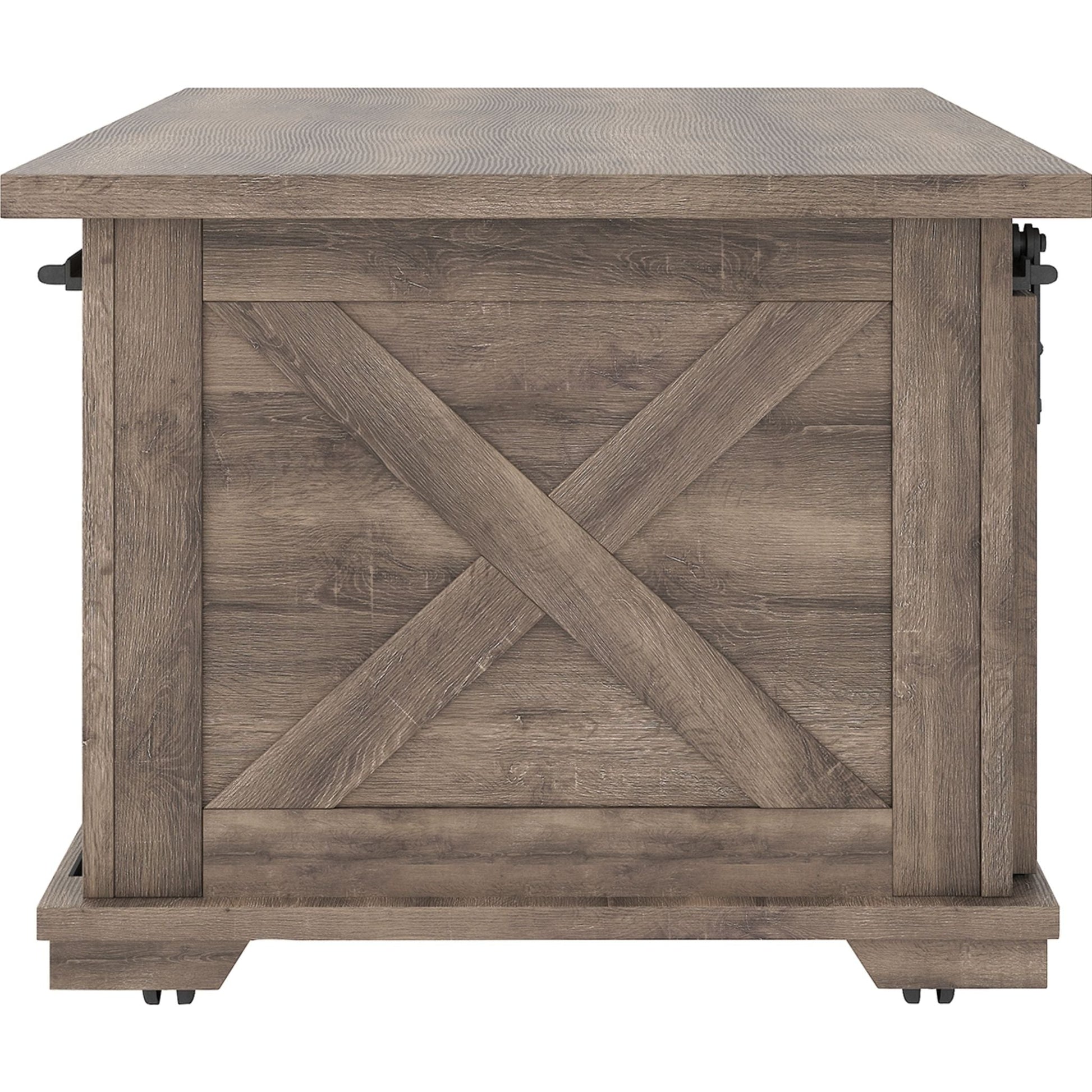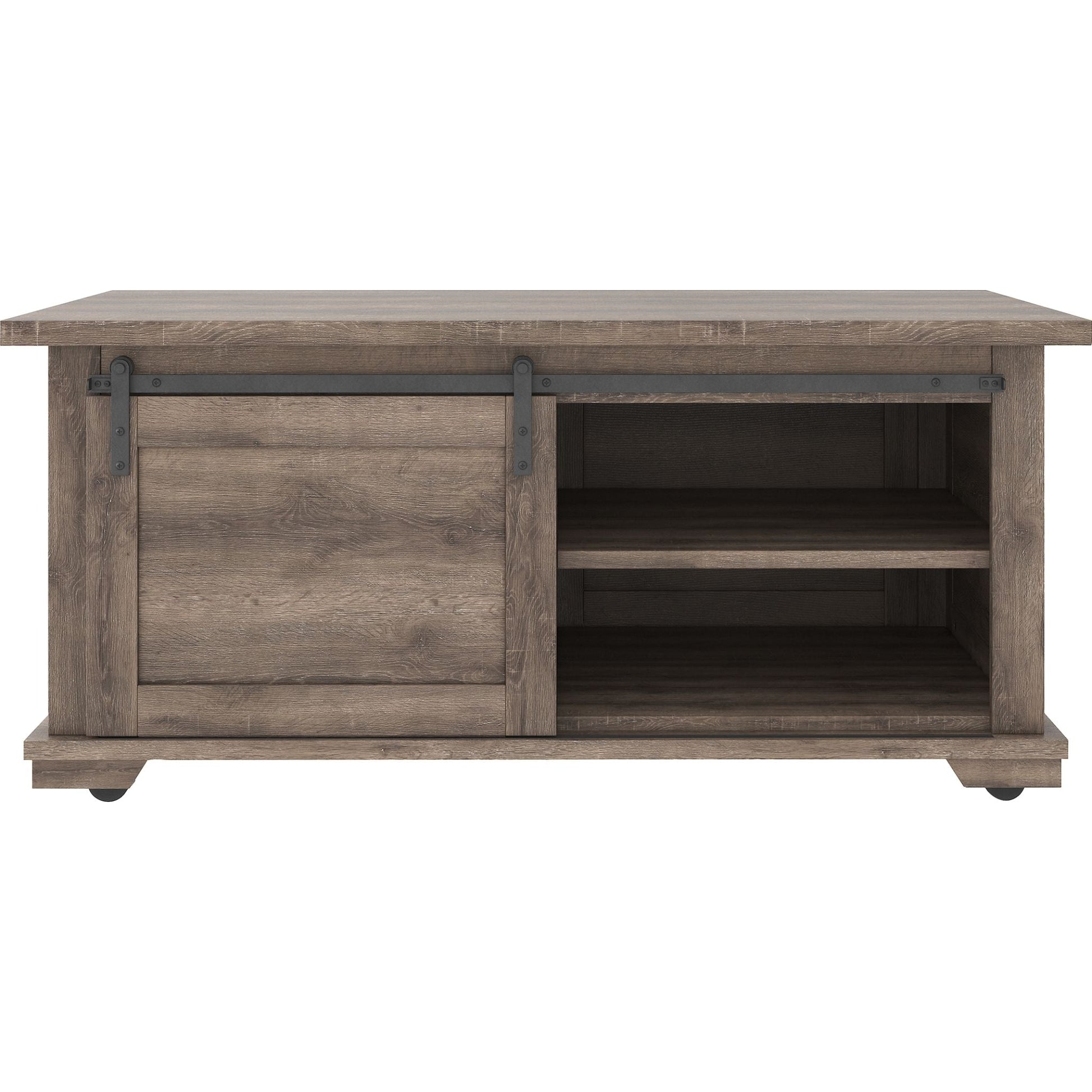 Rehaussez le style ferme moderne avec la table basse de rangement Arlenbry. Arborant un élégant effet chêne vieilli et des accents de bois de cerf, cette table est dotée d'une porte coulissante unique, inspirée des granges, qui révèle un espace de rangement avec étagères. Ses roulettes pivotantes ajoutent une touche tendance et pratique.