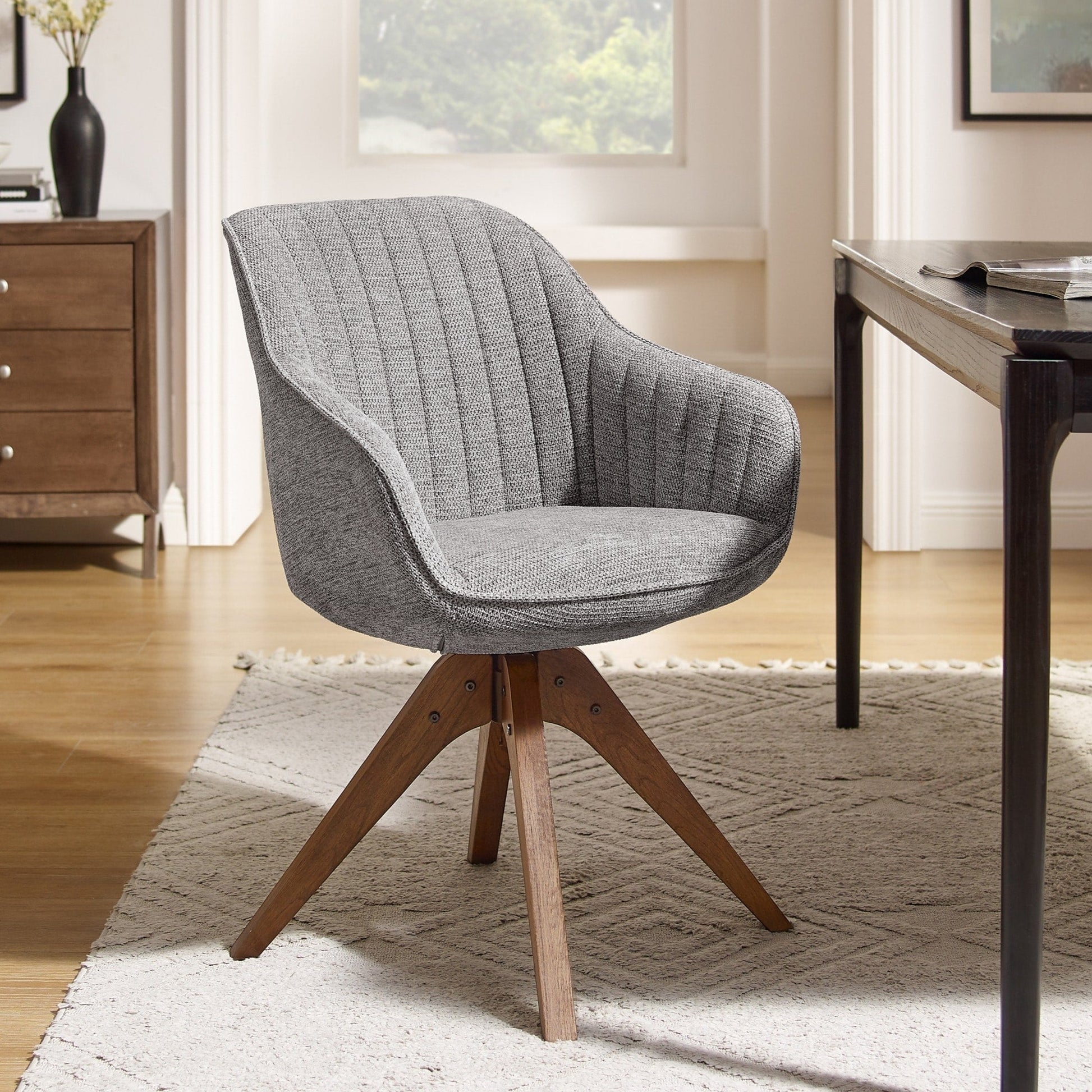 Rehaussez votre bureau à domicile avec ce fauteuil pivotant élégant. Son design moderne d'inspiration mid-century se caractérise par une assise moulée, des accoudoirs inclinés et un capitonnage à canaux le long du dossier et des accoudoirs. L'assise rembourrée confortable et le dossier inclinable sont revêtus du tissu ou du similicuir de votre choix. Les pieds évasés en hêtre massif, finition laquée noyer, lui confèrent un style rétro. Ce fauteuil pivote également à 360° pour une plus grande praticité.