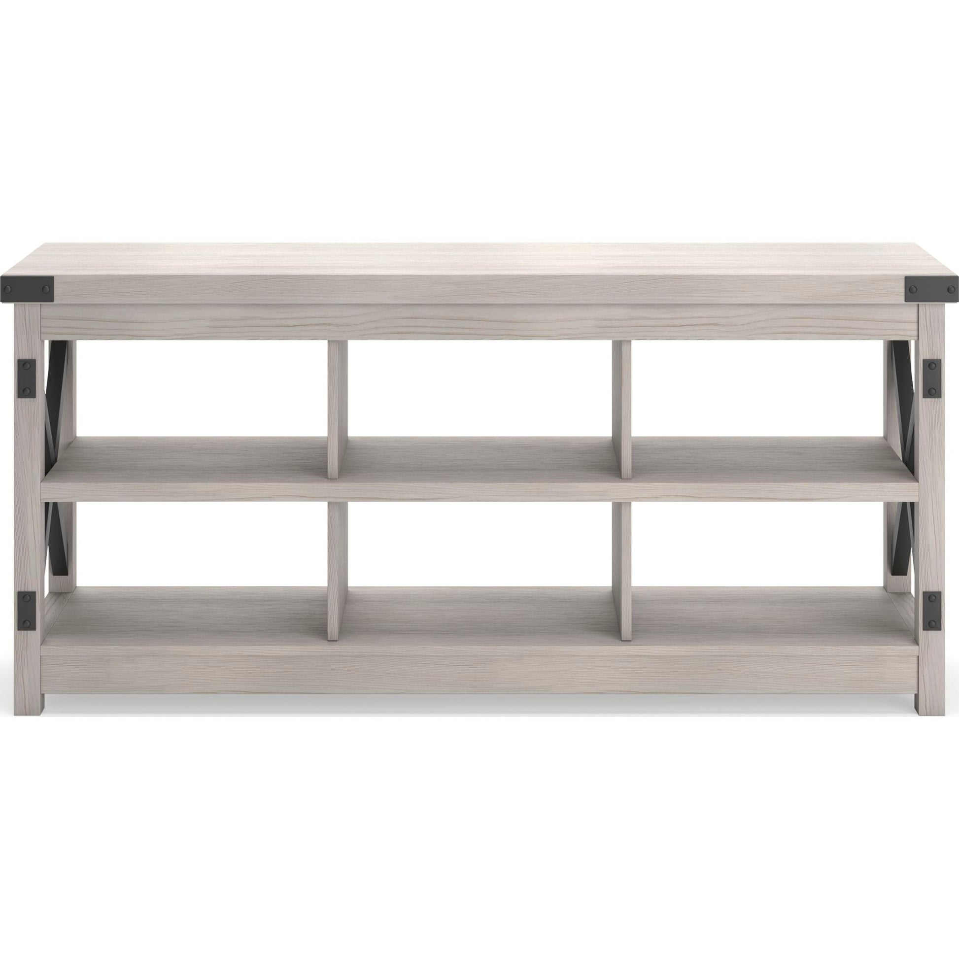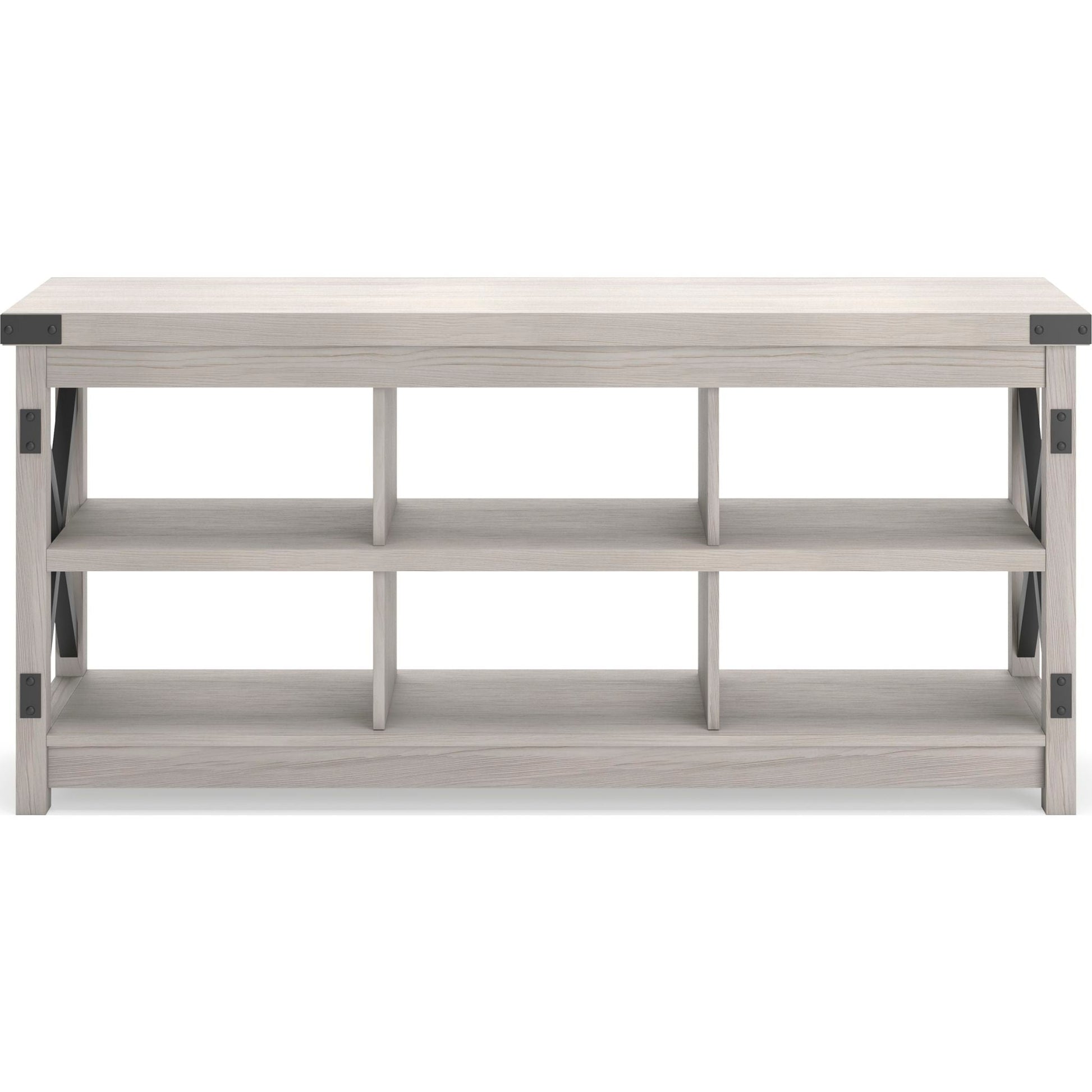 Avec sa finition blanchie à la chaux et ses six espaces de rangement ouverts, le meuble TV Bayflynn offre un style transitionnel qui s'intègre à tous les intérieurs, du chic urbain au style champêtre moderne. Des croisillons noirs contrastants à chaque extrémité ajoutent une touche de charme sobre.
