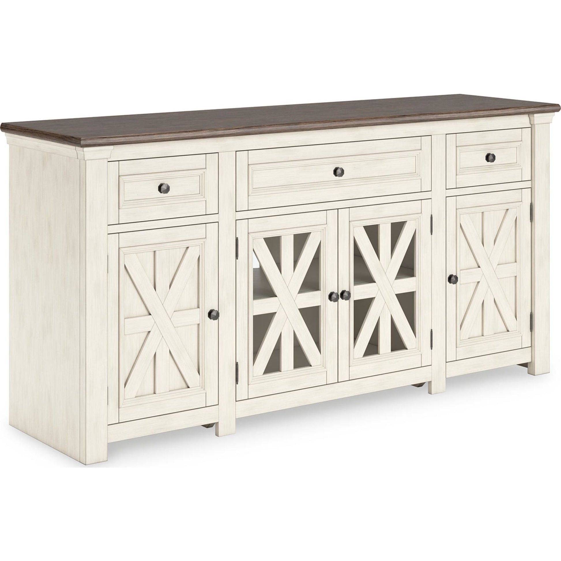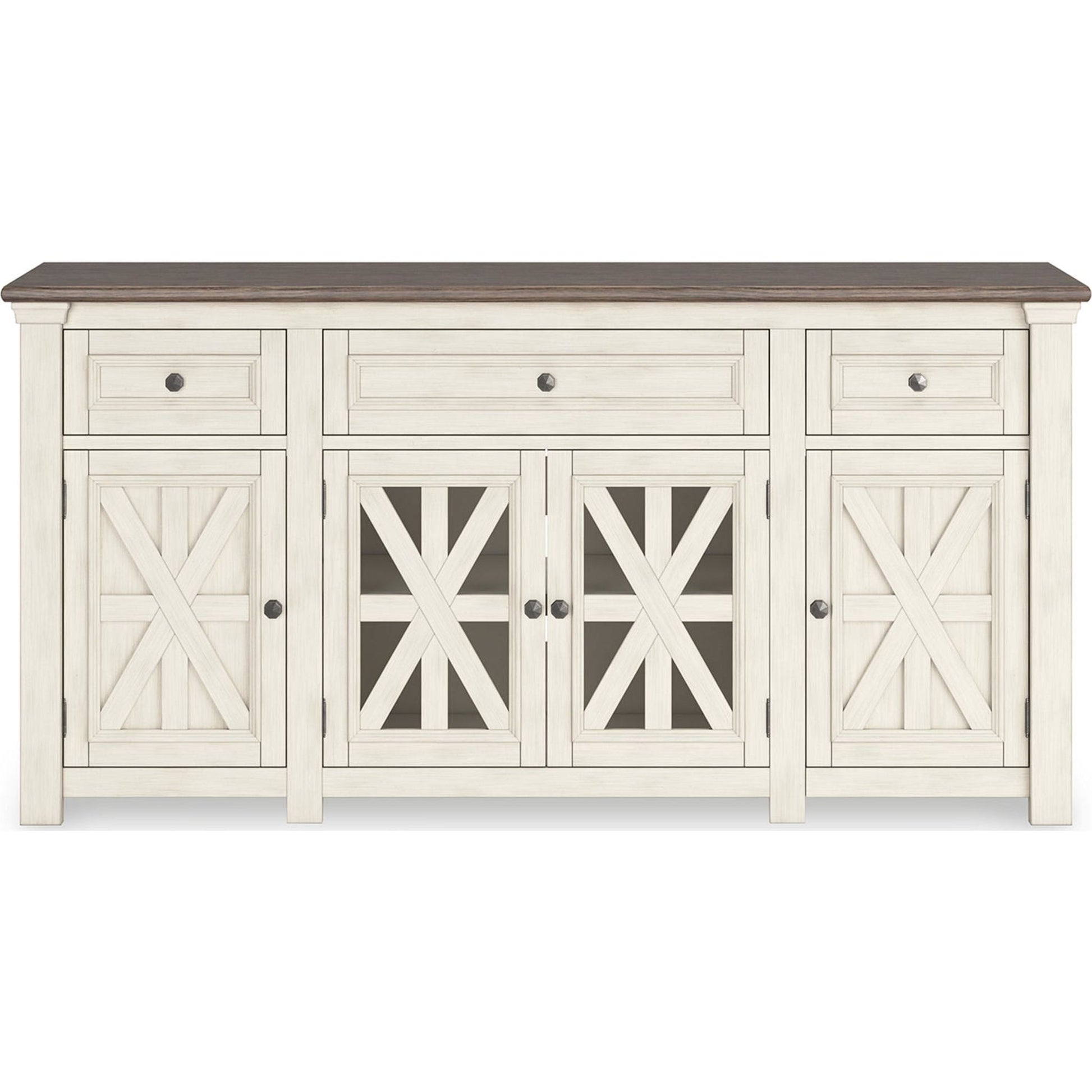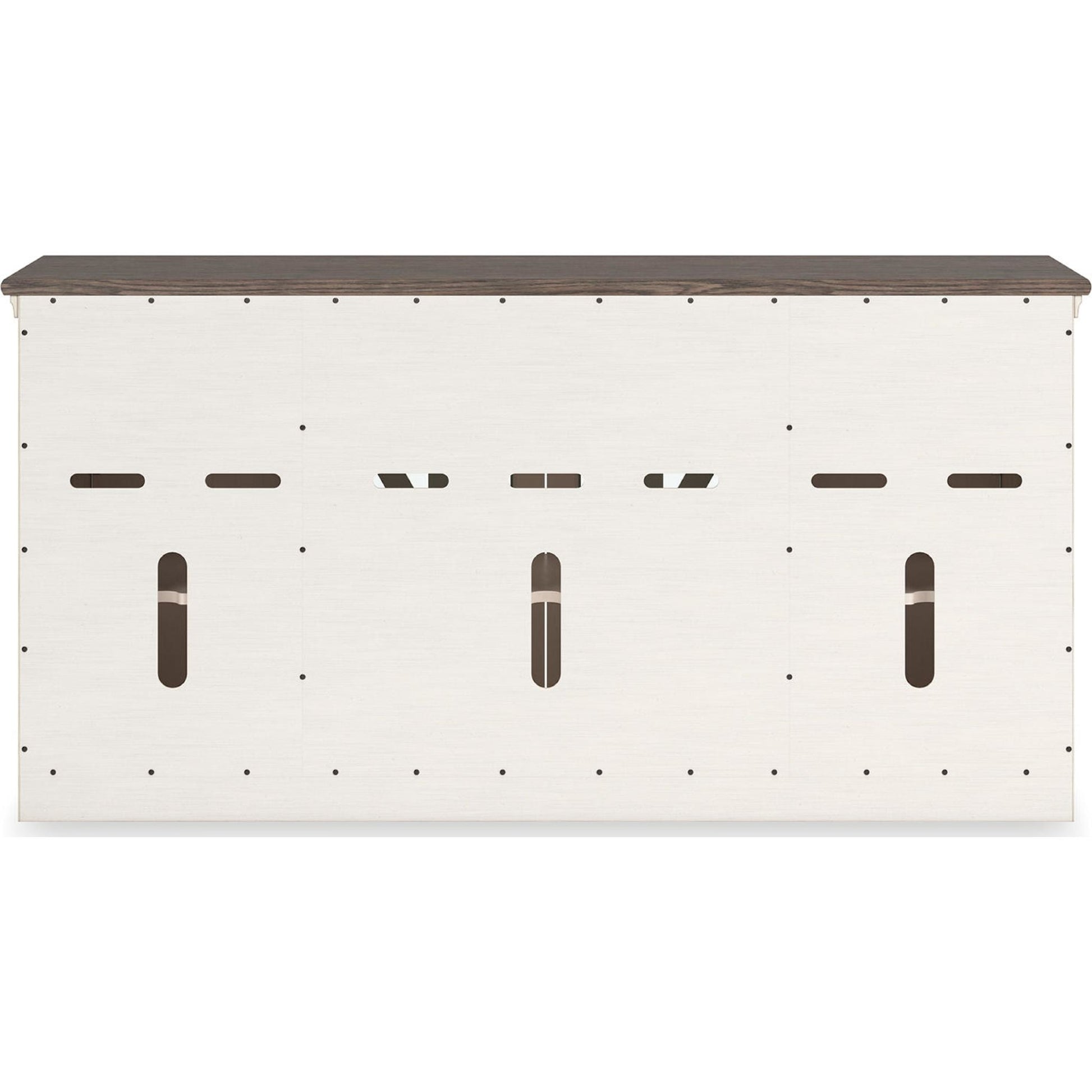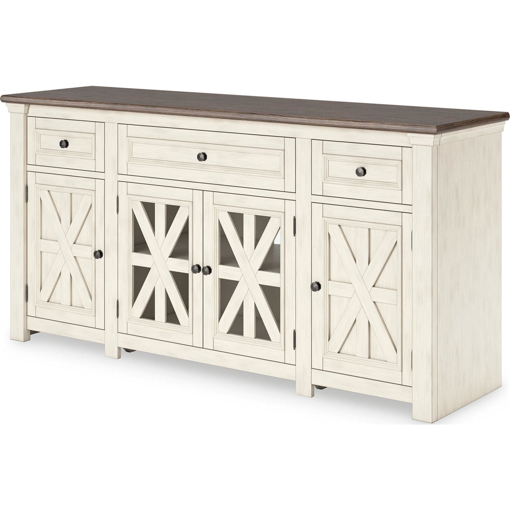 Que votre style soit rustique, shabby chic ou cottage, ce meuble TV s'intégrera parfaitement à votre intérieur. Sa finition bicolore associe un blanc vieilli texturé tendance à un gris patiné pour un charme authentique. Parmi ses détails charmants, on retrouve des portes d'armoire ornées de croisillons et d'incrustations de verre qui laissent entrevoir le contenu. Un espace de rangement généreux et des passe-câbles permettent d'accueillir confortablement tous vos appareils multimédias.