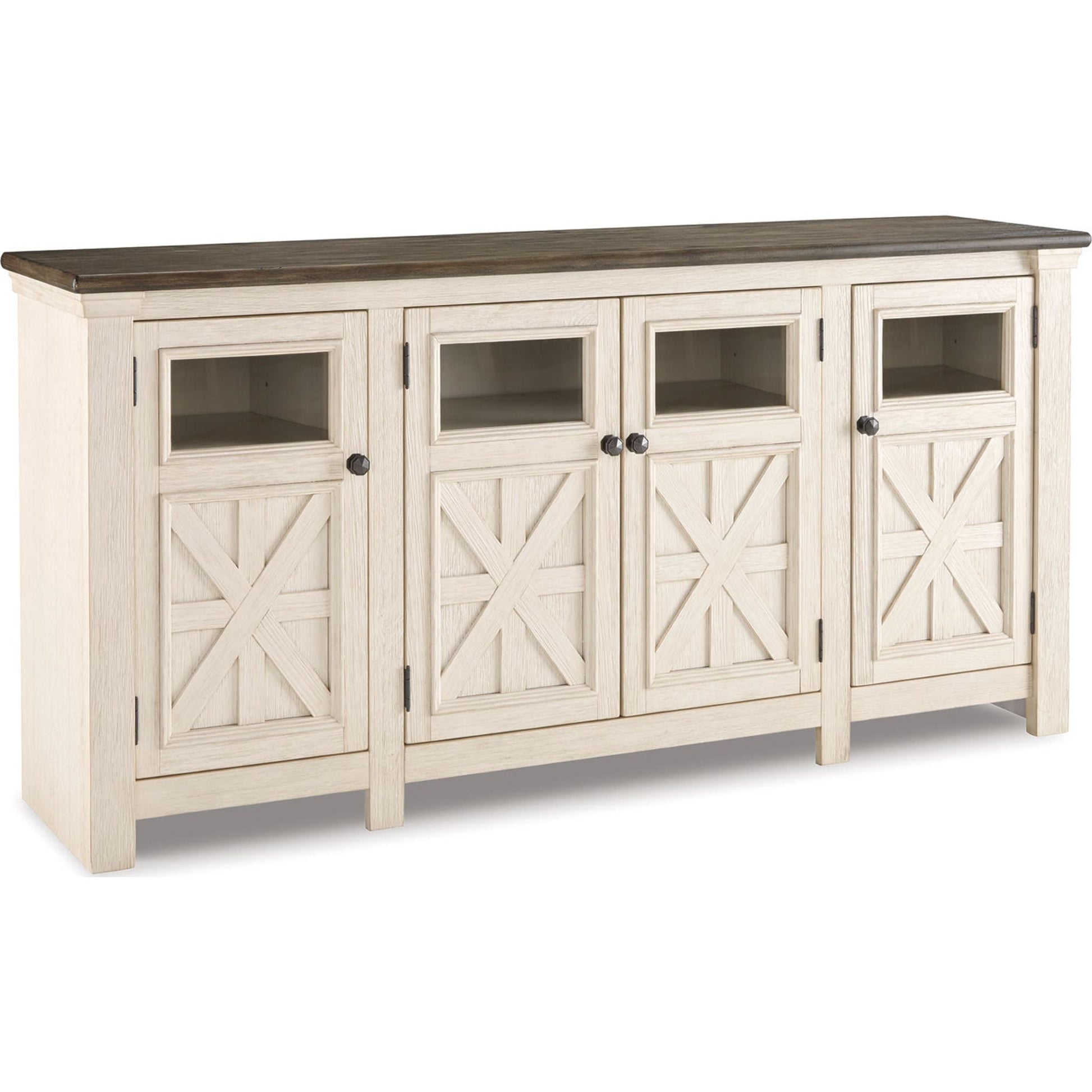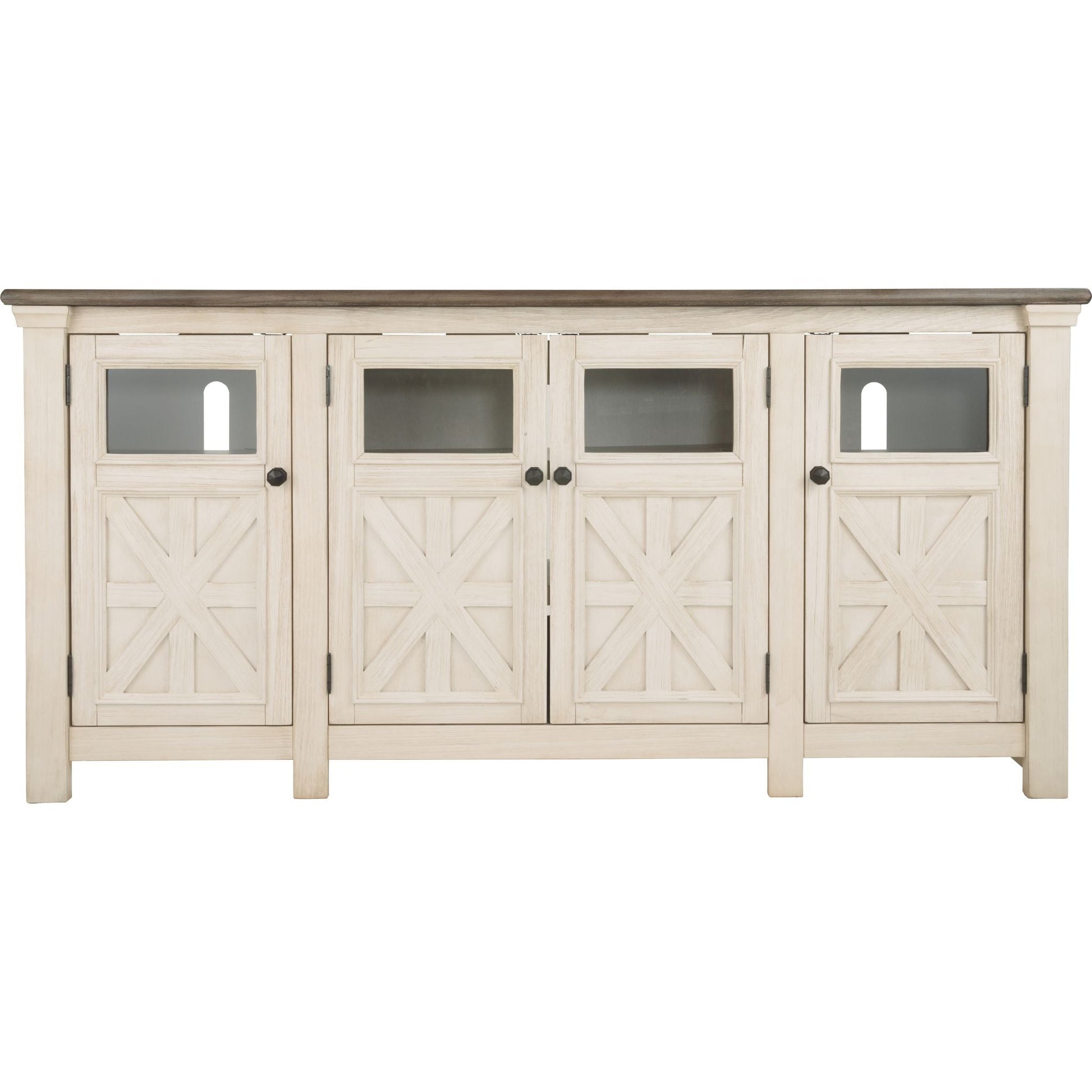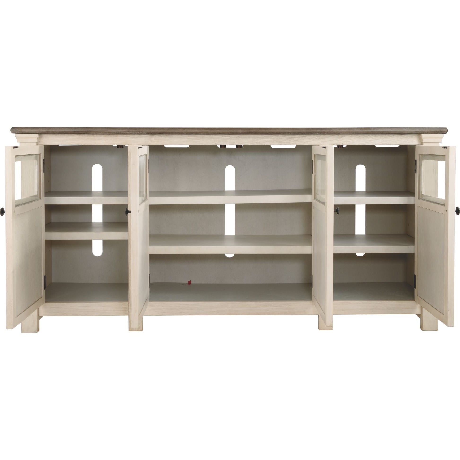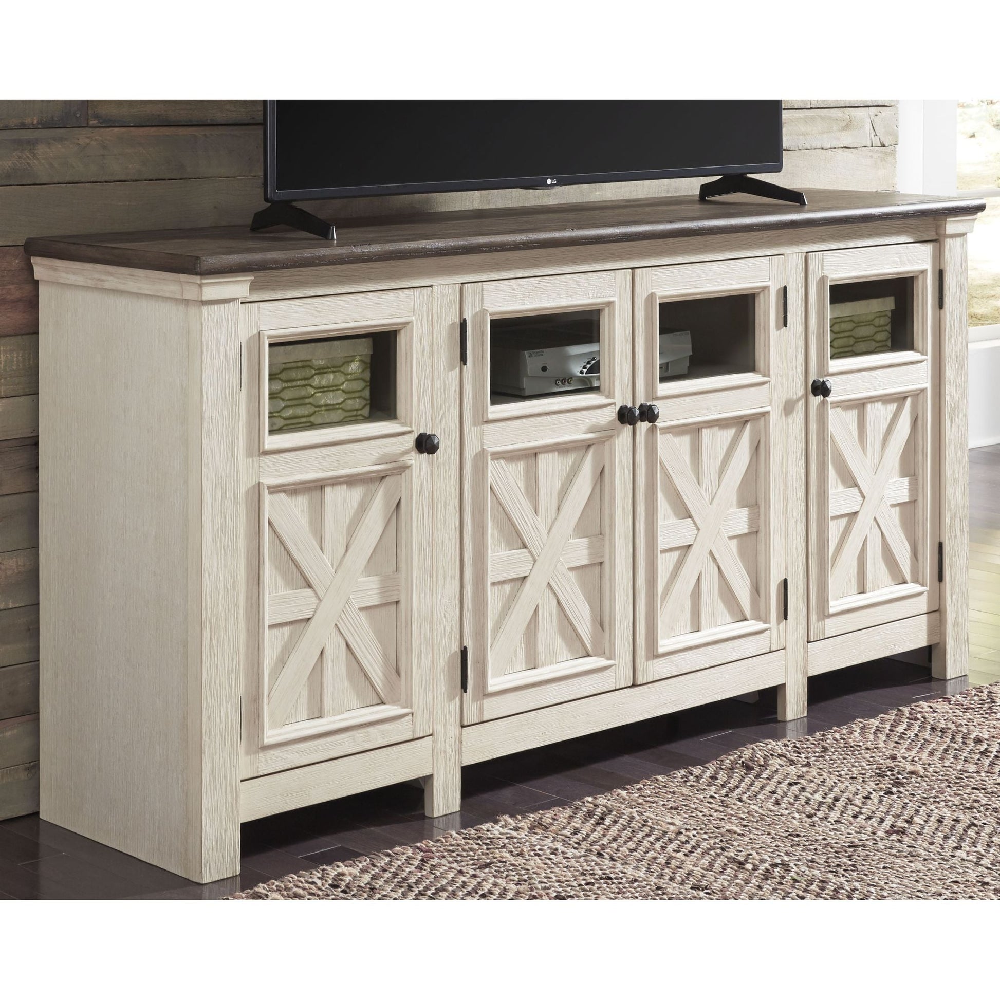 Que votre style soit rustique et authentique, shabby chic ou cottage champêtre, le meuble TV extra large Bolanburg s'intégrera parfaitement à votre intérieur. Sa finition bicolore légèrement patinée associe le chêne vieilli au blanc antique pour un charme authentique. Parmi ses détails raffinés, on retrouve des placards ornés de croisillons et d'incrustations de verre qui laissent entrevoir le contenu. De nombreuses étagères réglables et des passe-câbles permettent d'accueillir confortablement tous vos appareils multimédias.