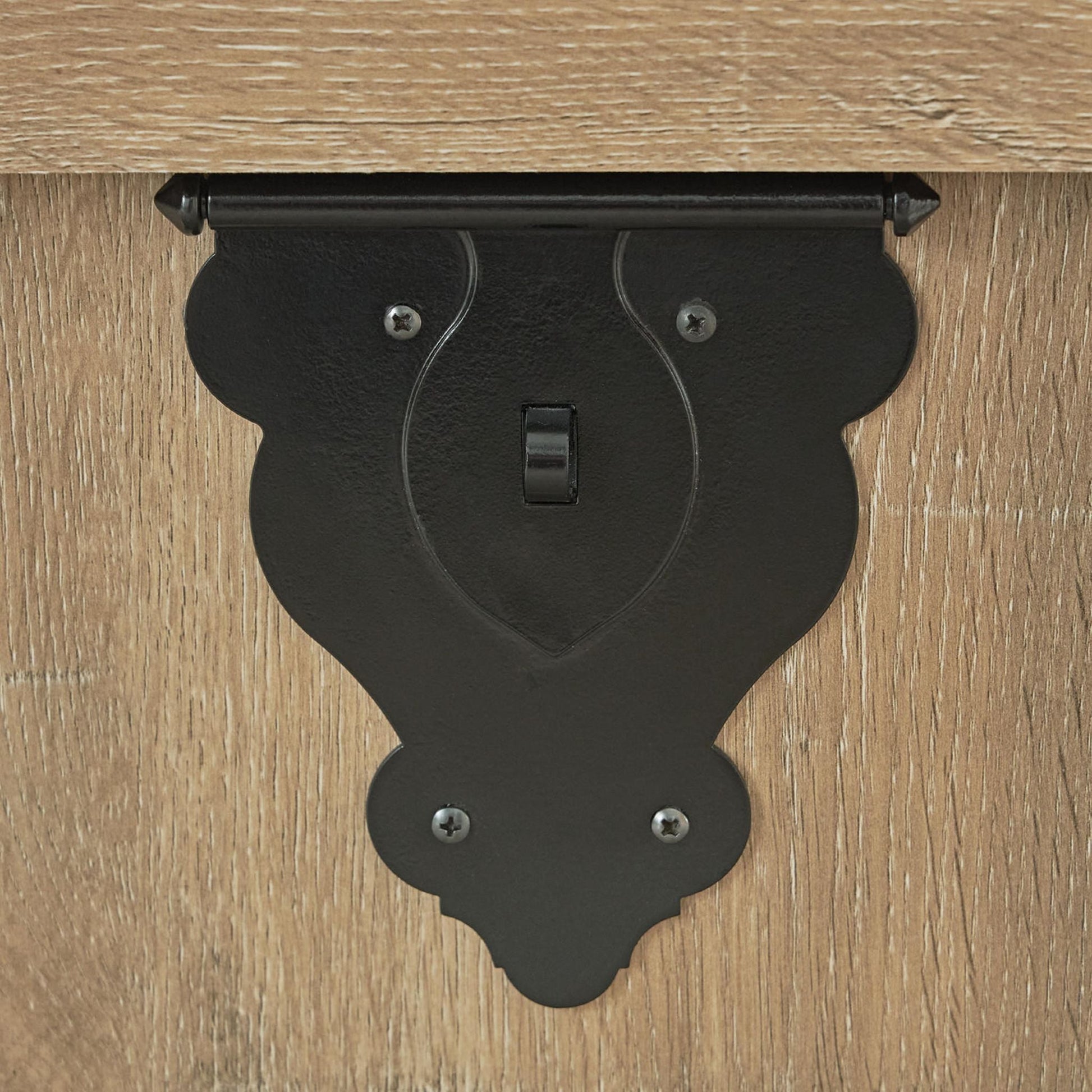 Cette table basse revisite le style d'antan avec une élégance décontractée et moderne. Son grain de chêne naturel reproduit est chaleureux et accueillant, tandis que les accents métalliques lui confèrent une touche rustique et un mélange de matières. Ce meuble luxueux et décontracté est sublimé par son plateau relevable, offrant un espace pratique pour travailler en journée ou grignoter lors d'une soirée cinéma.