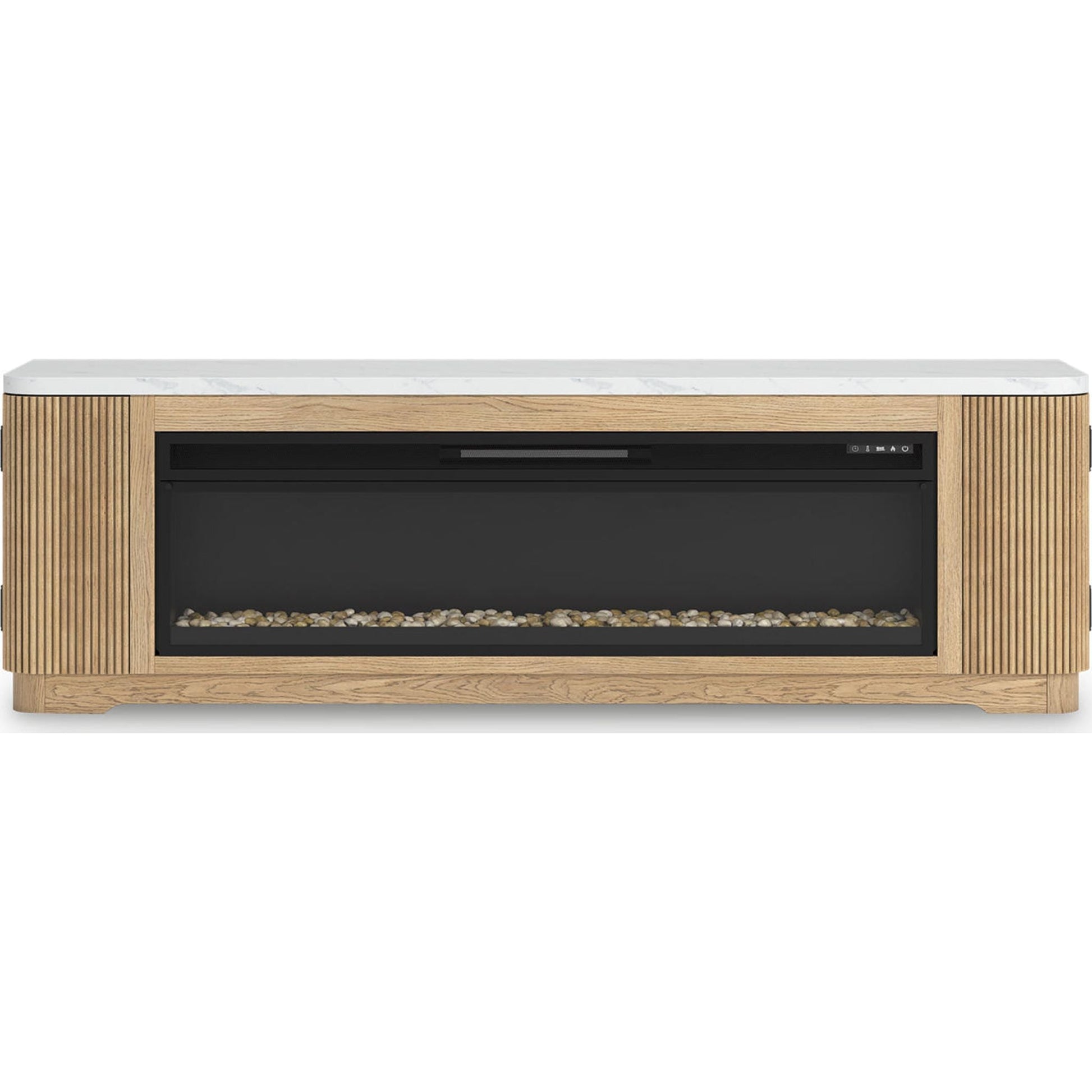 L'élégance rencontre le charme rustique dans le meuble TV Camdill avec cheminée électrique. Envie d'un salon contemporain ? Son plateau en faux marbre s'harmonise parfaitement avec son piètement cannelé pour une touche tendance au quotidien. Étagères ouvertes et placards de rangement discrètement intégrés facilitent le rangement et la mise en valeur de vos appareils multimédias avec style. Pour un confort visuel optimal, le large insert de cheminée vous offre l'ambiance chaleureuse d'un vrai feu de bois, sans les inconvénients. D'une simple pression sur un bouton, réglez la température et les couleurs changeantes des flammes, et programmez la minuterie pour un plaisir prolongé. Livré avec des cristaux de verre et des pierres naturelles, il vous permet de personnaliser l'aspect du lit de flammes.