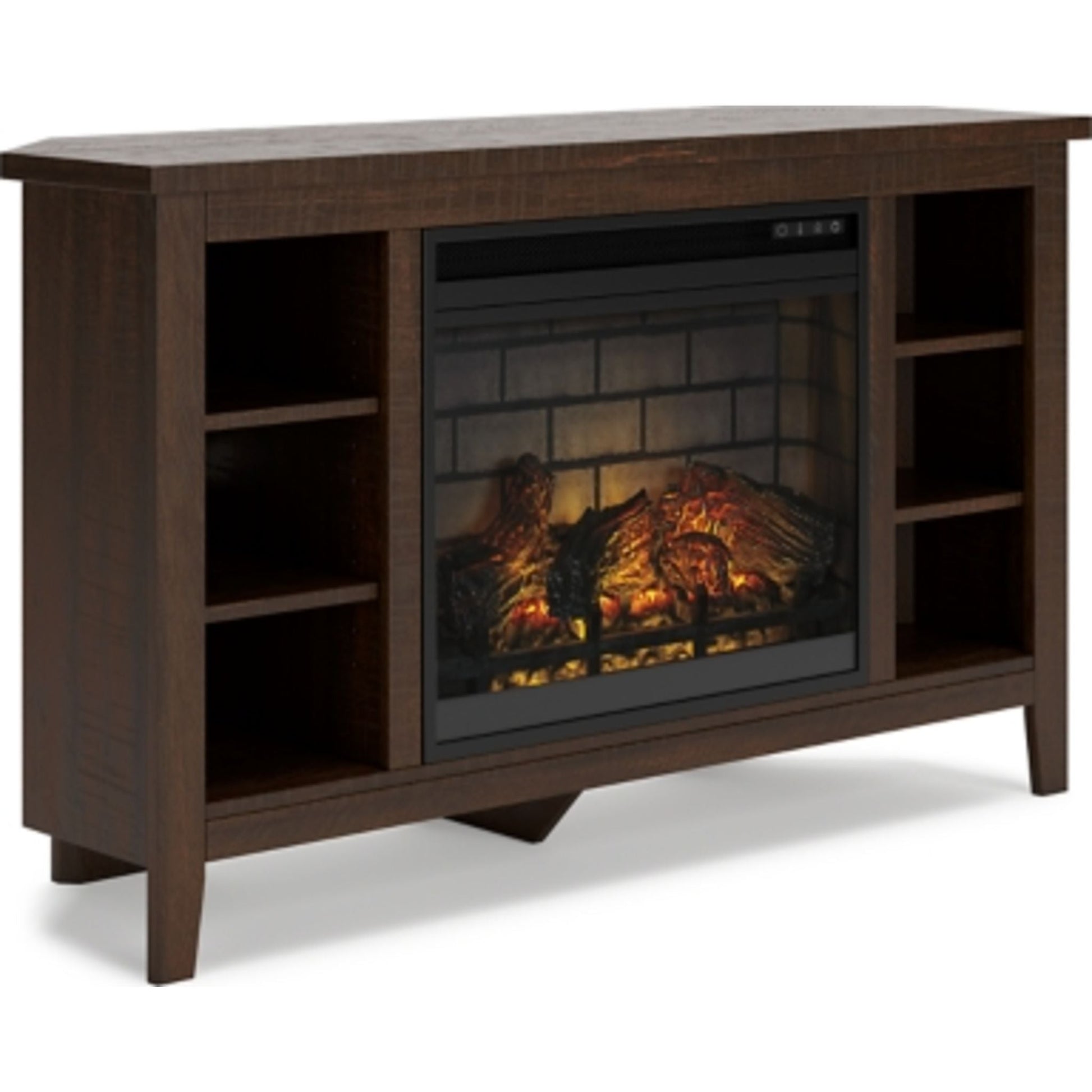Avec son grain de bois rustique couleur terre d'ombre brûlée et son charme minimaliste, le meuble TV d'angle Camiburg s'accorde parfaitement à votre style décontracté et raffiné. Ses formes élégantes lui permettent de s'intégrer harmonieusement dans n'importe quel coin. Son design ouvert et flexible, ainsi que ses découpes pour la gestion des câbles, soulignent son esthétique épurée. Le petit plus qui fait toute la différence : une cheminée électrique encastrée avec un entourage en fausses briques réfractaires, fonctionnant avec ou sans chauffage infrarouge. Cette cheminée propose plusieurs types de flammes, sept niveaux de température, cinq niveaux de luminosité et un effet de braises incandescentes à LED.