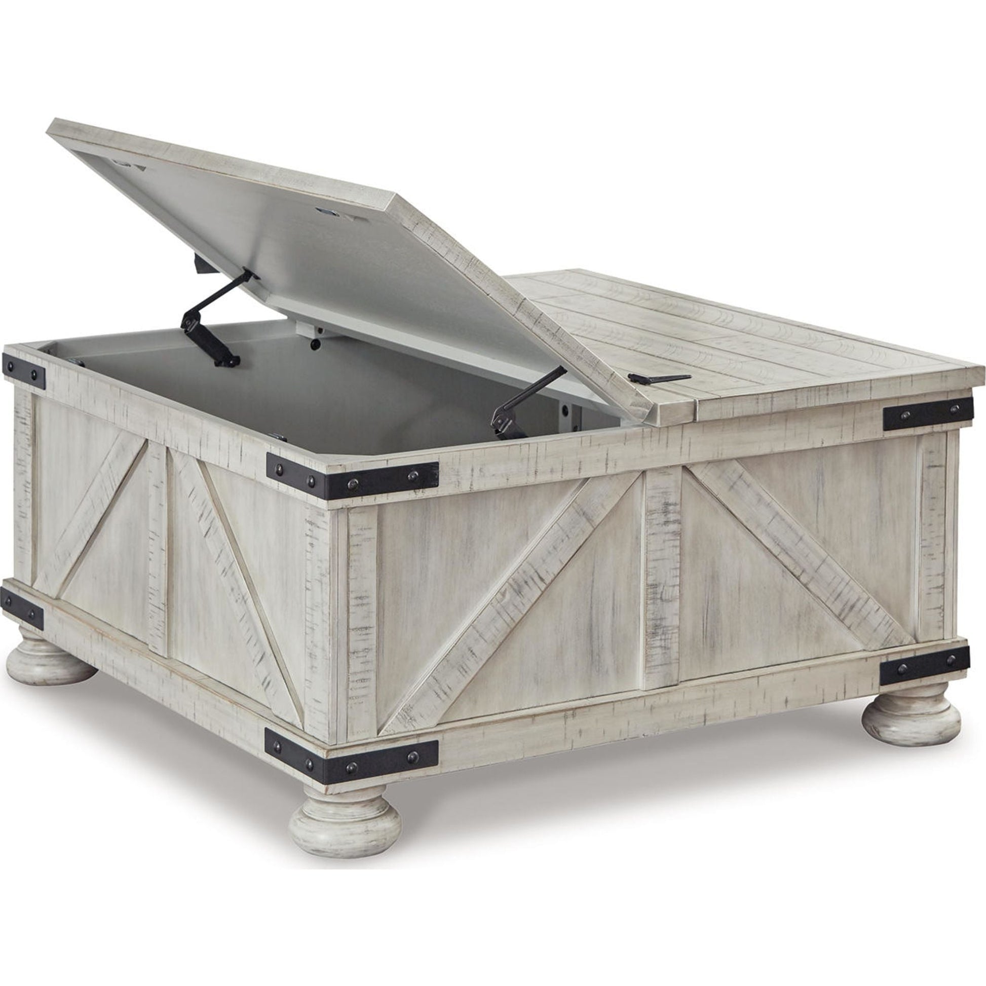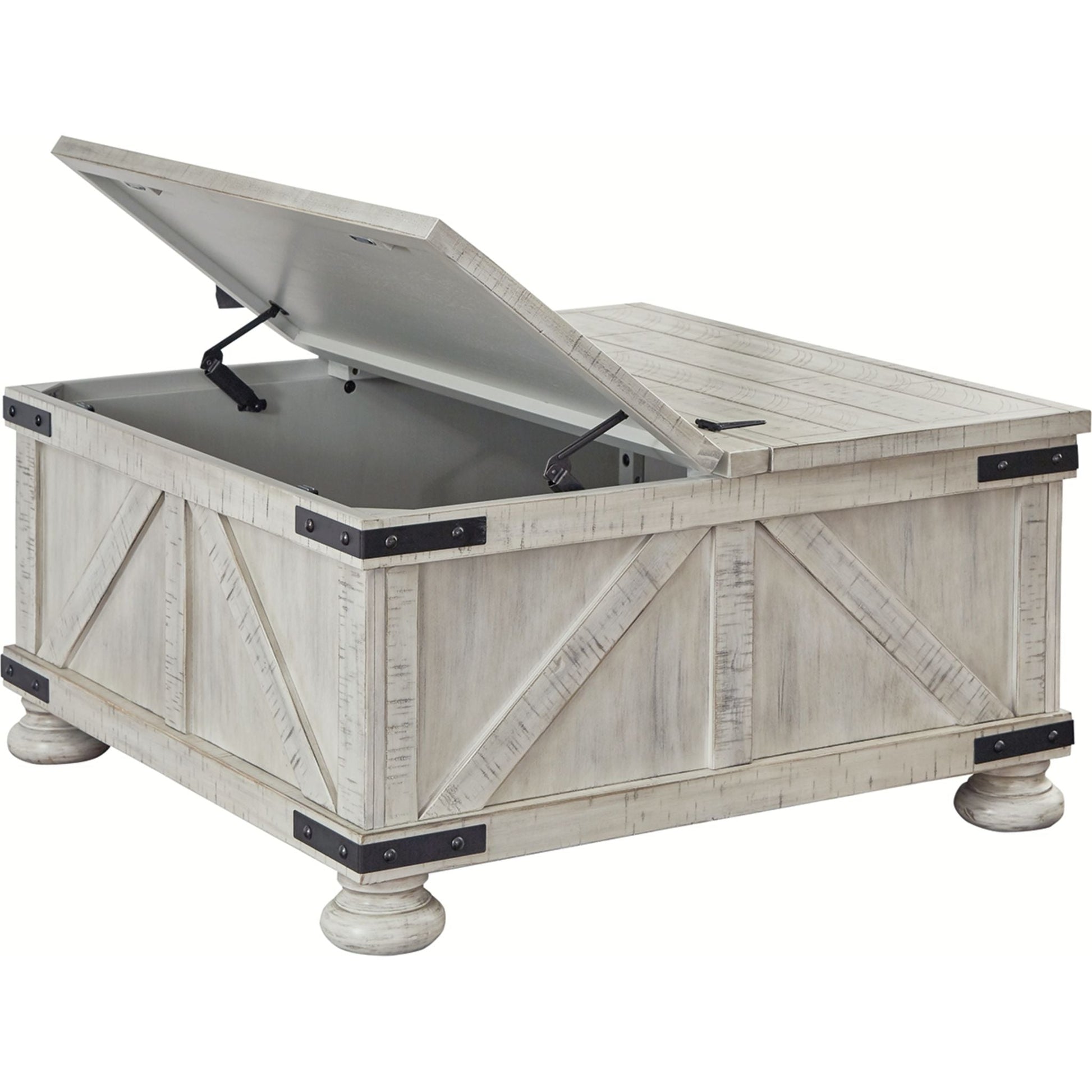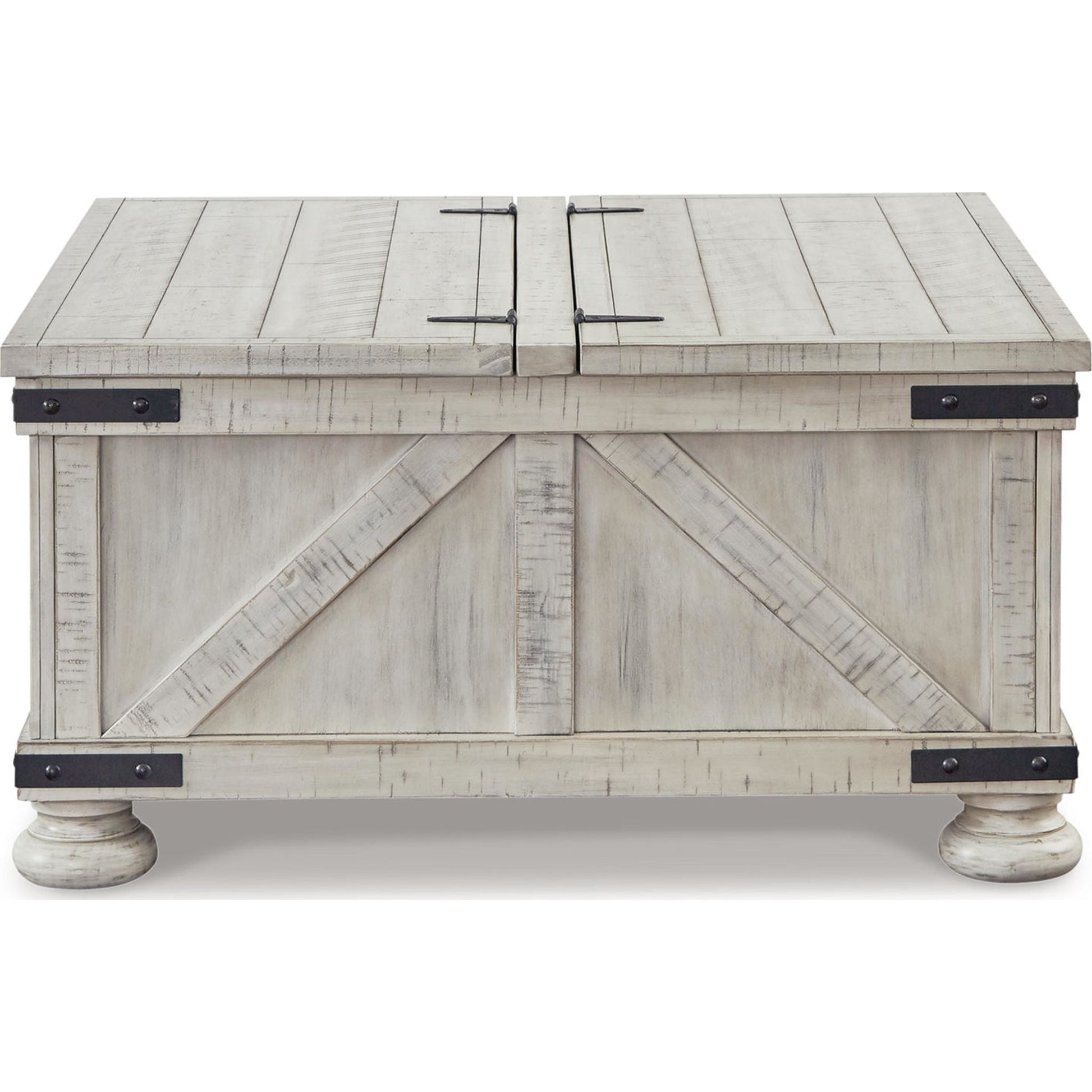 Alliez esthétique et fonctionnalité avec la table basse carrée Carynhurst dotée d'un espace de rangement. Son plateau à double couvercle offre un accès facile à un vaste espace de rangement. Avec sa finition blanchie à l'ancienne, ses détails en croisillons et ses appliques en métal, cette table basse aux dimensions généreuses incarne à merveille le charme rustique d'une maison de campagne.