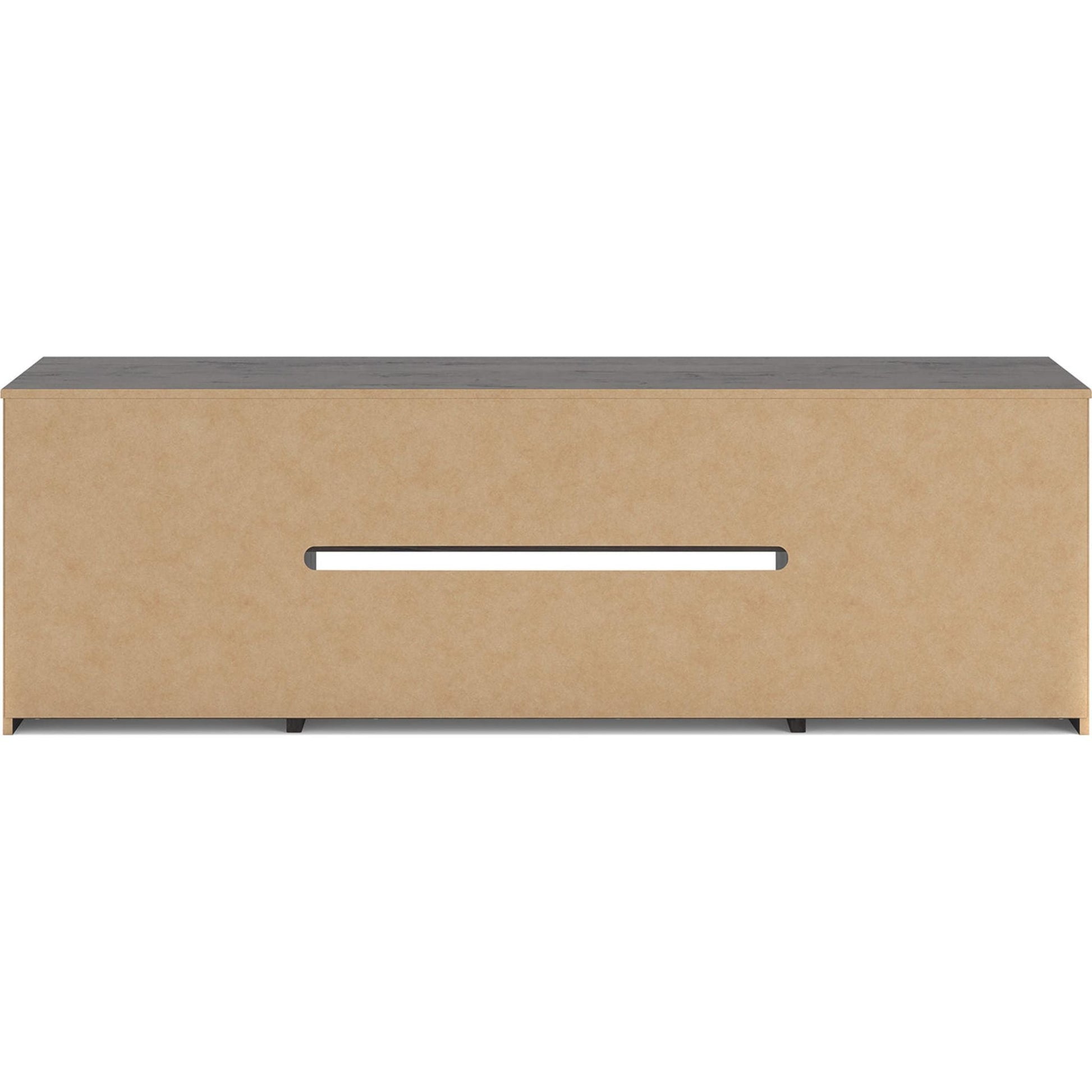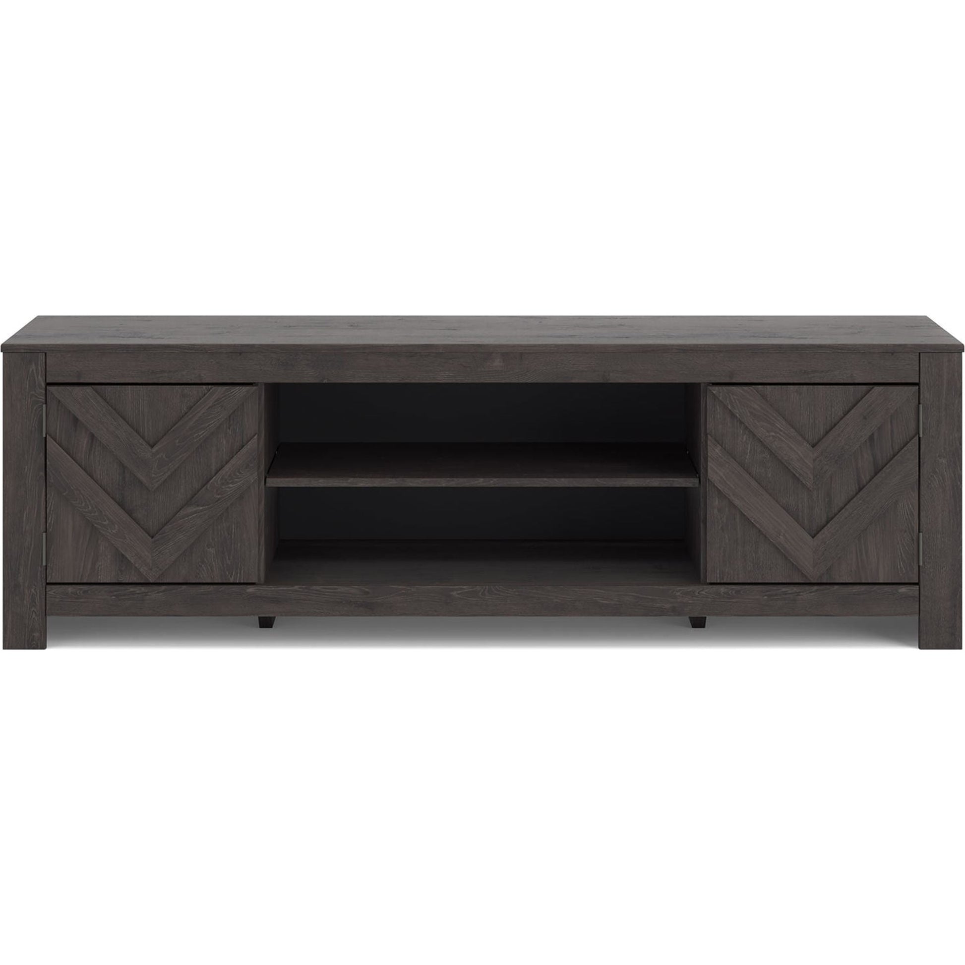 Le meuble TV Cayboni revisite un style classique et charmant pour l'adapter à la vie moderne. Sa finition anthracite foncé séduira les amateurs de charme vintage, tandis que son élégant motif à chevrons est résolument tendance. Et grâce aux rangements dissimulés derrière les portes, vos accessoires multimédias resteront à l'abri avec style.
