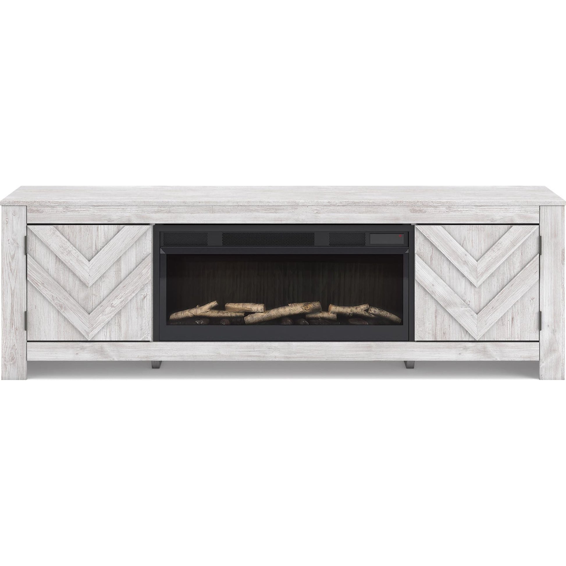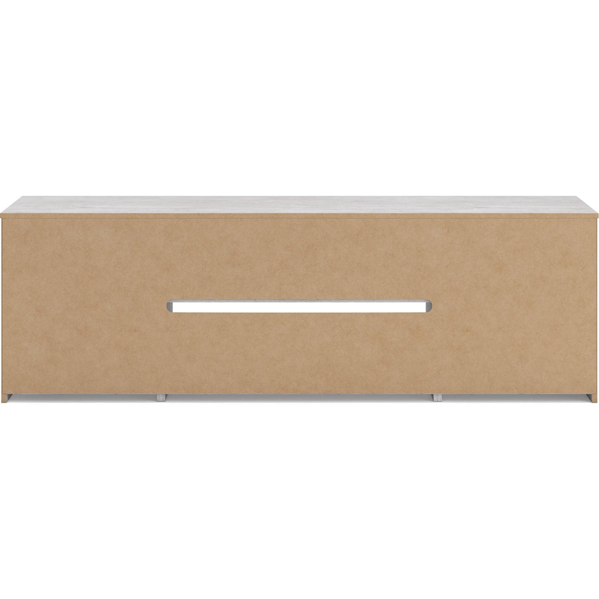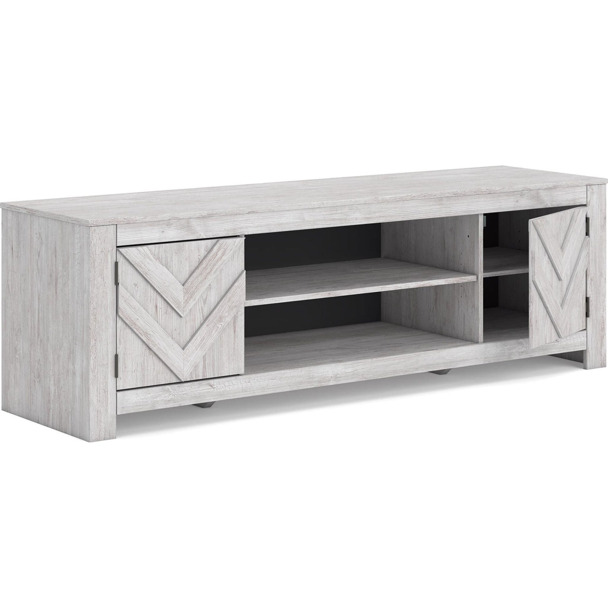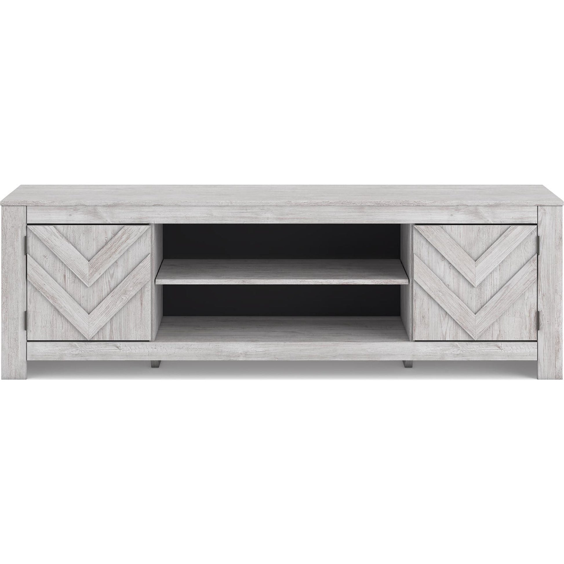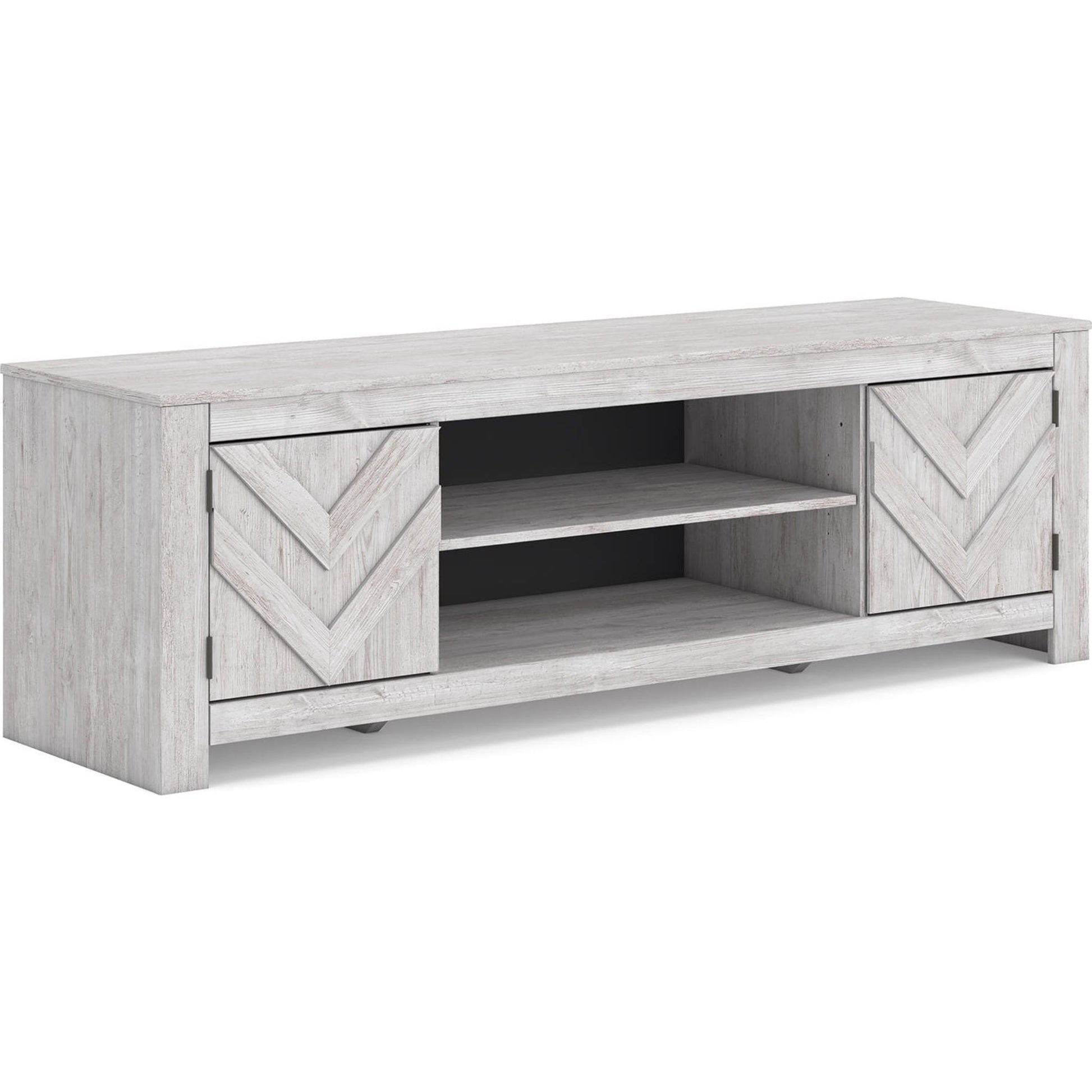 Le meuble TV Cayboni revisite le charme classique pour l'adapter à la vie moderne. Sa peinture effet blanchi séduit par son cachet vintage, tandis que son élégant motif à chevrons est résolument tendance. Et grâce aux rangements dissimulés derrière les portes, vos appareils multimédias restent à l'abri avec style.
