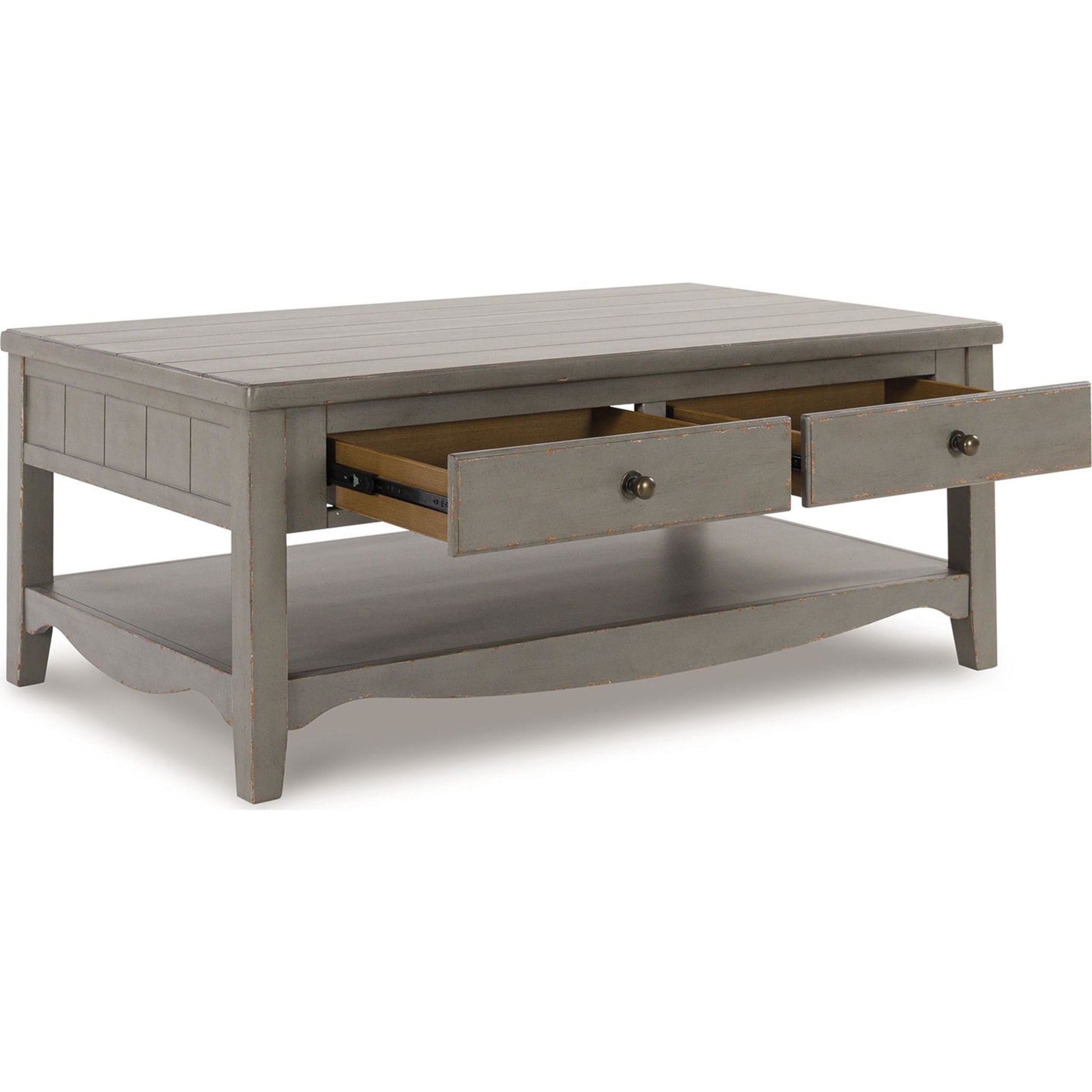 Affichez votre amour pour le style campagnard européen. Avec sa finition gris vieilli à l'effet écaillé pour un authentique look vintage, la table basse Charina regorge de caractère. Deux tiroirs et une étagère ouverte offrent un espace de rangement pratique et un accès facile à vos livres, boissons et autres objets.
