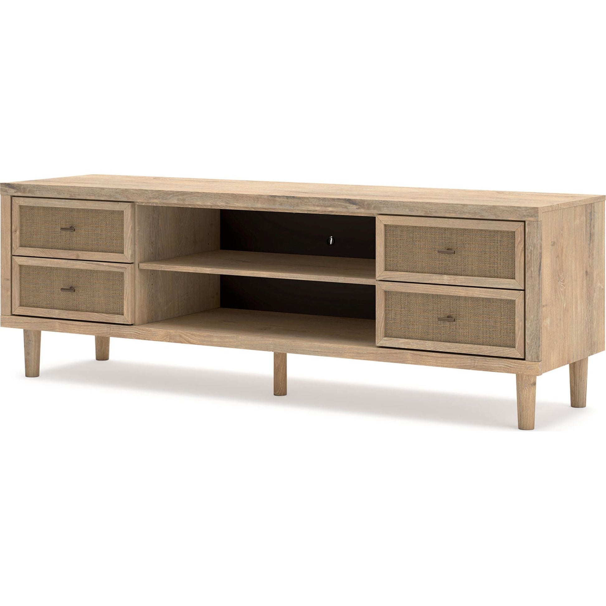 Avec ses lignes épurées et son style contemporain, loin d'être austère, le meuble TV Cielden insuffle une fraîcheur nouvelle à votre salon. Associant une finition claire à un veinage chêne imité et à des détails en rotin beige texturé, ses matériaux mixtes confèrent une ambiance naturellement polyvalente à votre espace préféré pour regarder vos séries préférées ou jouer aux jeux vidéo. La quincaillerie élégante et discrète s'harmonise parfaitement avec l'esthétique moderne. Et préparez-vous à être surpris par les nombreuses possibilités de rangement offertes par les tiroirs spacieux et les étagères ouvertes.