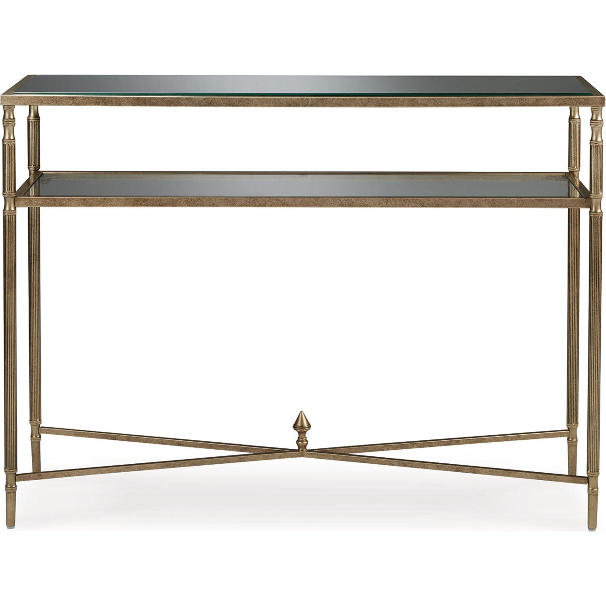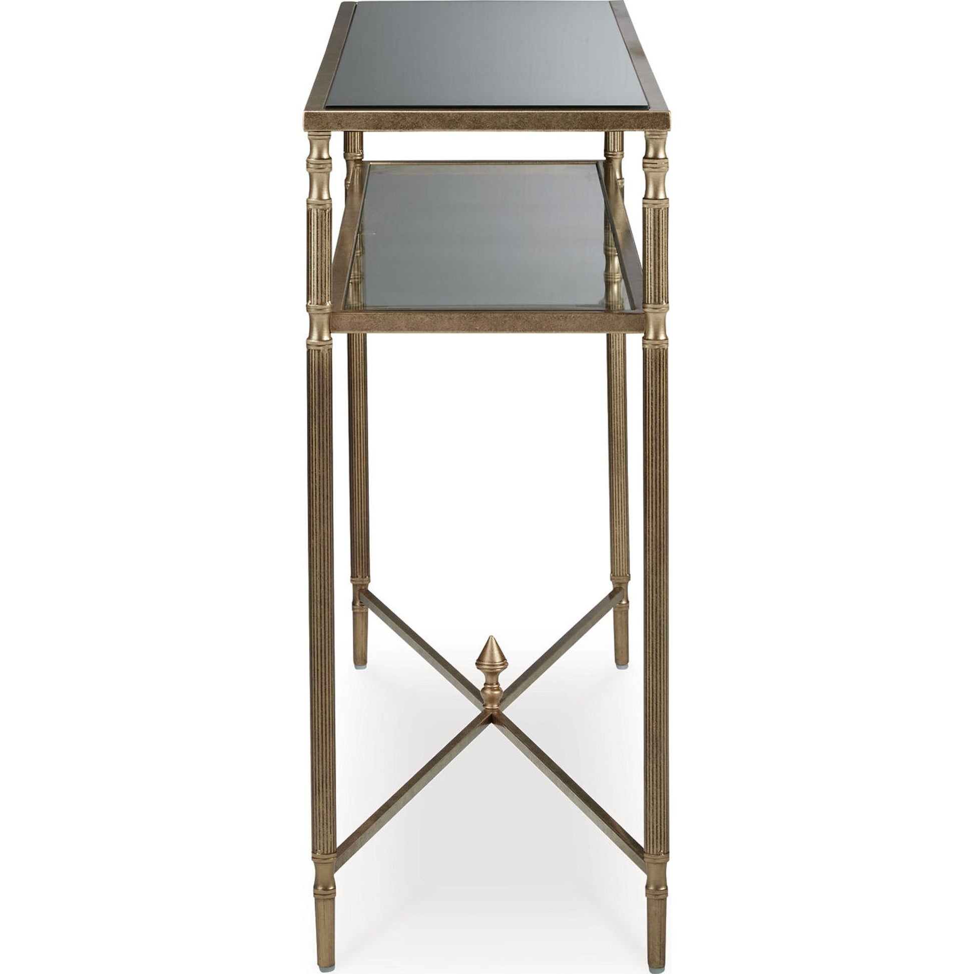 La console Cloverty insuffle une modernité remarquable au design traditionnel. Ses détails, tels que ses pieds ornés et son entretoise surmontée d'un fleuron décoratif central, sont des classiques intemporels. Sa teinte or vieilli incarne une élégance décontractée. Une étagère sous-jacente allie style, robustesse et fonctionnalité.