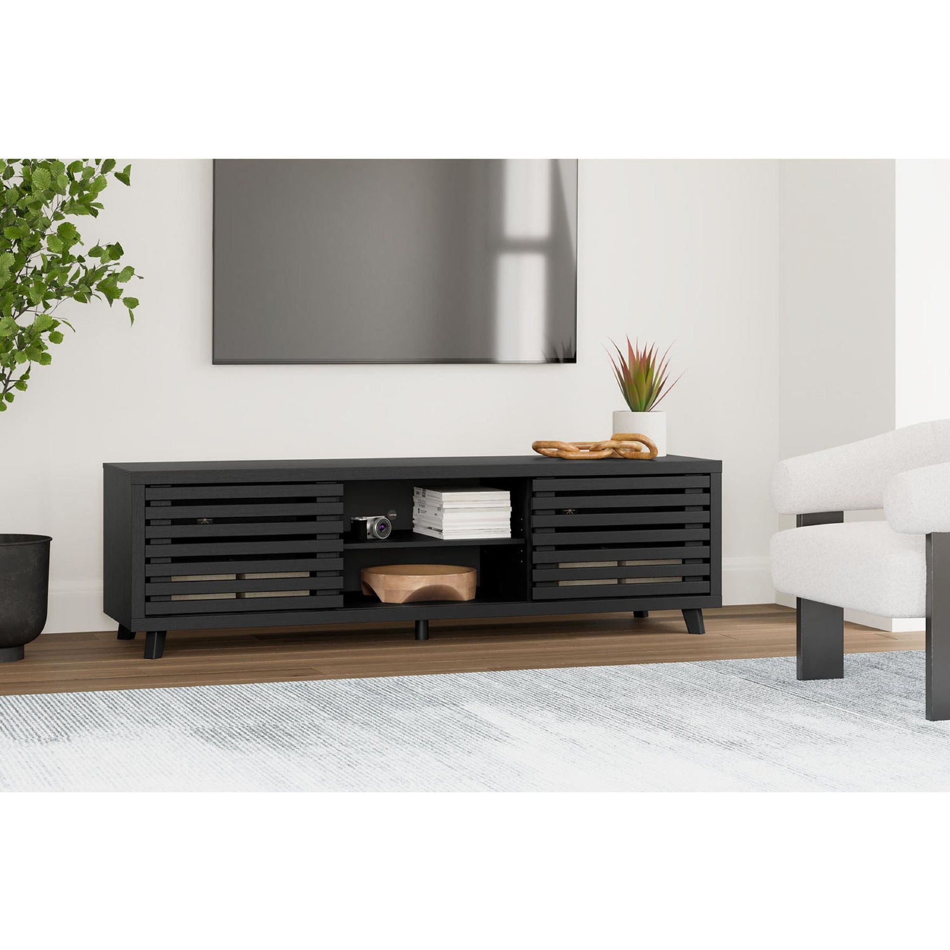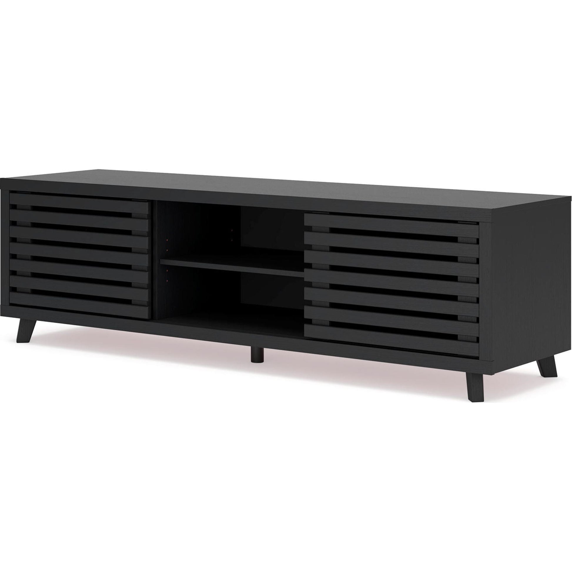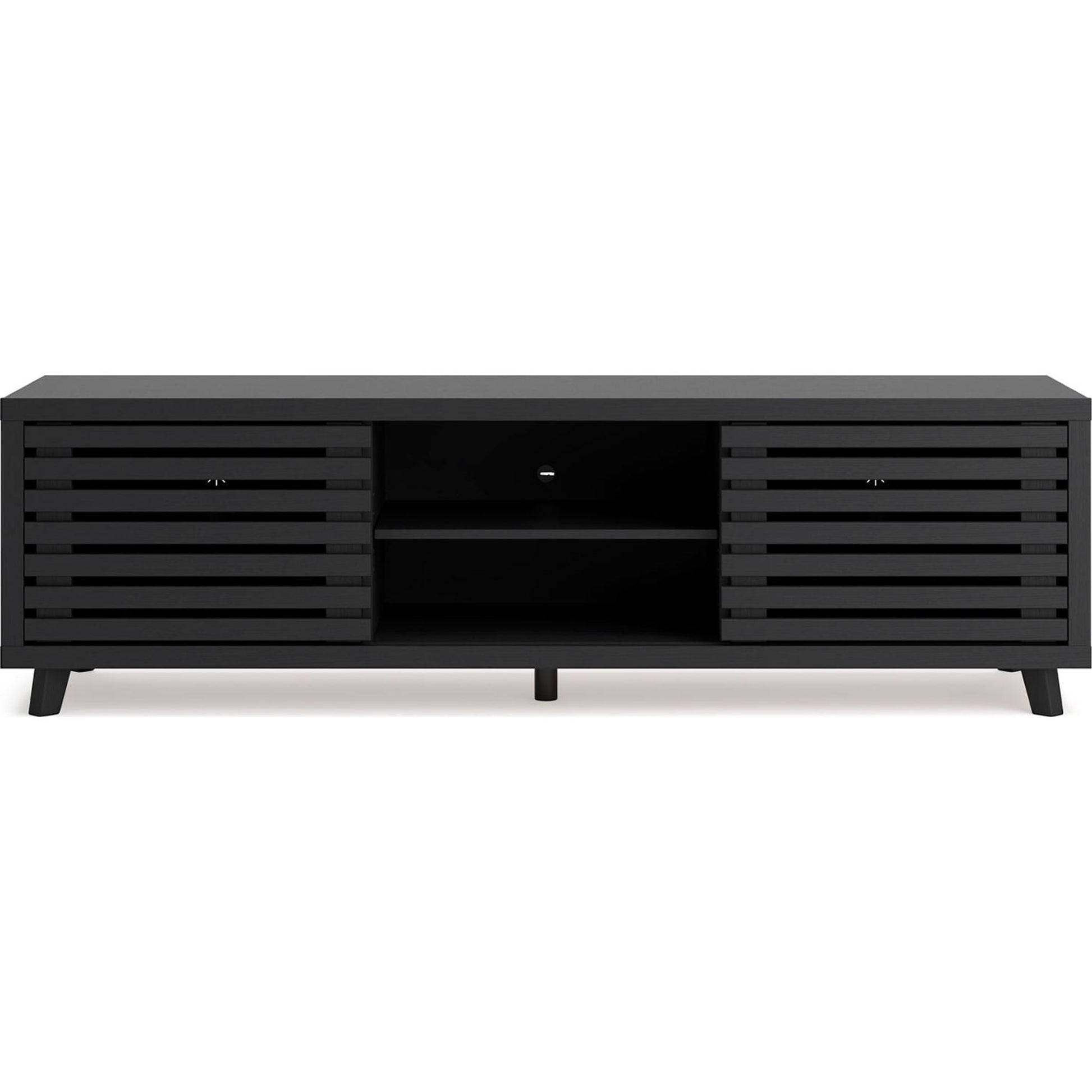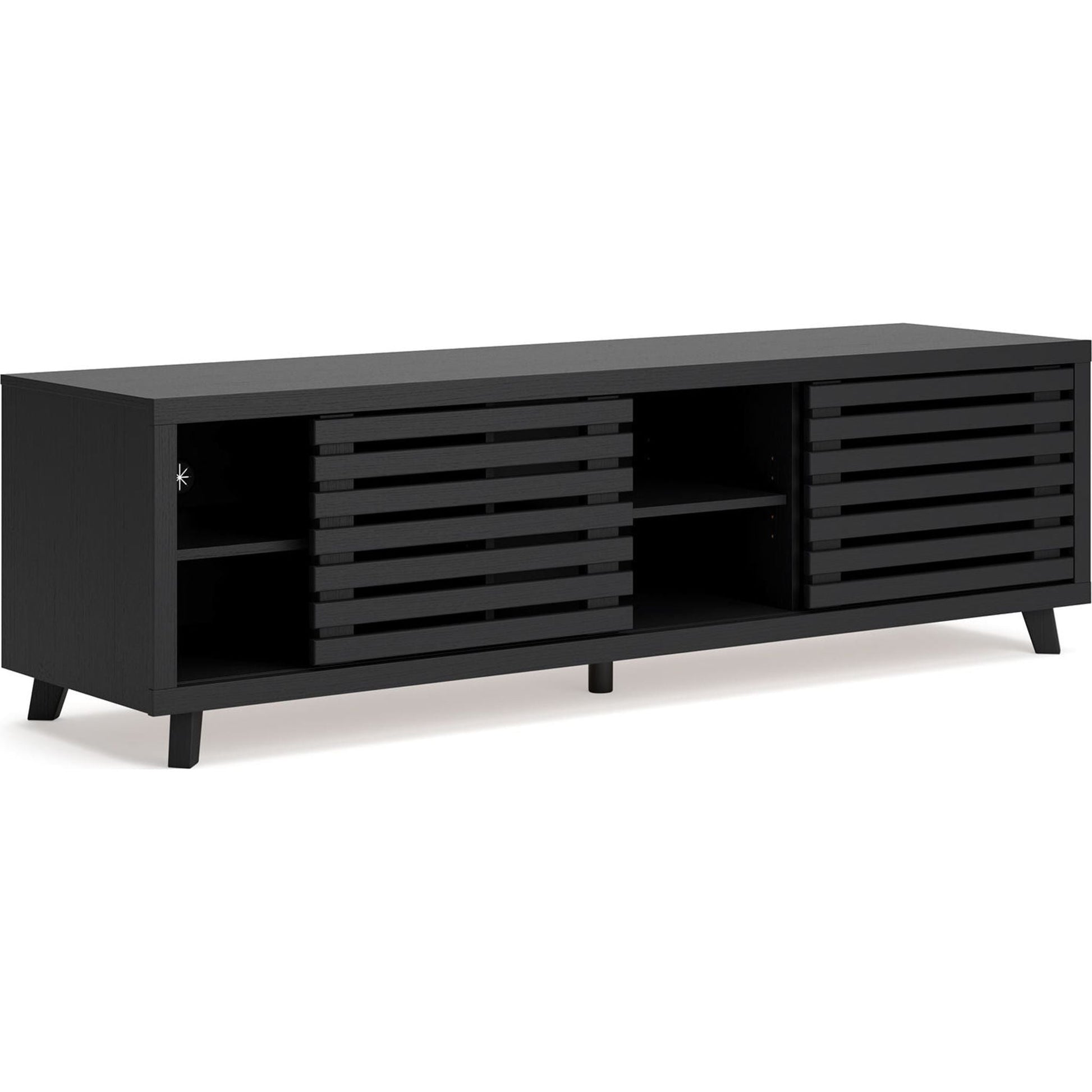 Sublimez votre intérieur avec le meuble TV Danziar. Son subtil veinage de bois et sa finition noire mate tendance s'harmonisent parfaitement avec un design épuré. Deux portes coulissantes dissimulent des étagères réglables supplémentaires, idéales pour ranger vos consoles, DVD et jeux vidéo.
