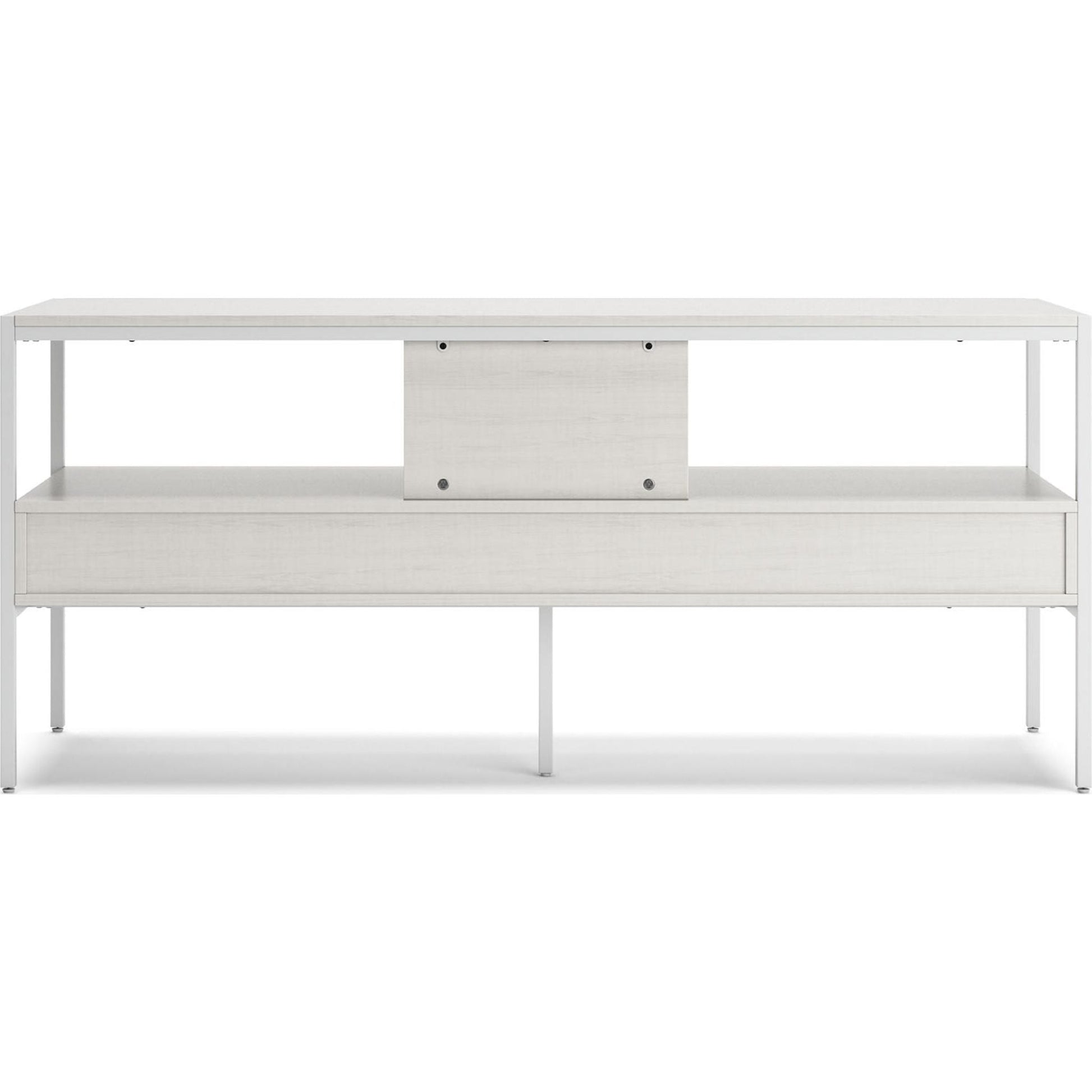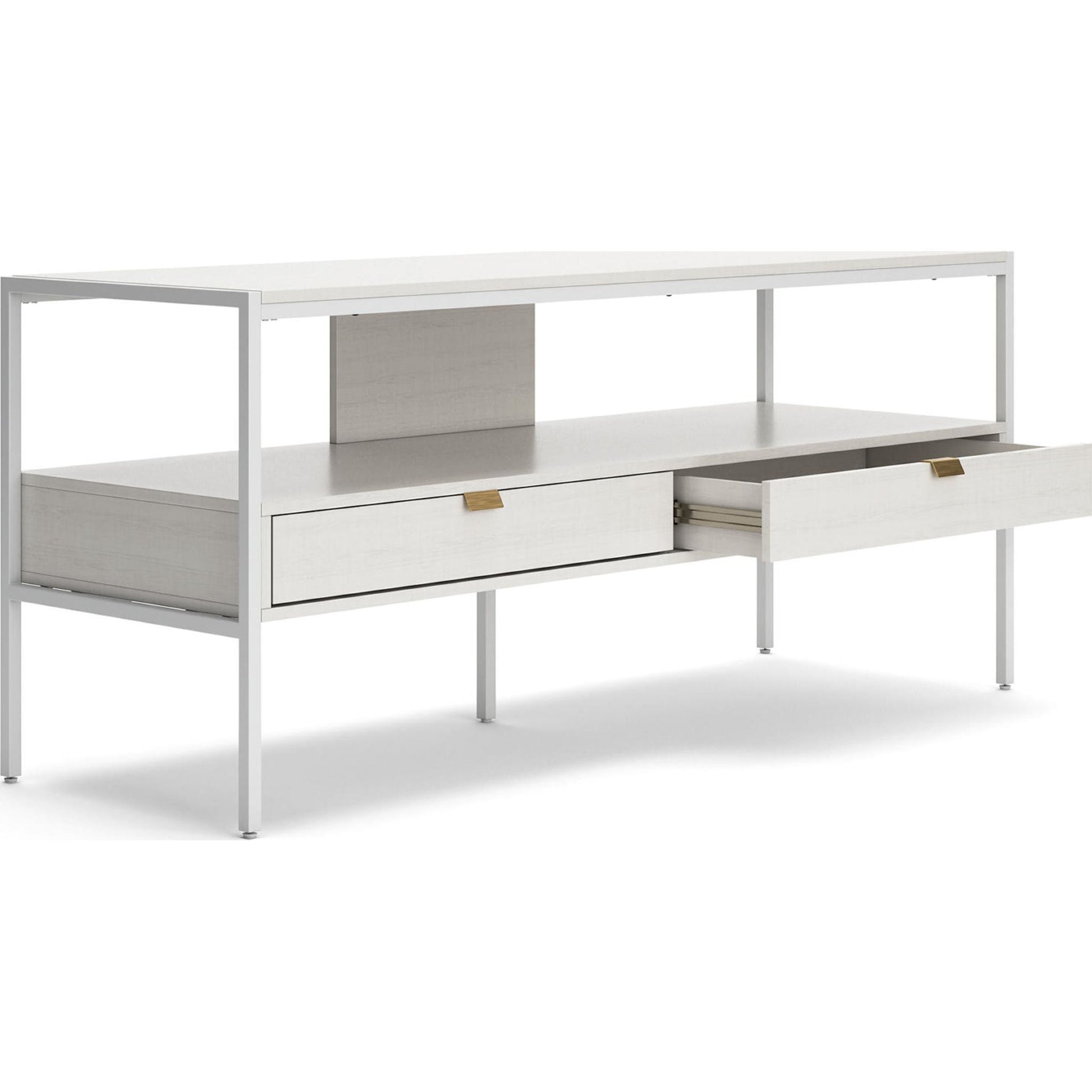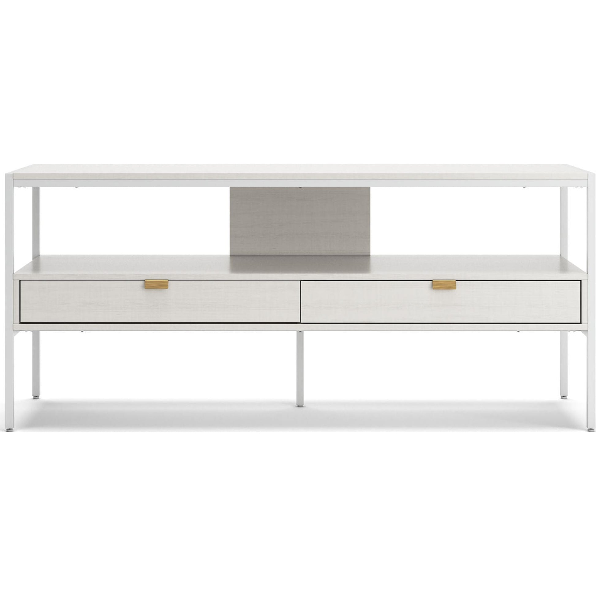 Donnez vie à votre vision d'un salon moderne avec le meuble TV Deznee au design épuré. Sa structure linéaire et sa finition blanche lui confèrent une allure minimaliste. Une étagère ouverte et deux tiroirs vous permettent de ranger vos affaires avec simplicité et élégance, complétant ainsi ce meuble polyvalent et remarquable.