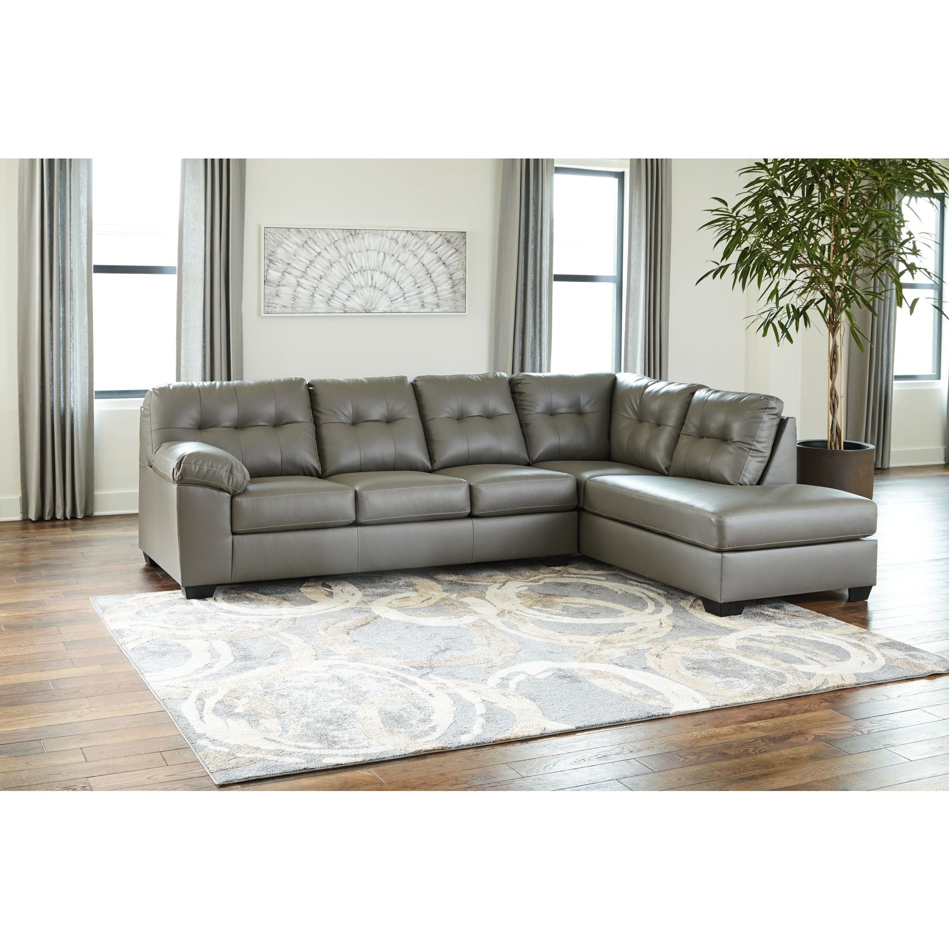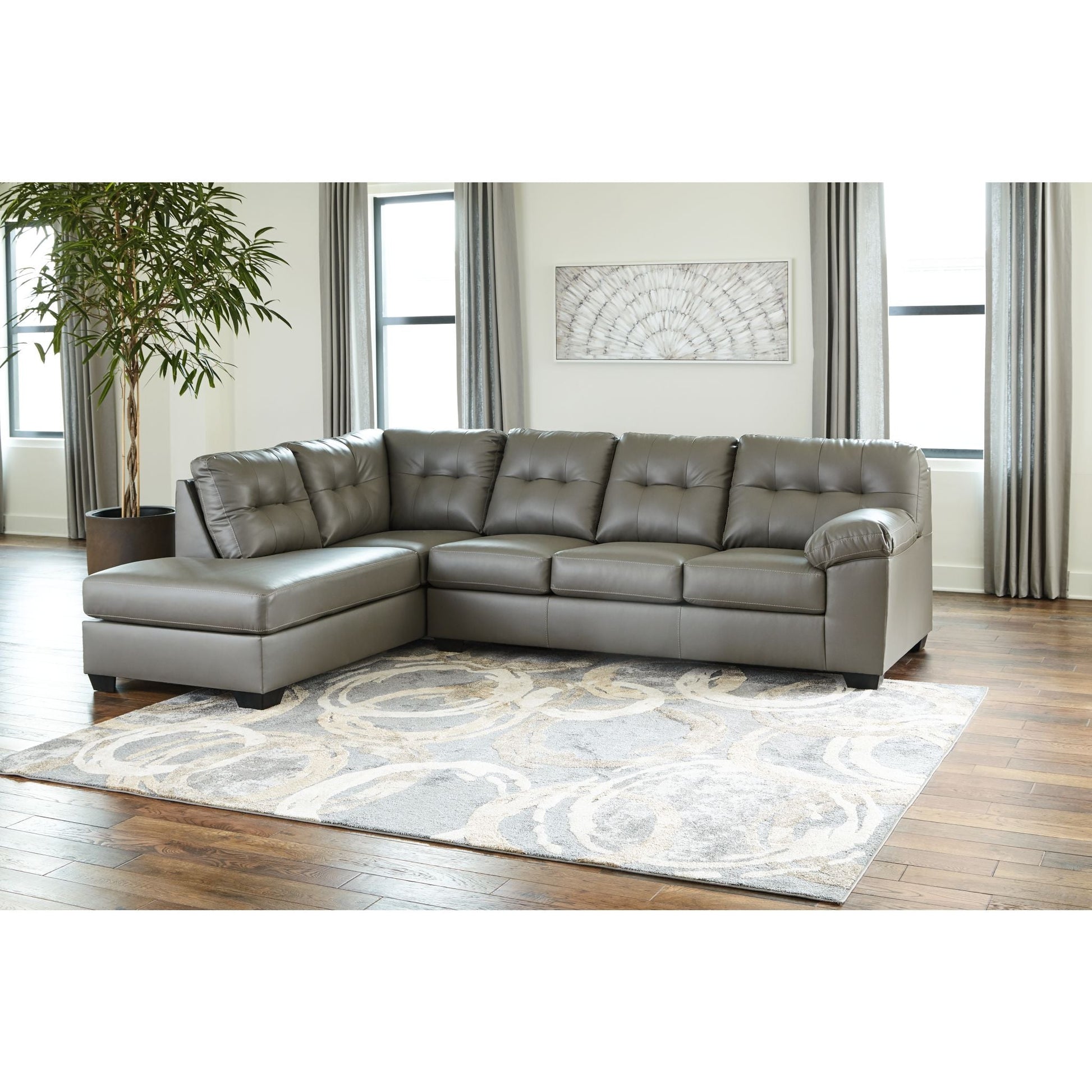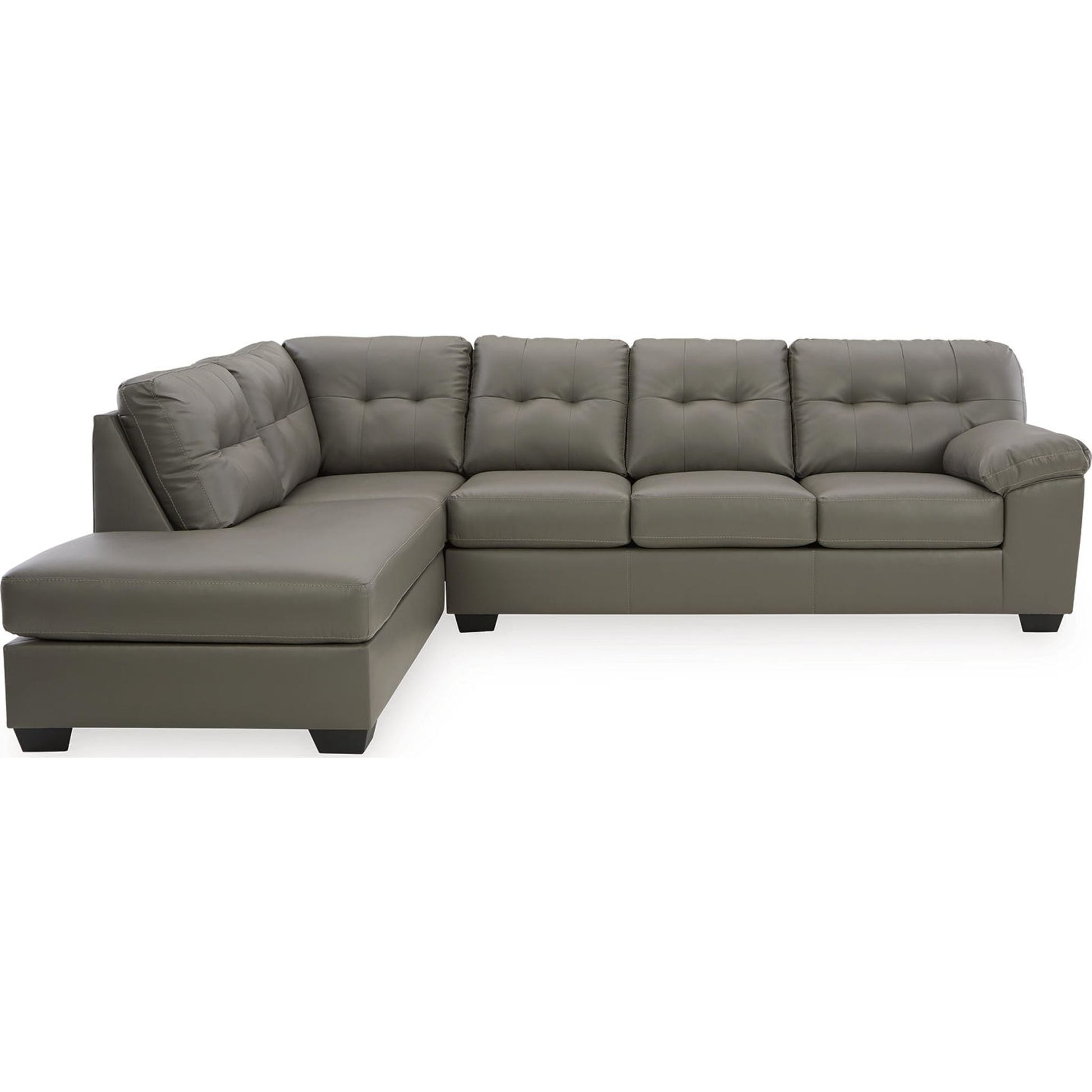 Revêtu d'un magnifique similicuir gris, le canapé d'angle Donlen ne manquera pas d'attirer tous les regards. Avec son capitonnage raffiné, ses accoudoirs rembourrés et son design fuselé et élégant, ses dimensions généreuses vous permettent de partager l'espace en famille ou de recevoir des amis à l'improviste.