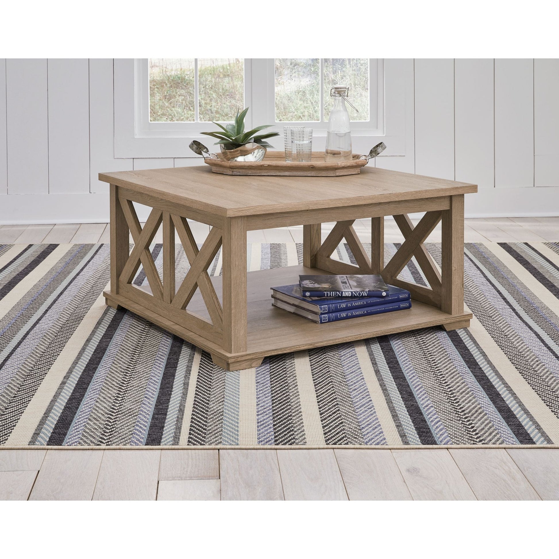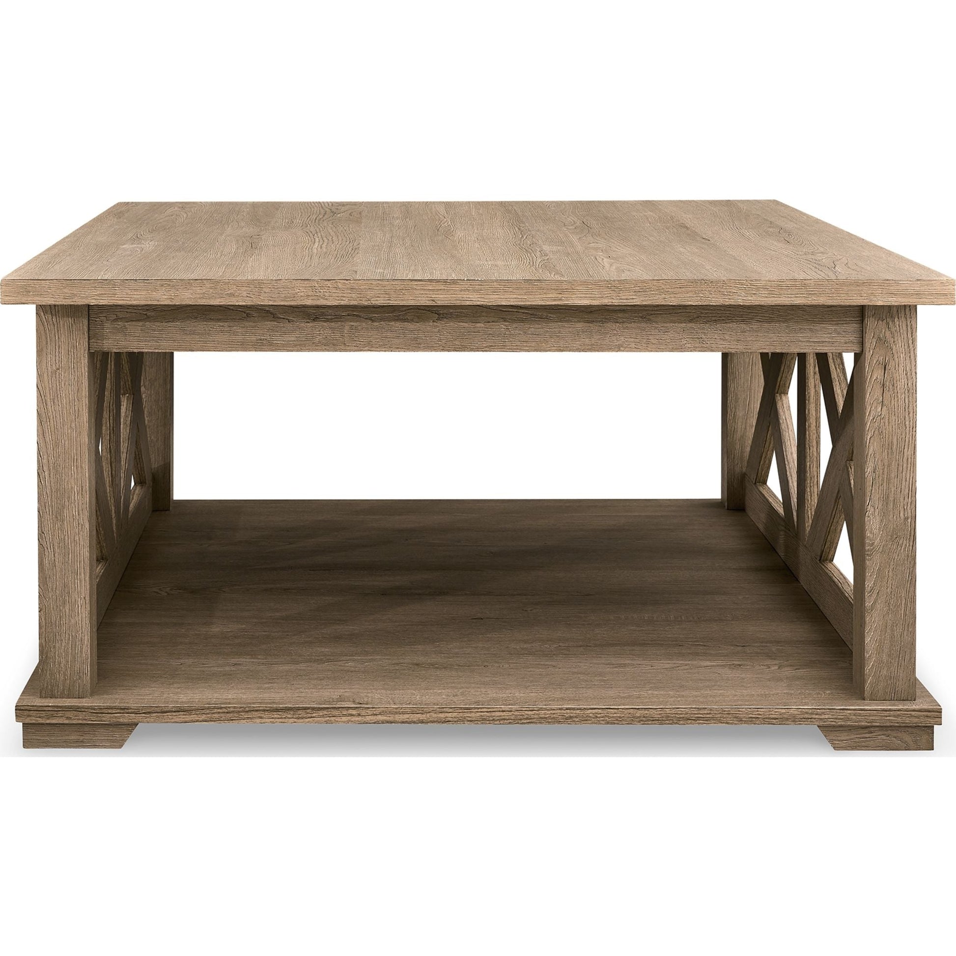 Adoptez un style champêtre moderne avec la table basse carrée classique Elmferd, ornée d'un veinage clair en chêne naturel. Son panneau latéral ajouré et sa large étagère inférieure ajoutent une touche rustique supplémentaire.
