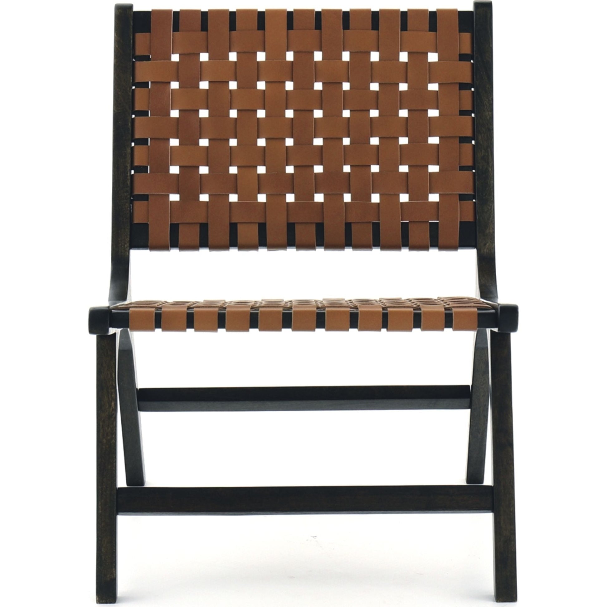 Tendance et d'un style incomparable, le fauteuil lounge Fayme, d'inspiration moderne du milieu du siècle, apportera une touche contemporaine à votre intérieur. Il est doté d'une structure sans accoudoirs en bois massif finition brun foncé, avec un dossier et une assise en lanières de cuir tressé couleur camel.