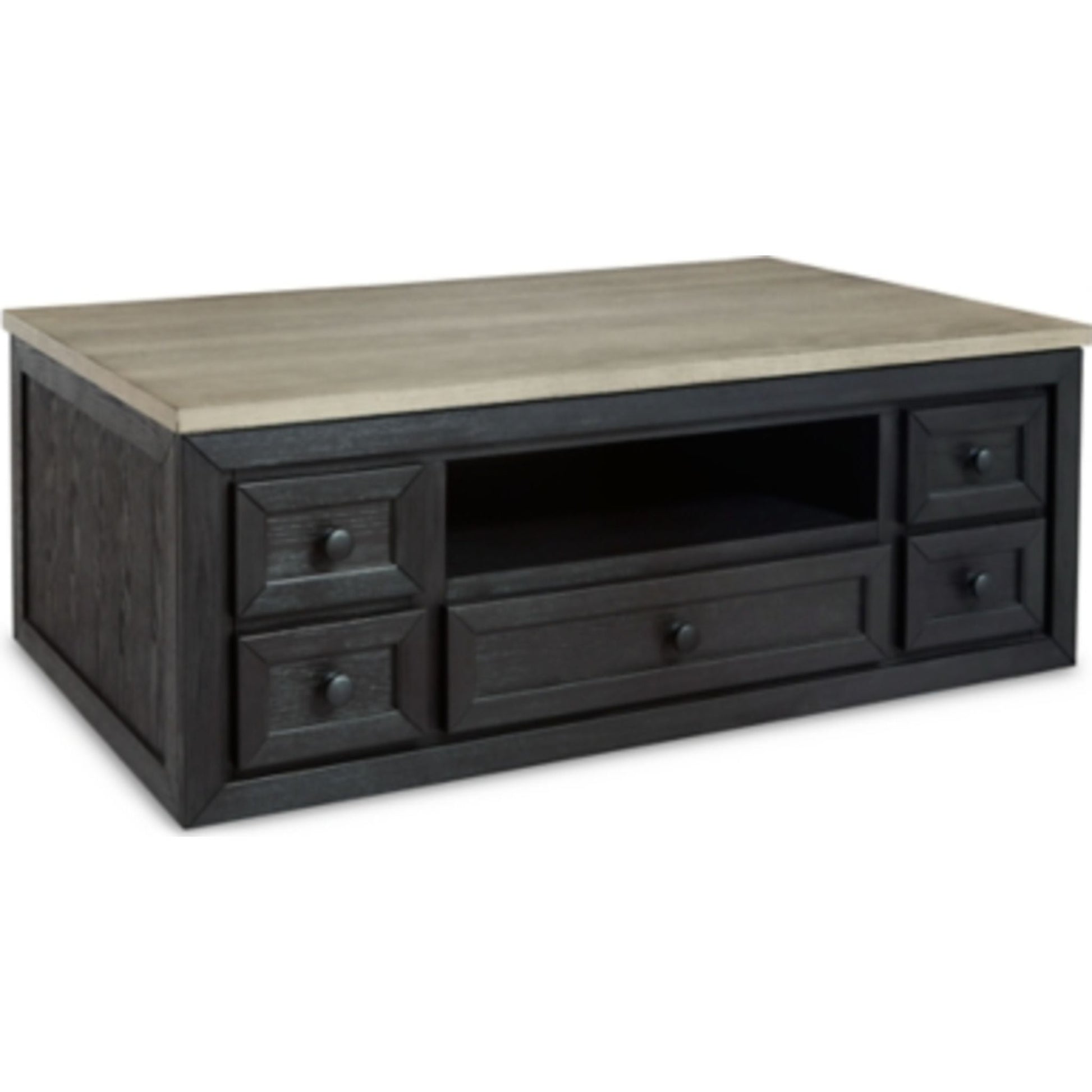 Apportez une touche d'élégance et de fonctionnalité à votre intérieur avec la table basse Foyland à plateau relevable. Son style contemporain décontracté se caractérise par une finition noire profonde rehaussée d'un magnifique plateau en bois gris-brun. Cette table offre un design modulable avec six tiroirs, un plateau relevable et deux grands compartiments de rangement sous le plateau.