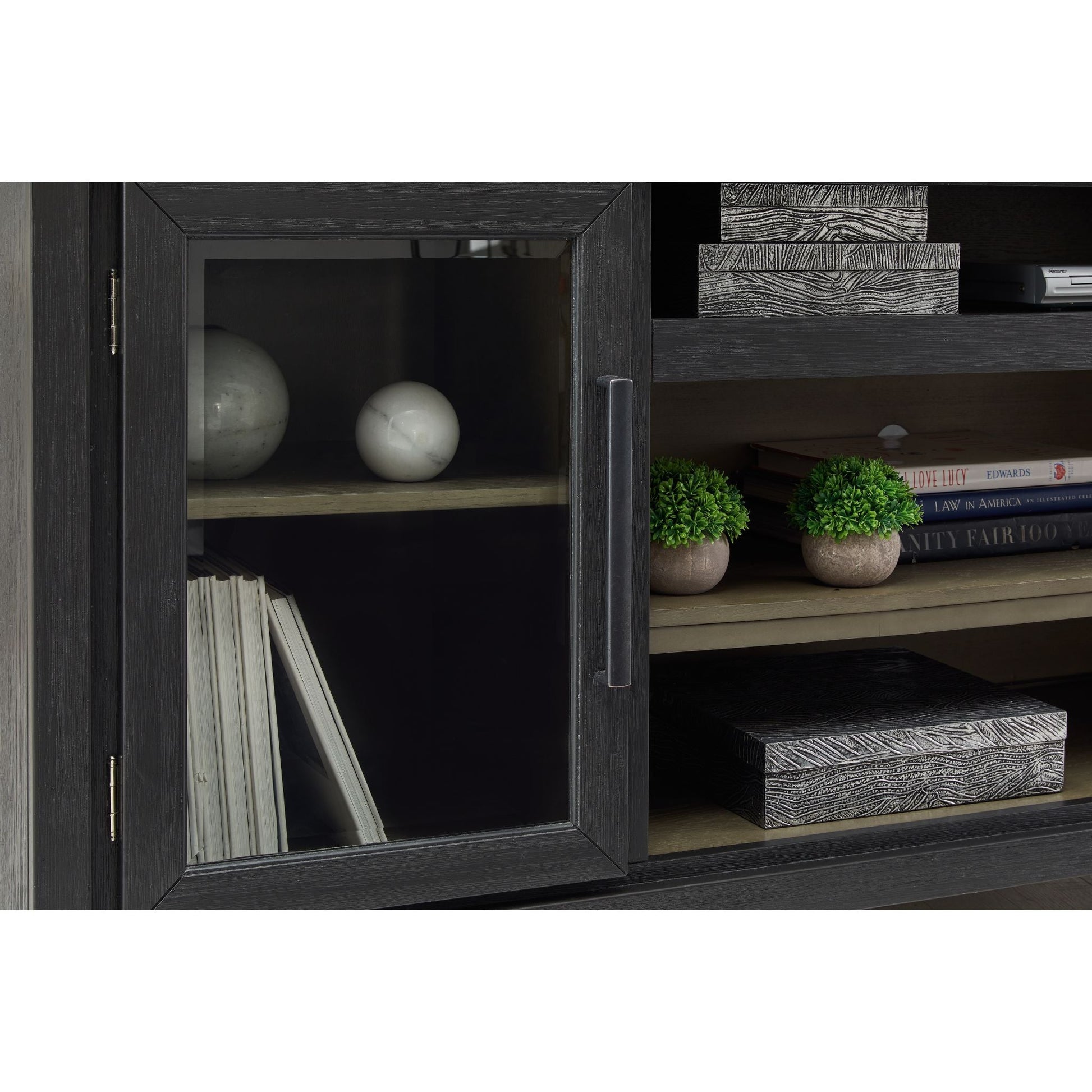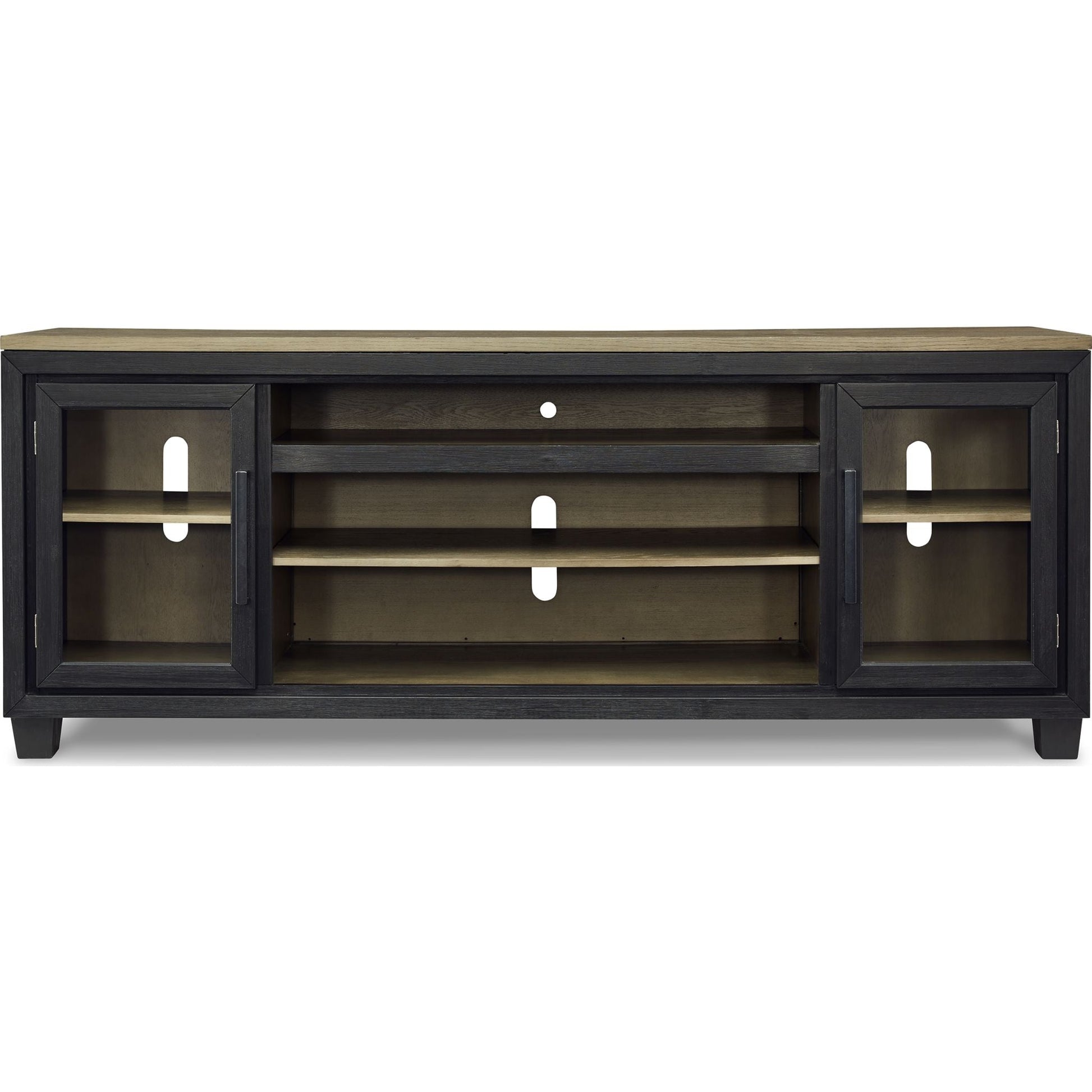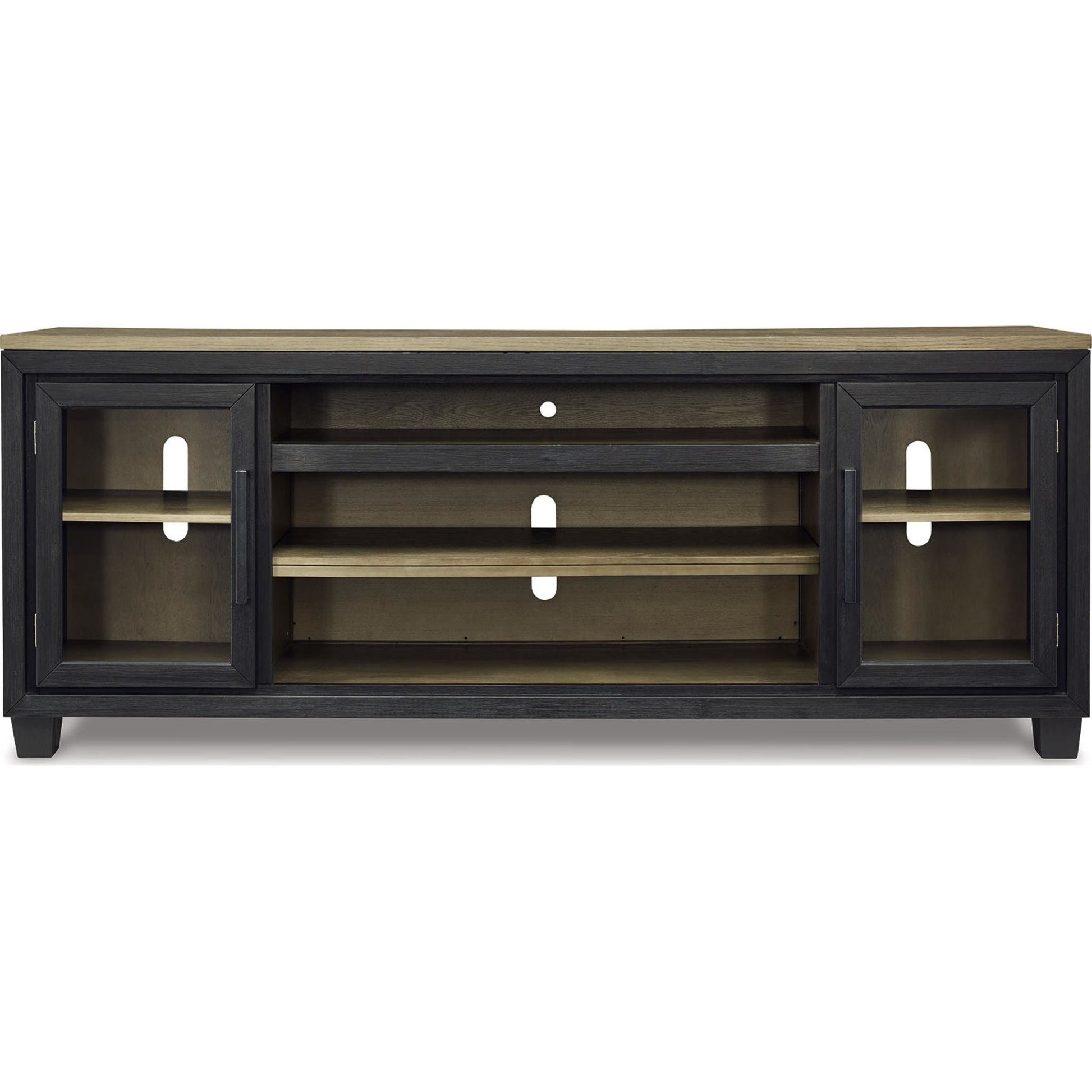 Le meuble TV Foyland avec option cheminée allie un style rustique et contemporain décontracté avec élégance. Son coloris bicolore associe une riche finition noire brossée à une teinte bois brun-grisâtre. Doté de deux placards vitrés (chacun avec une étagère réglable), d'un compartiment ouvert et d'une étagère centrale amovible, il offre un espace de rangement généreux pour tous vos appareils électroniques. Compatible avec l'insert de cheminée électrique LED W100-12 (vendu séparément).