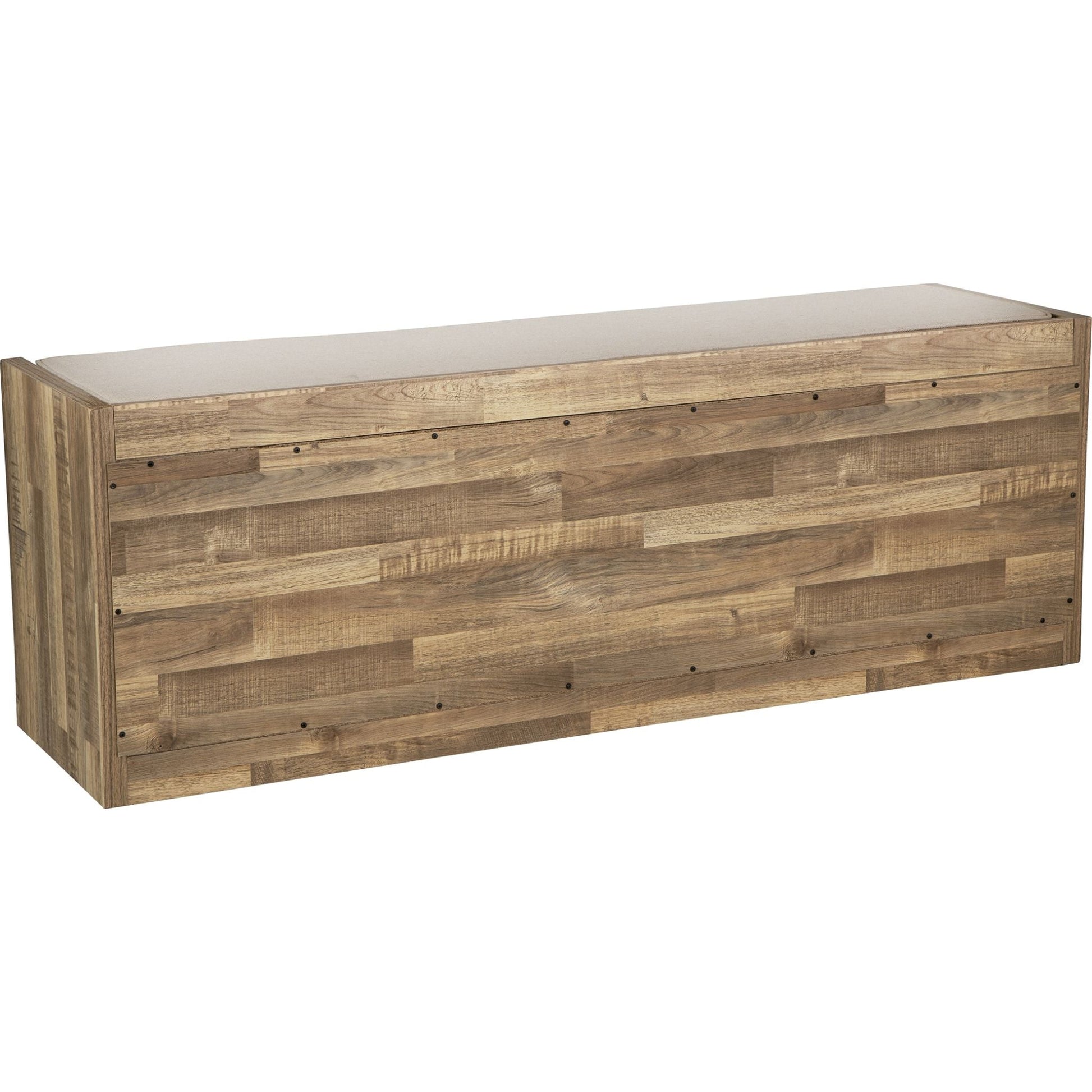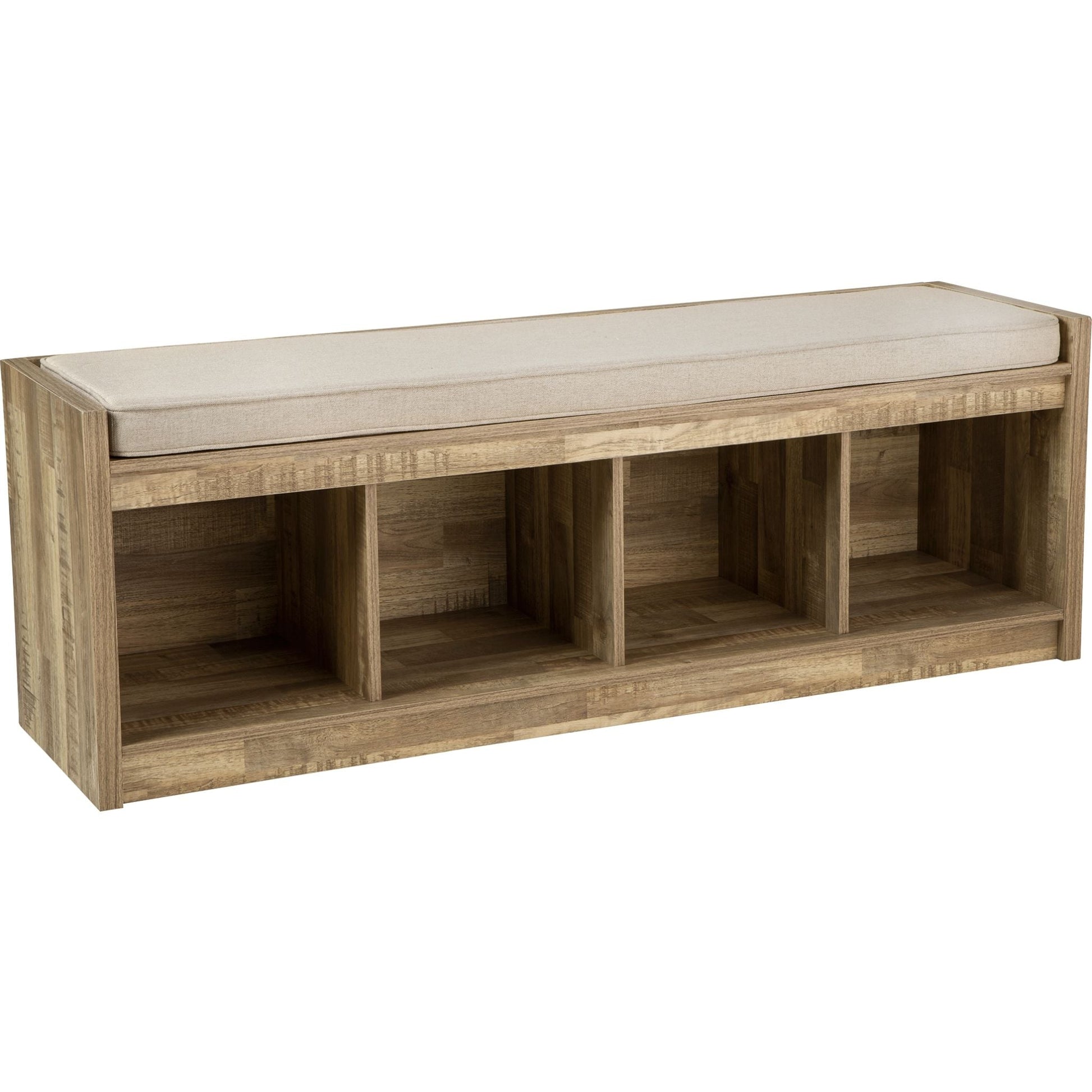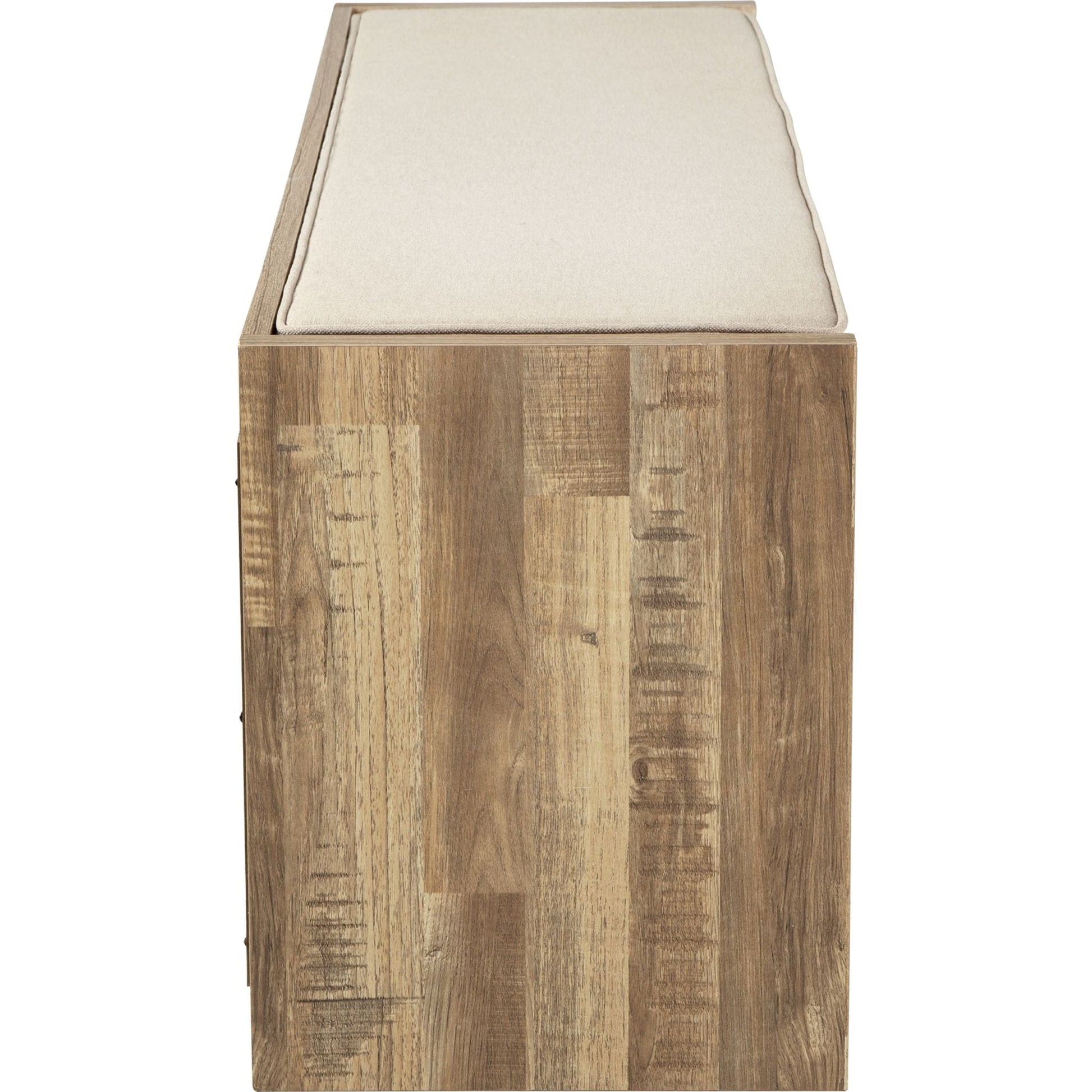 Avec son profil épuré, le banc de rangement Gerdanet s'intègre harmonieusement à tous les intérieurs. Son revêtement en bois massif imite le grain du bois et apporte une touche de modernité. Son assise réversible, garnie de tissu beige et rembourrée de mousse, vous garantit un confort optimal. Quatre compartiments de rangement ouverts allient fonctionnalité et esthétique, faisant de ce meuble un incontournable pour les grands espaces.