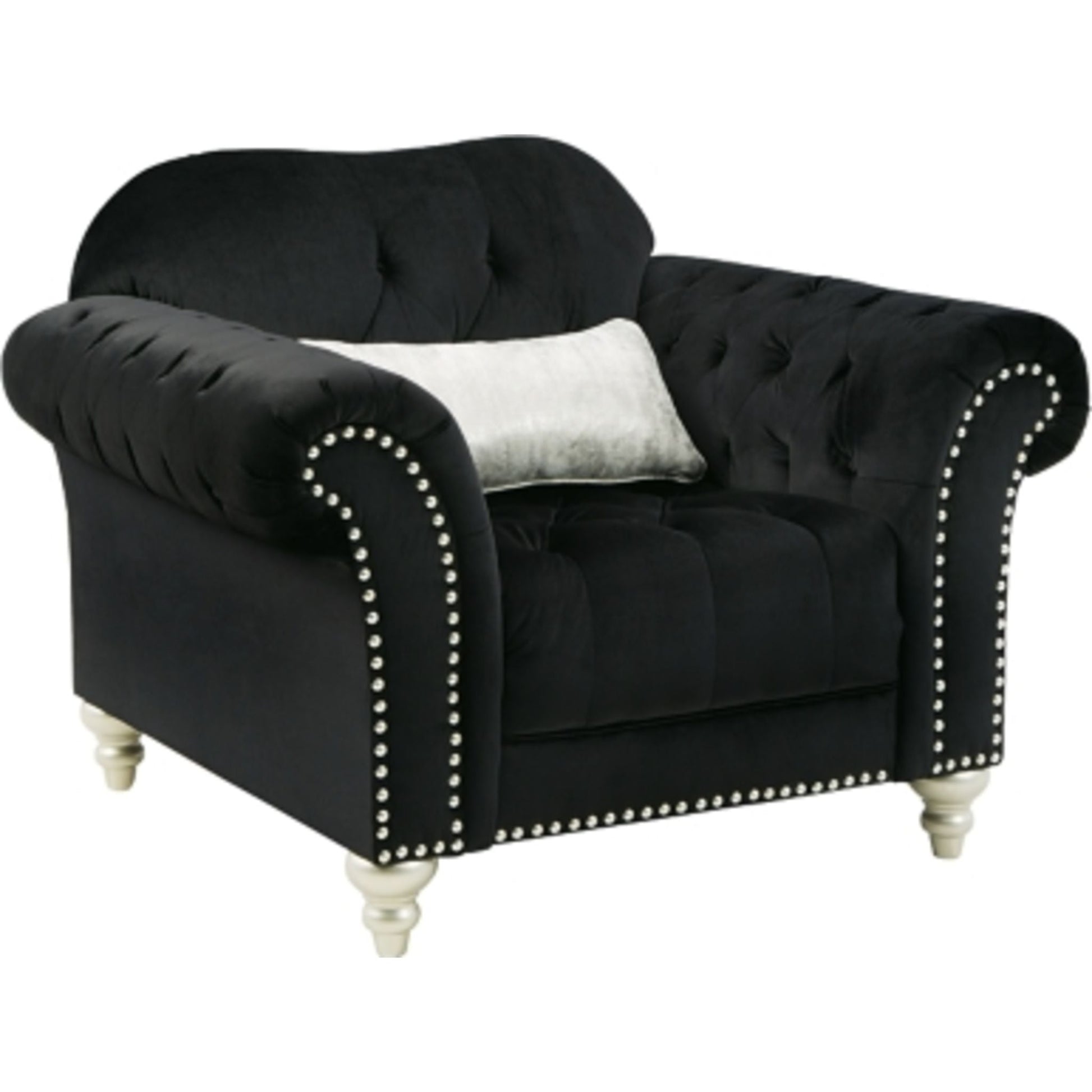 Un style digne des Oscars ! Inspirée du style Hollywood Regency, la superbe chaise Harriotte, revêtue d'un tissu noir somptueux, apporte glamour et raffinement à notre intérieur. Ses détails capitonnés, sa silhouette élégante et ses clous décoratifs lui confèrent un classicisme intemporel. Ses pieds tournés, d'une finition argentée éclatante, complètent à merveille son design. Bravo !