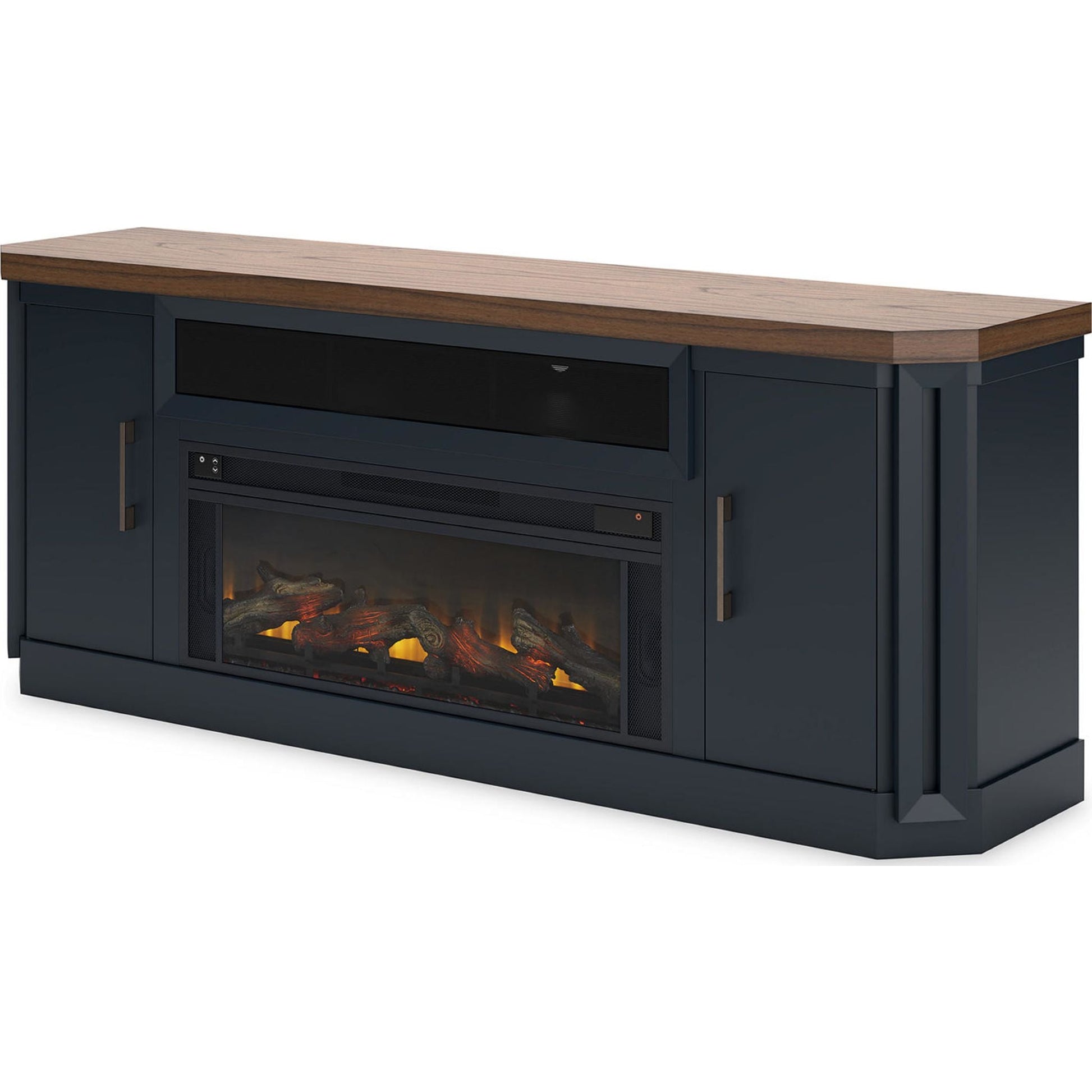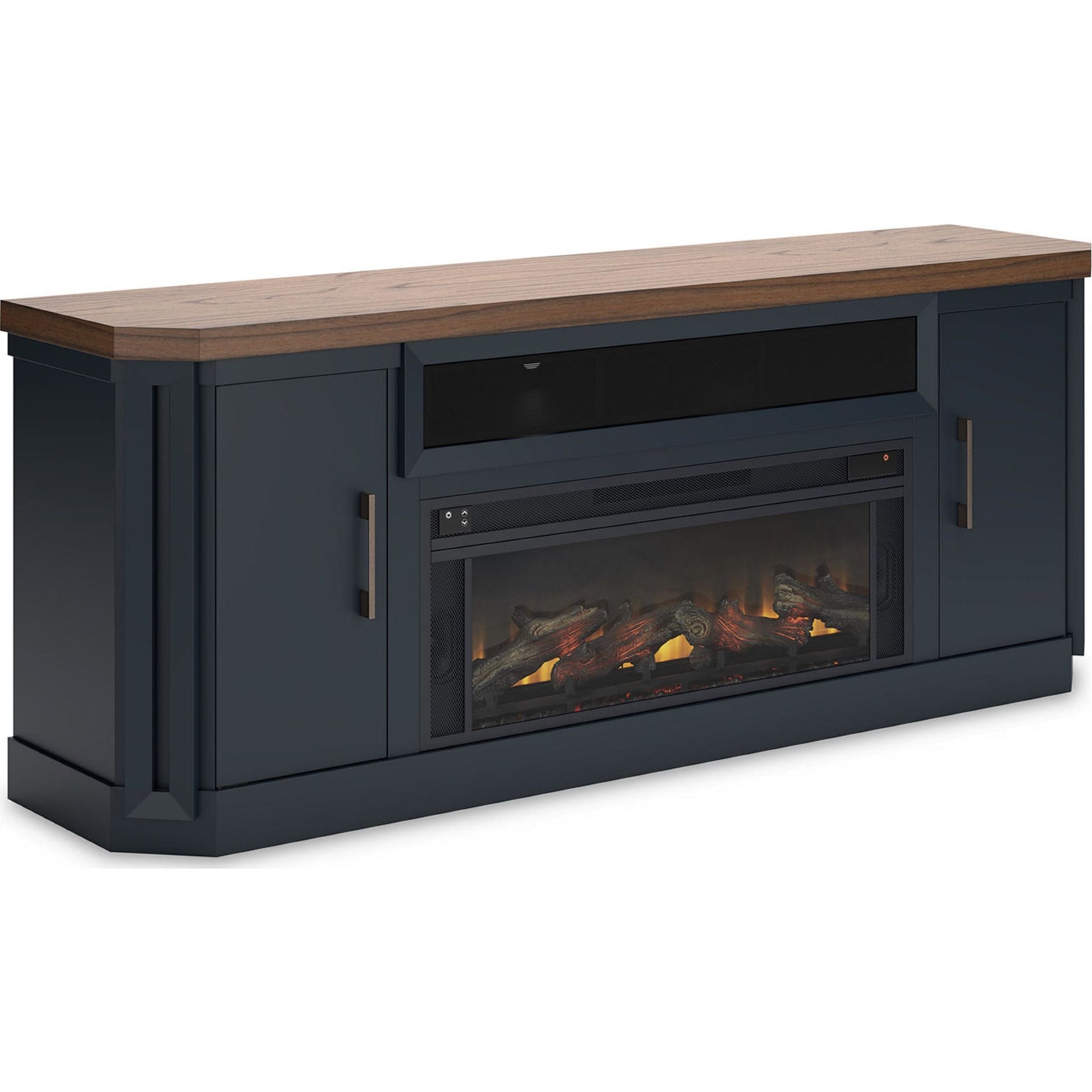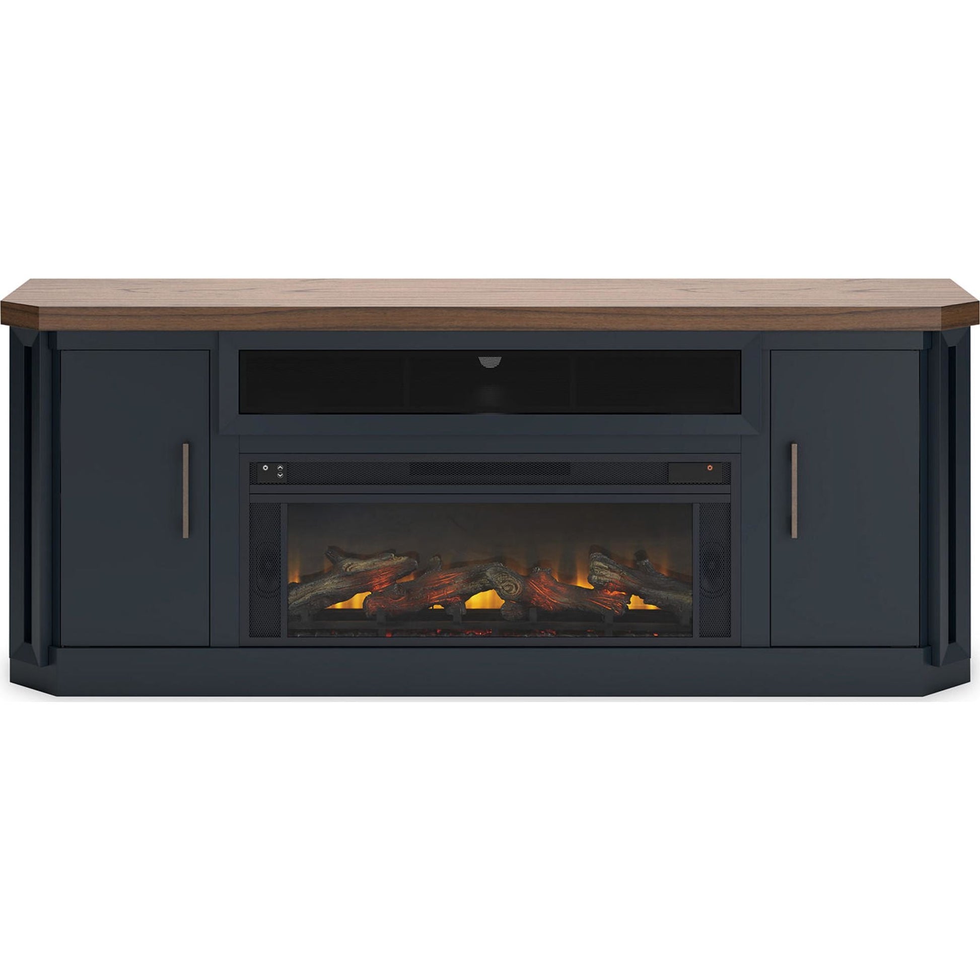 Le meuble TV Landocken allie un design contemporain décontracté à une allure résolument moderne. Son plateau épais en bois et son caisson bleu ardoise en font un choix judicieux à bien des égards. Rangez vos appareils électroniques dans les placards spacieux et dissimulez une barre de son sur l'étagère supérieure pour une intégration parfaite. Apportant une touche de romantisme à votre salon grâce à ses bûches réalistes et ses braises incandescentes, la cheminée électrique fournie fonctionne avec ou sans chauffage. D'une simple pression sur un bouton, ajustez l'intensité des flammes, la température ou connectez votre système audio sans fil aux haut-parleurs intégrés.