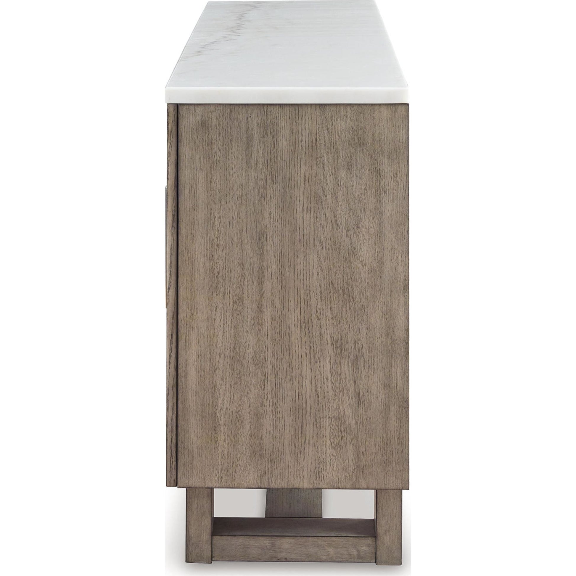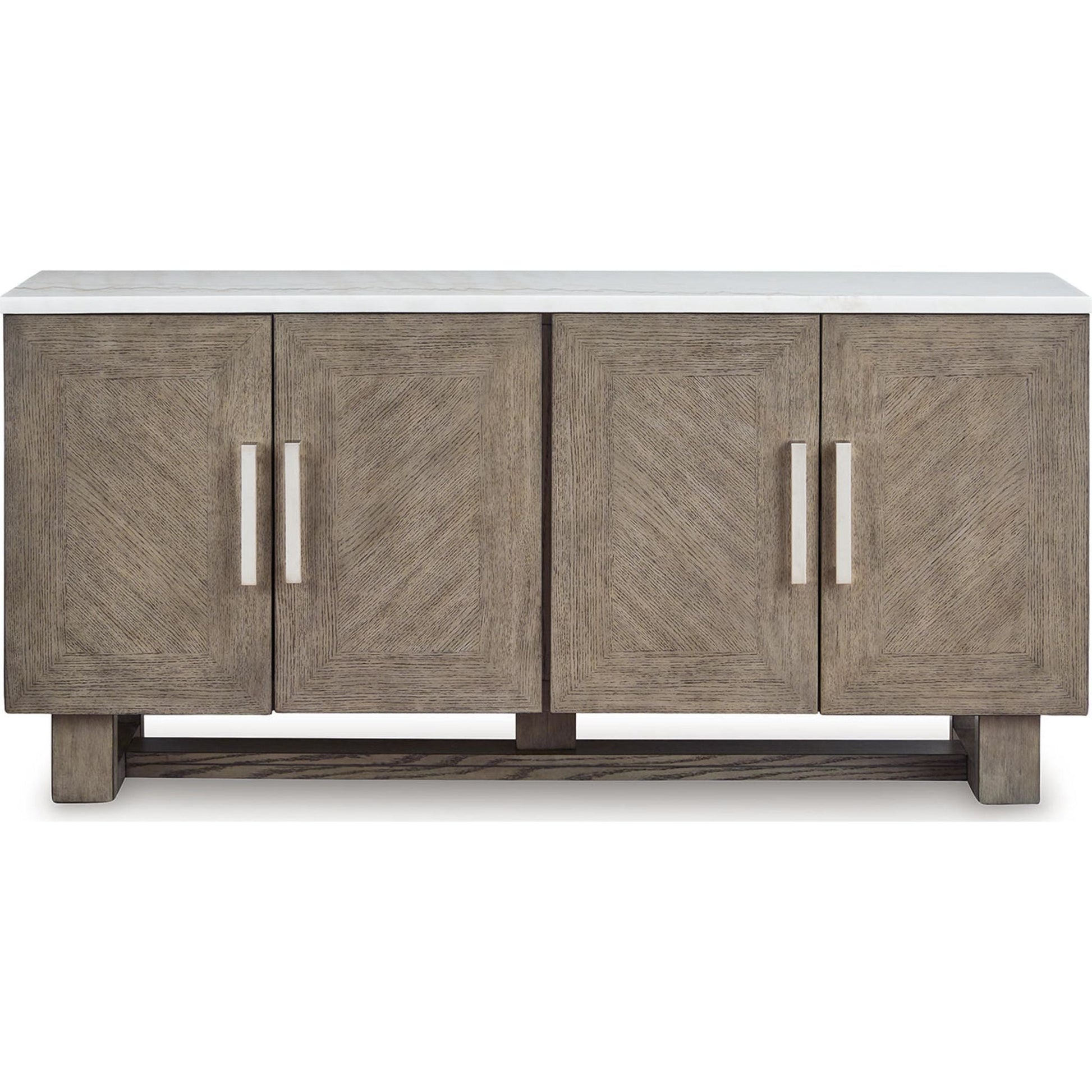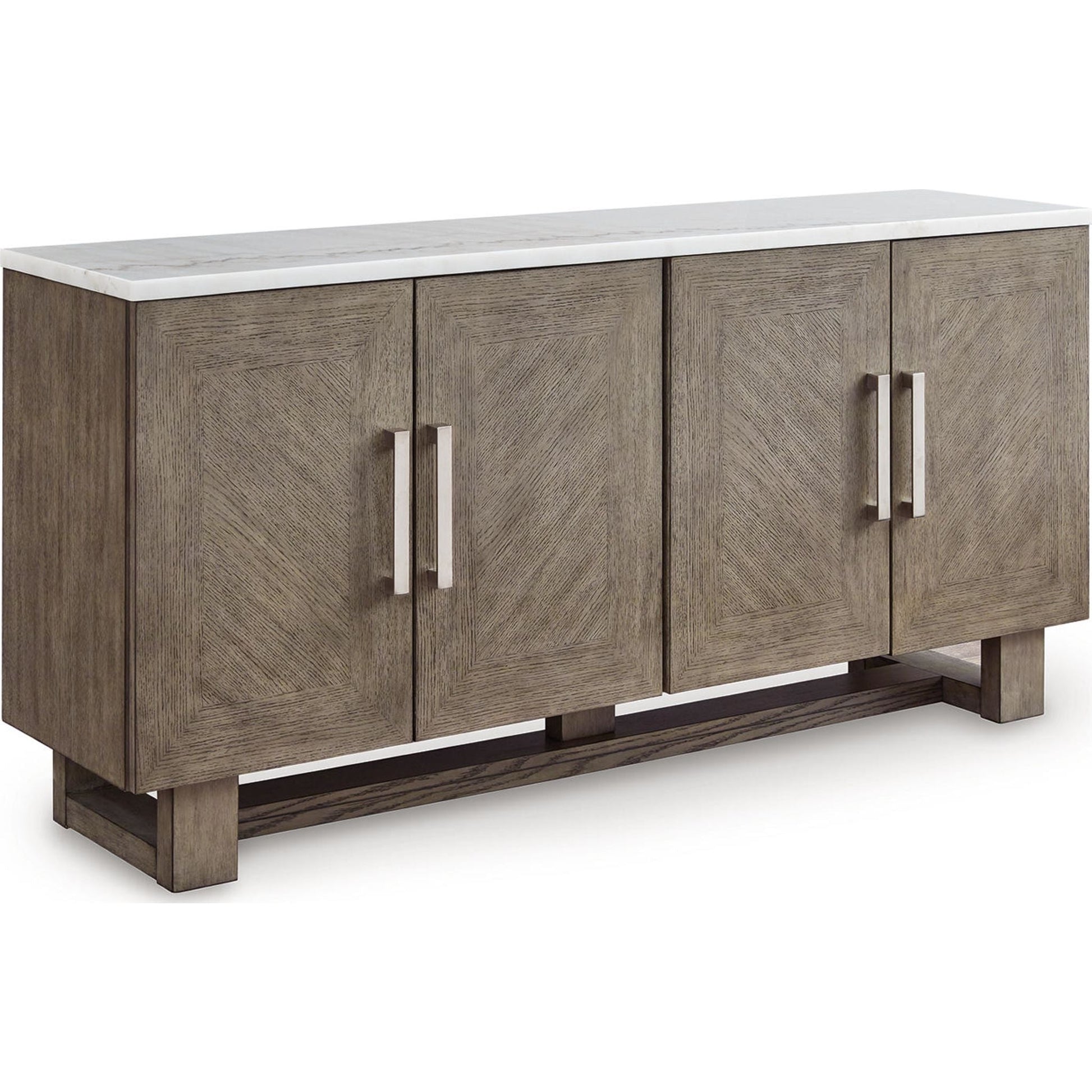 Apportez à votre intérieur un style décontracté et contemporain, alliant style et fonctionnalité. Le meuble TV Loyaska, avec son plateau en marbre blanc et sa finition brun grisâtre, offre une ambiance chaleureuse et apaisante, idéale après une longue journée. Ses portes d'armoire ornées de chevrons encadrés et ses grandes poignées argentées ajoutent du relief et du style. De plus, ses étagères réglables et ses passe-câbles offrent un espace de rangement généreux pour vos accessoires multimédias, pour plus de praticité et de polyvalence.