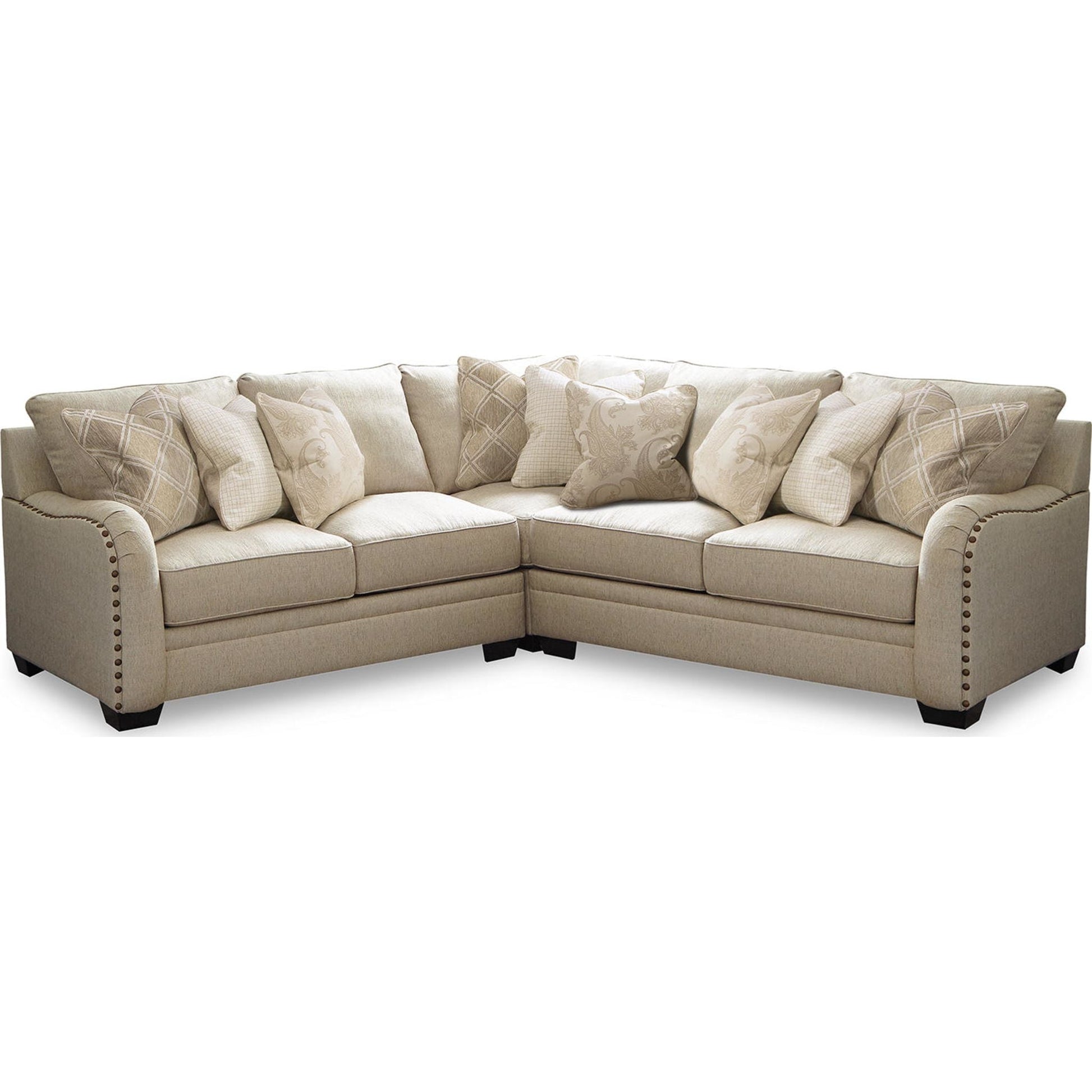 Séduisant et accueillant, le canapé d'angle Luxora allie style traditionnel et confort moderne. Revêtu d'un tissu couleur biscuit apaisant, ce canapé est doté de coussins et de galettes de dossier UltraPlush pour un confort optimal. Les clous décoratifs qui ornent les côtés du canapé soulignent les courbes élégantes des accoudoirs. Six coussins design aux teintes neutres et aux motifs contrastés apportent chaleur et texture.