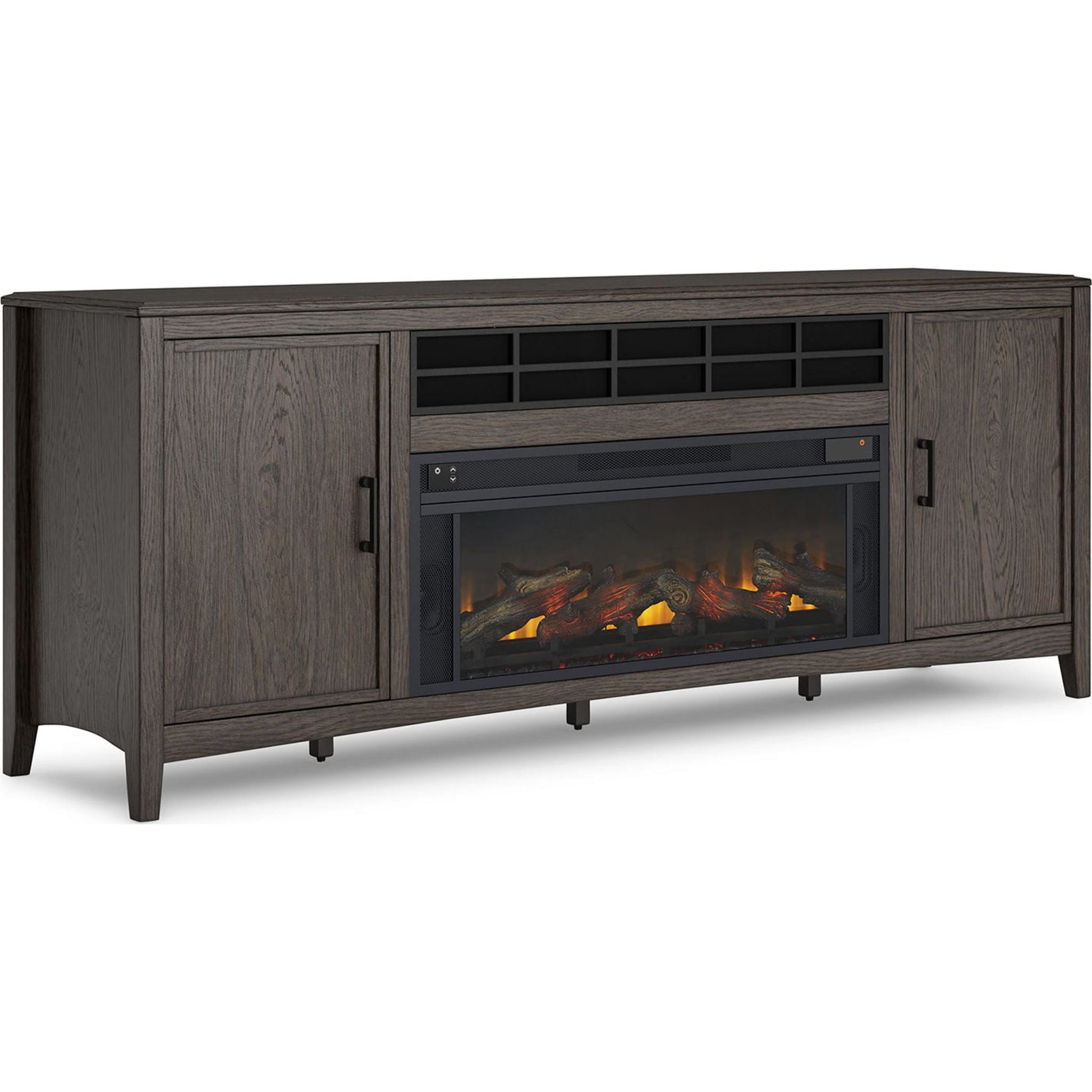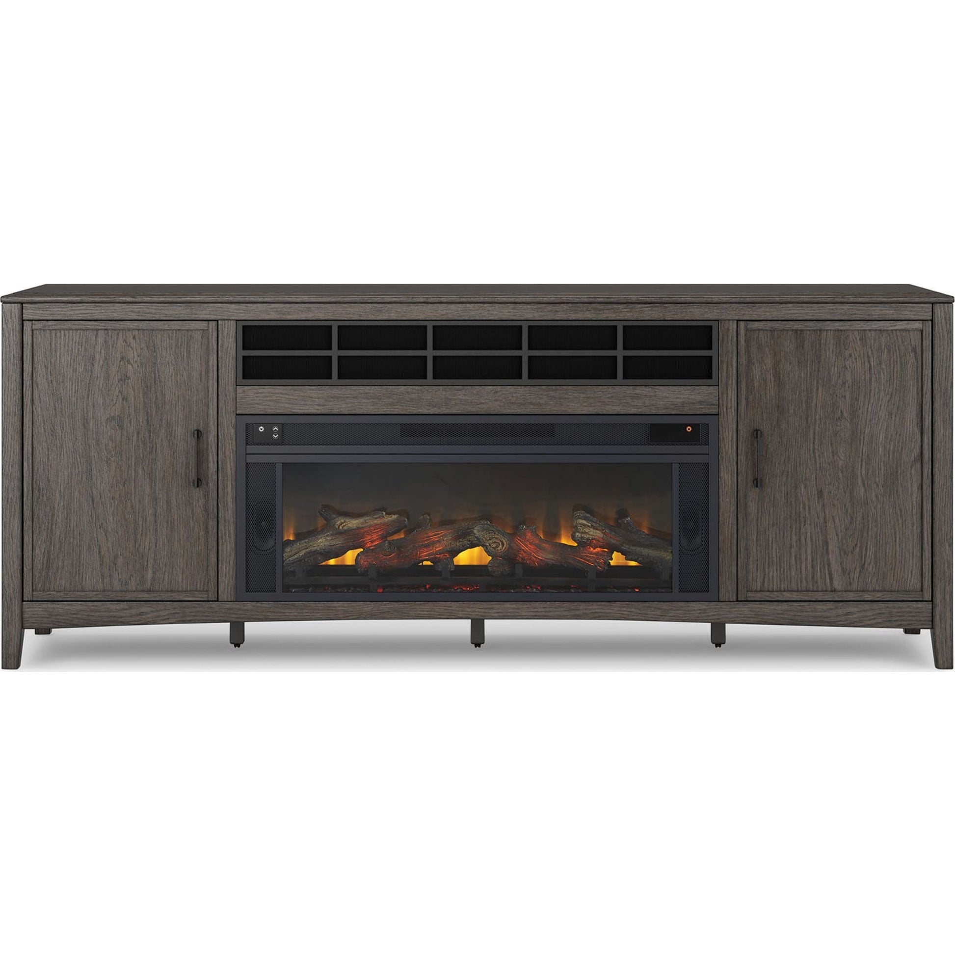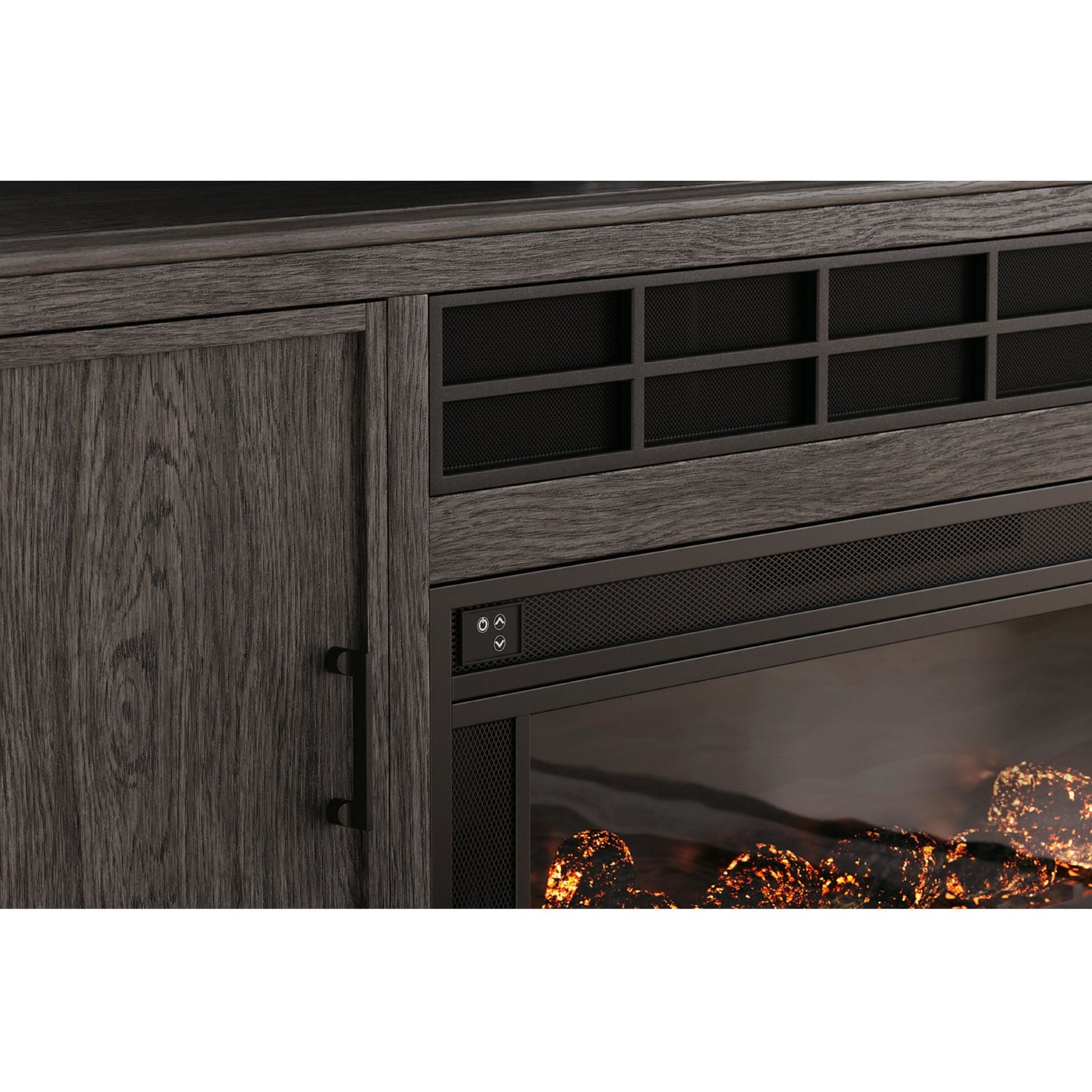 Apportez une touche de chaleur et une ambiance raffinée à votre salon. À la fois épuré et chaleureux, ce meuble TV avec insert cheminée possède de nombreux atouts qui en font un choix idéal pour la décoration de vos rêves. Parfait exemple du style « contemporain décontracté », ce meuble design impressionne par sa finition gris-brun moyen contrastant avec le grain du bois noirci. Ses placards et étagères spacieux sont parfaits pour ranger votre liseuse, vos télécommandes et autres accessoires multimédias. La grille décorative de l'étagère supérieure peut dissimuler une barre de son pour un style élégant.