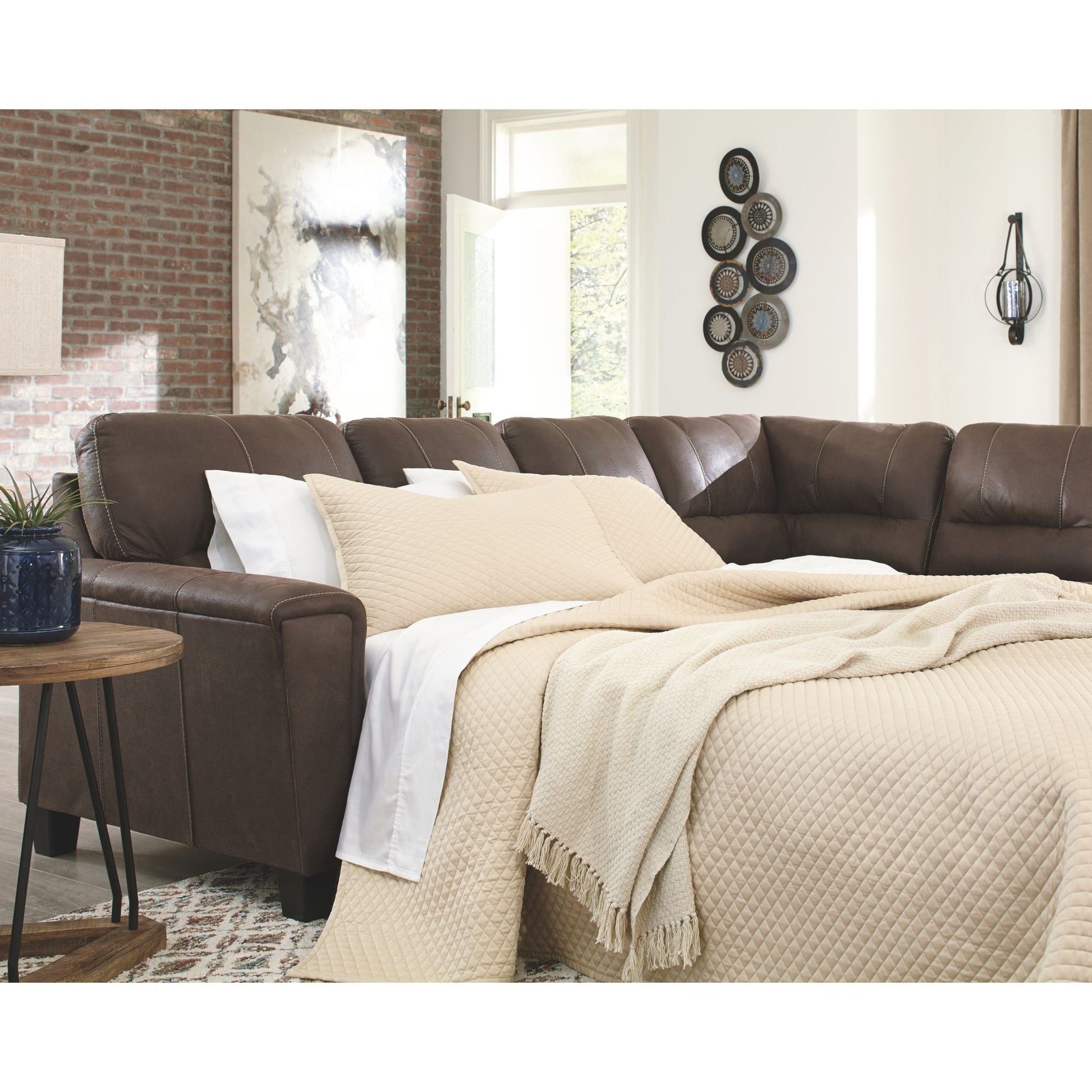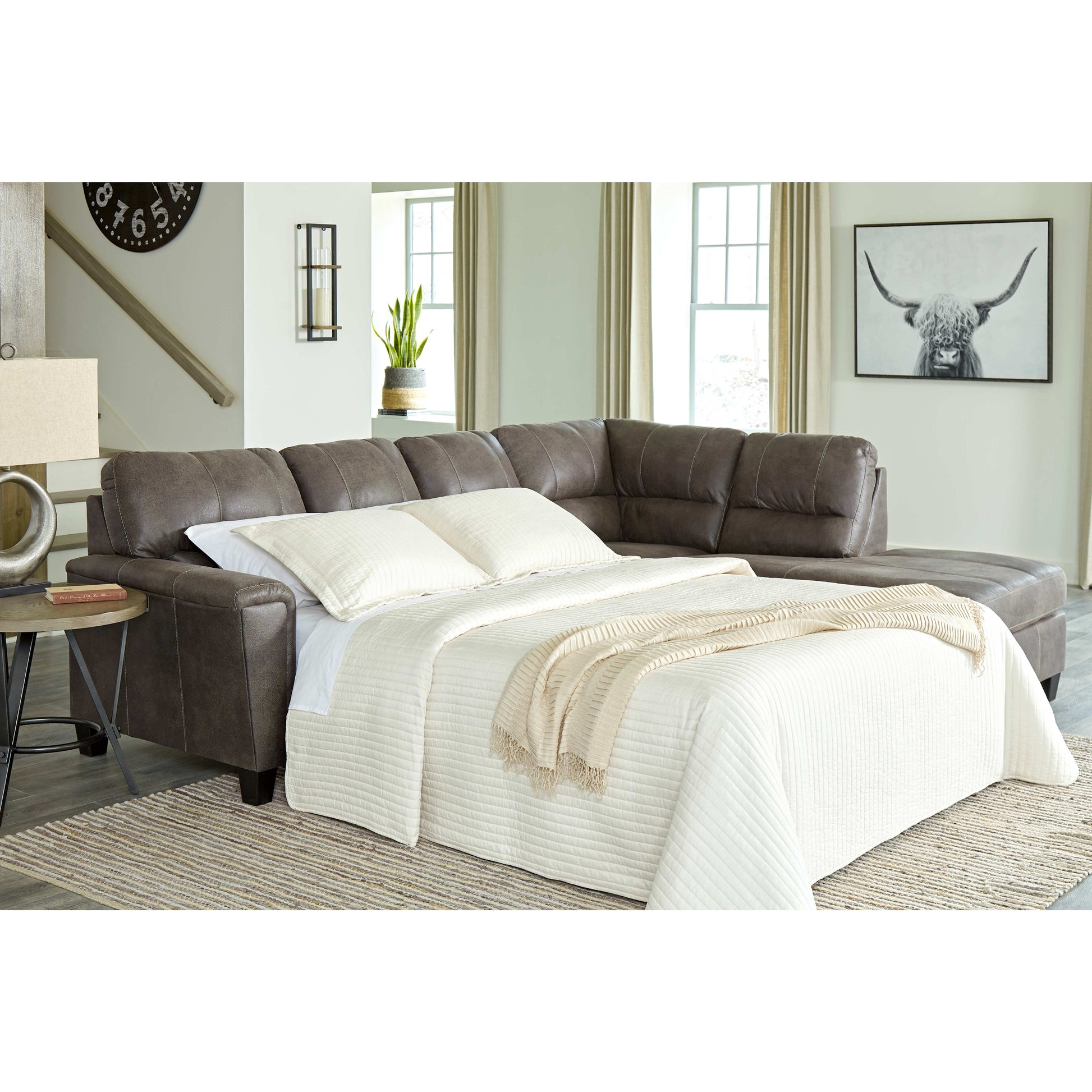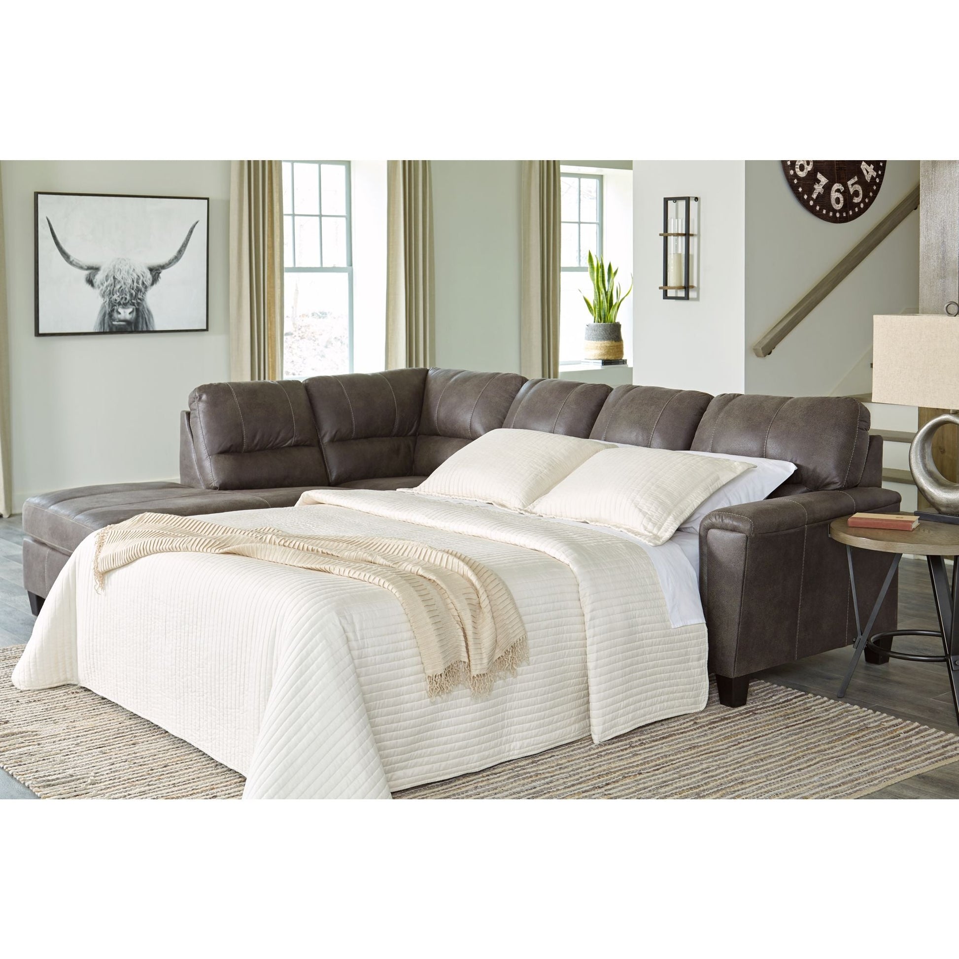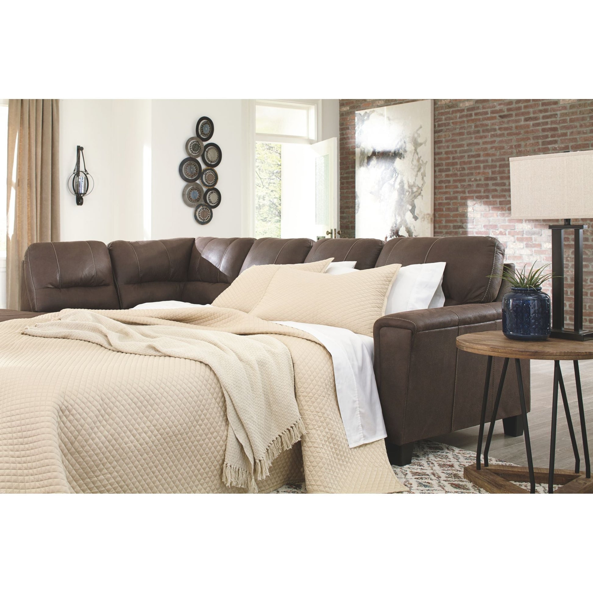 Si vous appréciez l'allure élégante du cuir mais rêvez de la douceur du tissu, le canapé-lit d'angle McCammon saura vous séduire. Revêtu d'un superbe similicuir à la teinte patinée et à la texture légèrement granuleuse, imitant à la perfection le cuir véritable, ce canapé d'angle résolument moderne prouve que la simplicité est la clé du confort. Ses lignes épurées, notamment ses côtés biseautés et ses accoudoirs droits recouverts d'un coussin moelleux, lui confèrent un charme supplémentaire. Les surpiqûres apparentes et le dossier divisé aux lignes nettes apportent une touche de modernité. Et pour un confort optimal, son matelas queen en mousse à mémoire de forme accueillera vos invités pour la nuit.