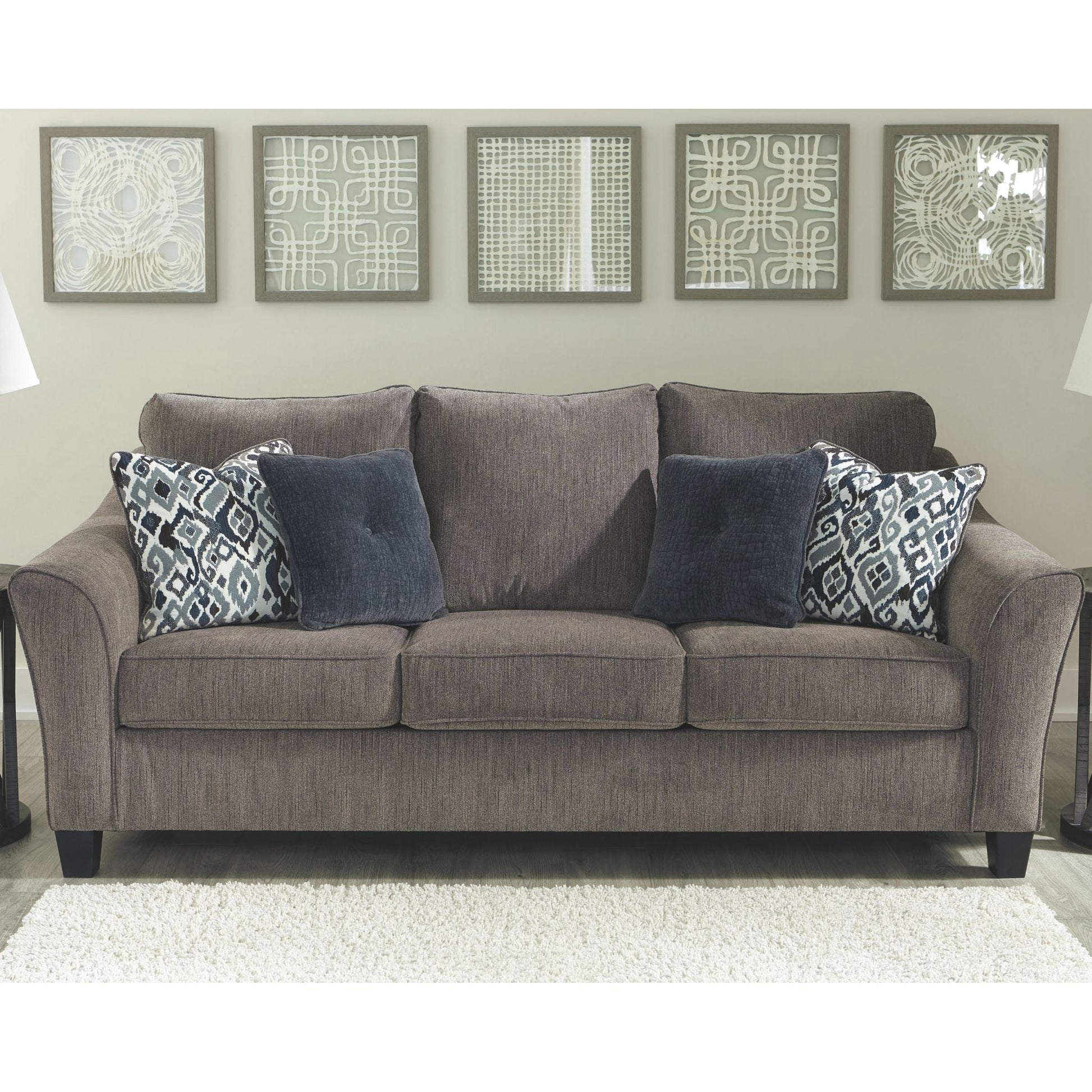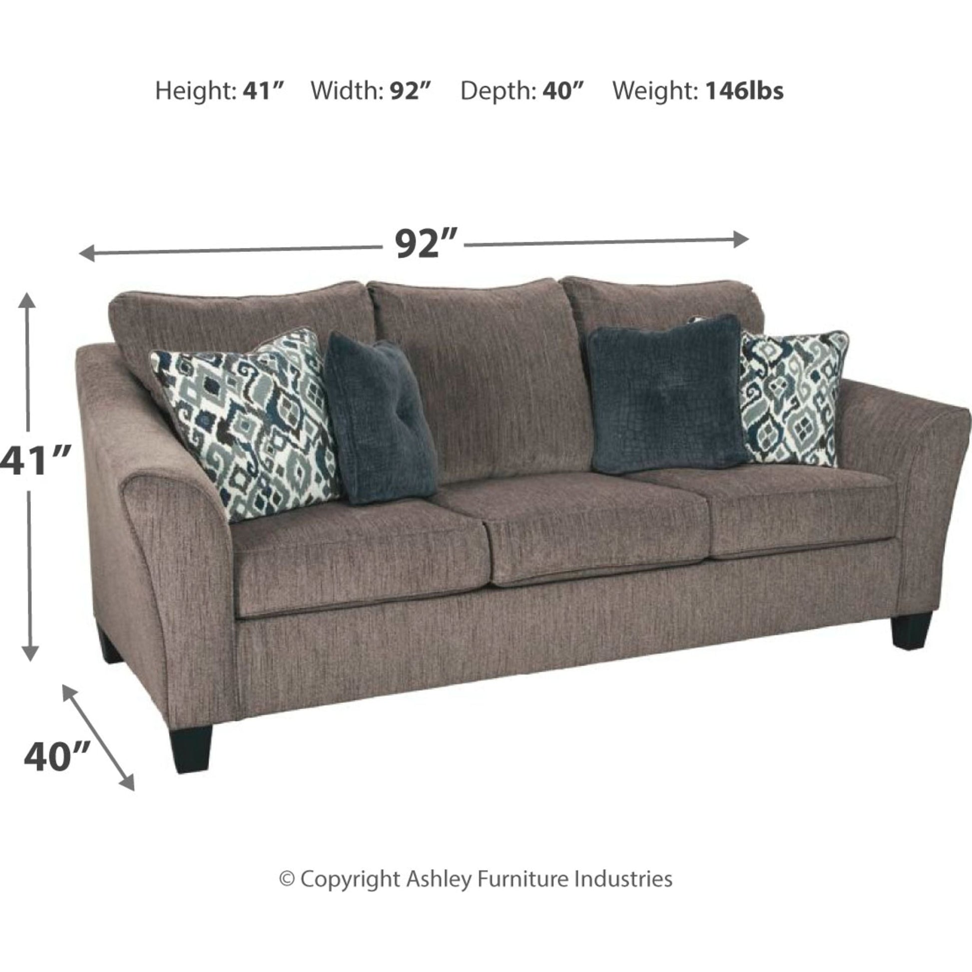Le canapé Nemoli crée une ambiance moderne et décontractée. Son revêtement en chenille texturée et microfibre unie offre un toucher luxueux et doux, particulièrement accueillant. Ses accoudoirs légèrement évasés et ses coussins d'assise moelleux invitent à la détente et au confort. Son revêtement couleur ardoise, très tendance, met parfaitement en valeur les quatre coussins décoratifs.