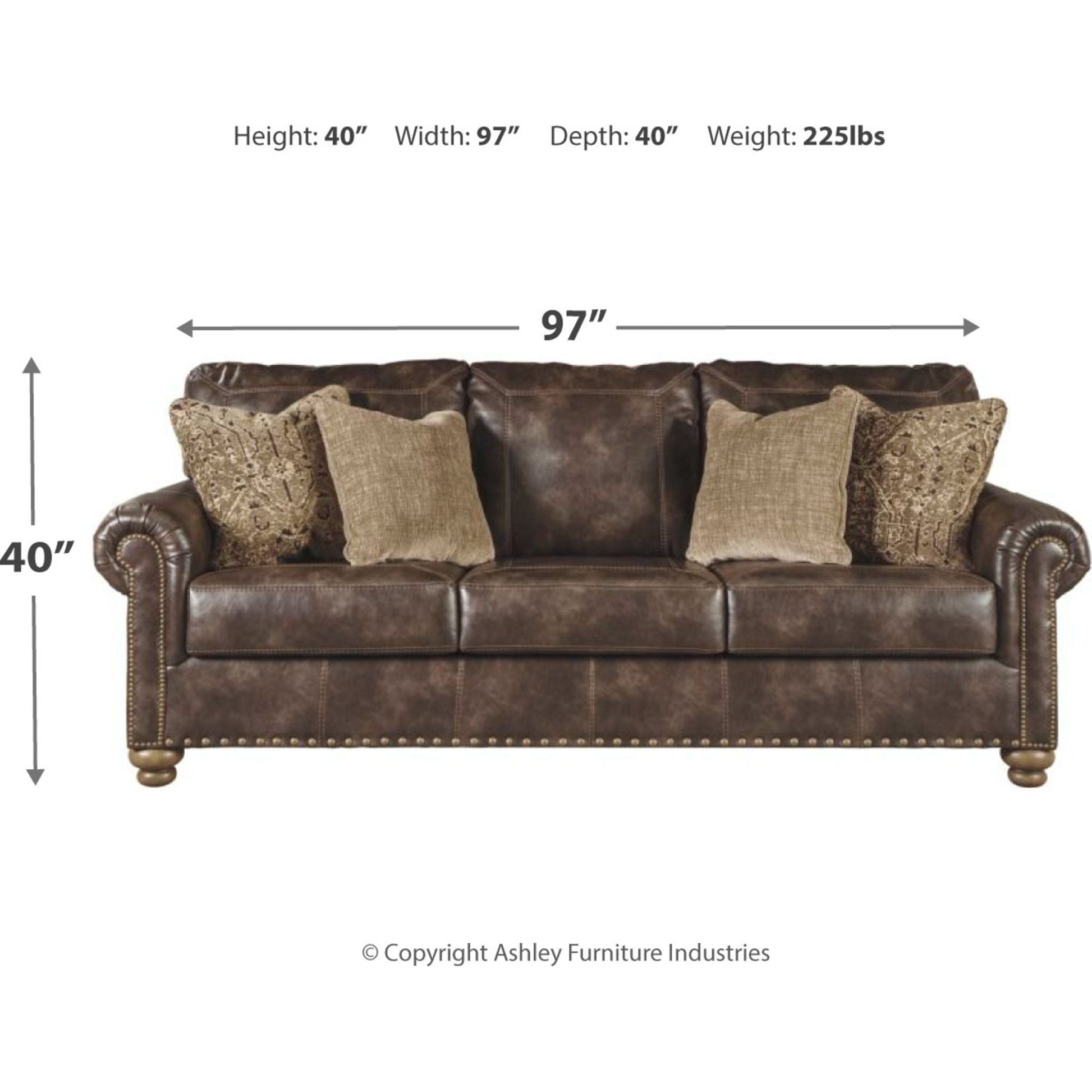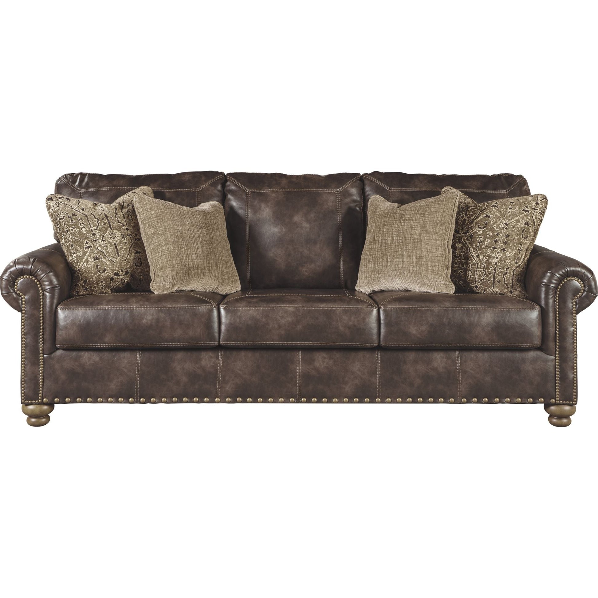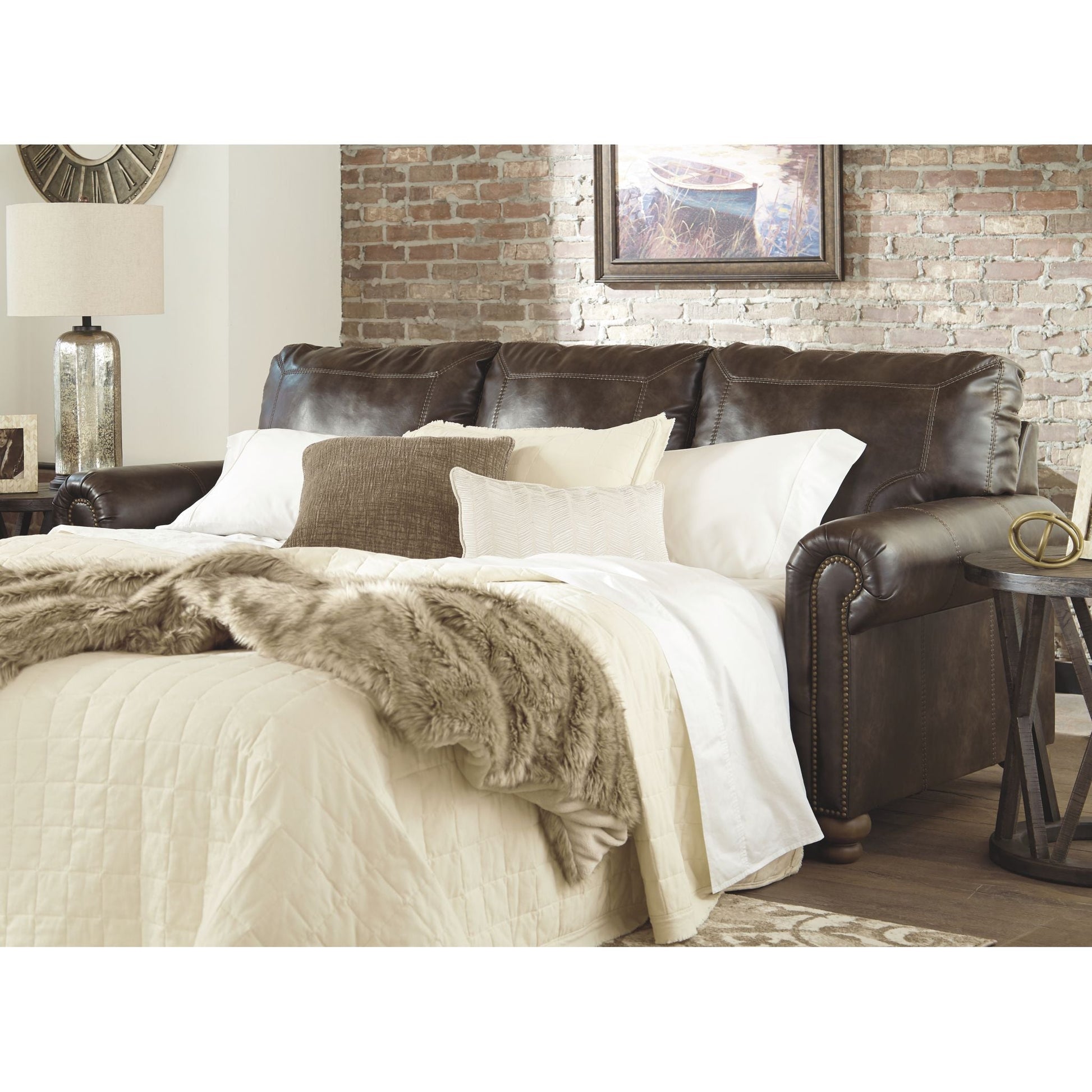 Avec son revêtement en similicuir brun café, rehaussé d'un effet légèrement vieilli et de surpiqûres design, le canapé-lit Nicorvo (taille queen) allie un style traditionnel raffiné à un confort moderne. Ses accoudoirs arrondis, ses pieds tournés et ses clous décoratifs lui confèrent un caractère unique. Fabriqué en mousse à mémoire de forme de haute qualité, son matelas dépliable (taille queen) accueille confortablement vos invités pour la nuit.