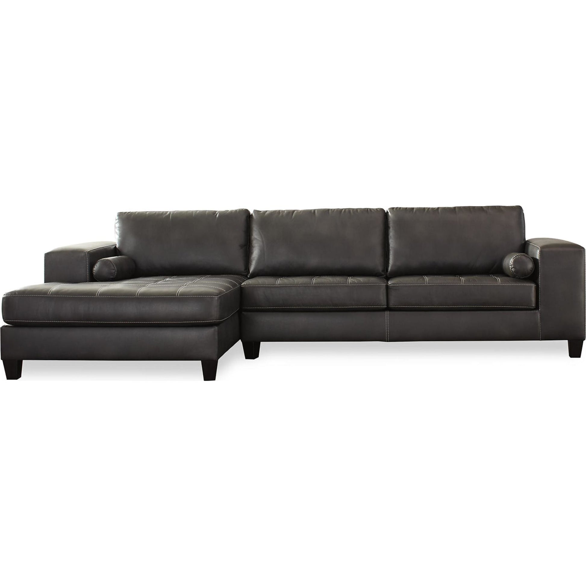 Le mot « simple » n'a pas sa place dans le vocabulaire du canapé d'angle Nokomis. Son dossier bas et ses larges accoudoirs lui confèrent un style résolument moderne. Un rembourrage moelleux, judicieusement placé, lui donne une allure élégante et racée. Le similicuir anthracite, à l'effet grain naturel embossé et à la finition mate, s'inspire des cuirs européens contemporains. Les surpiqûres gris clair apportent du contraste, et le capitonnage des assises place cet ensemble dans une catégorie à part.