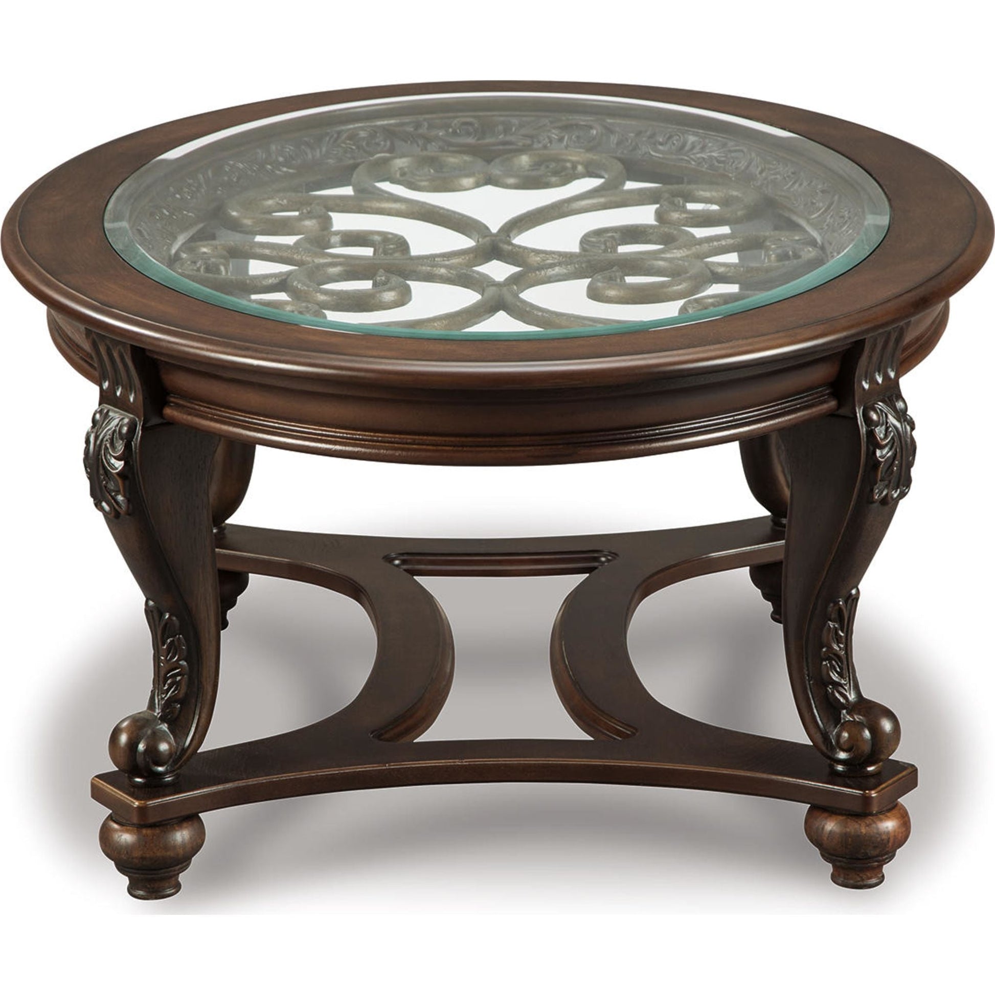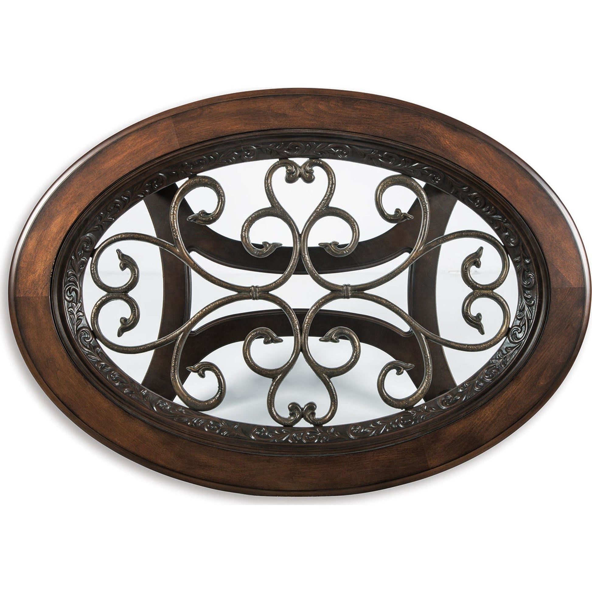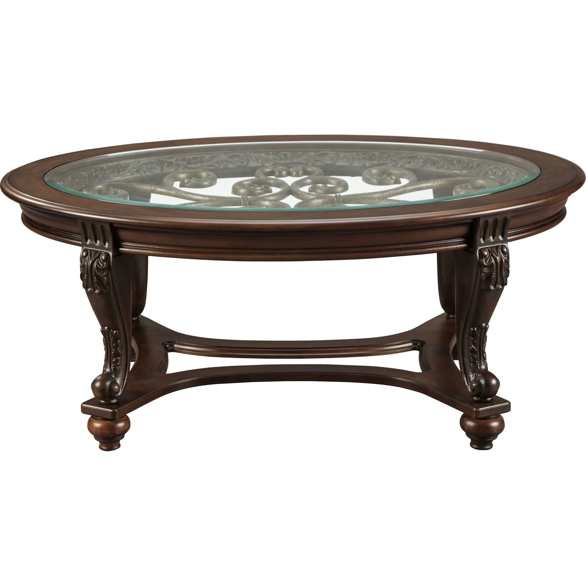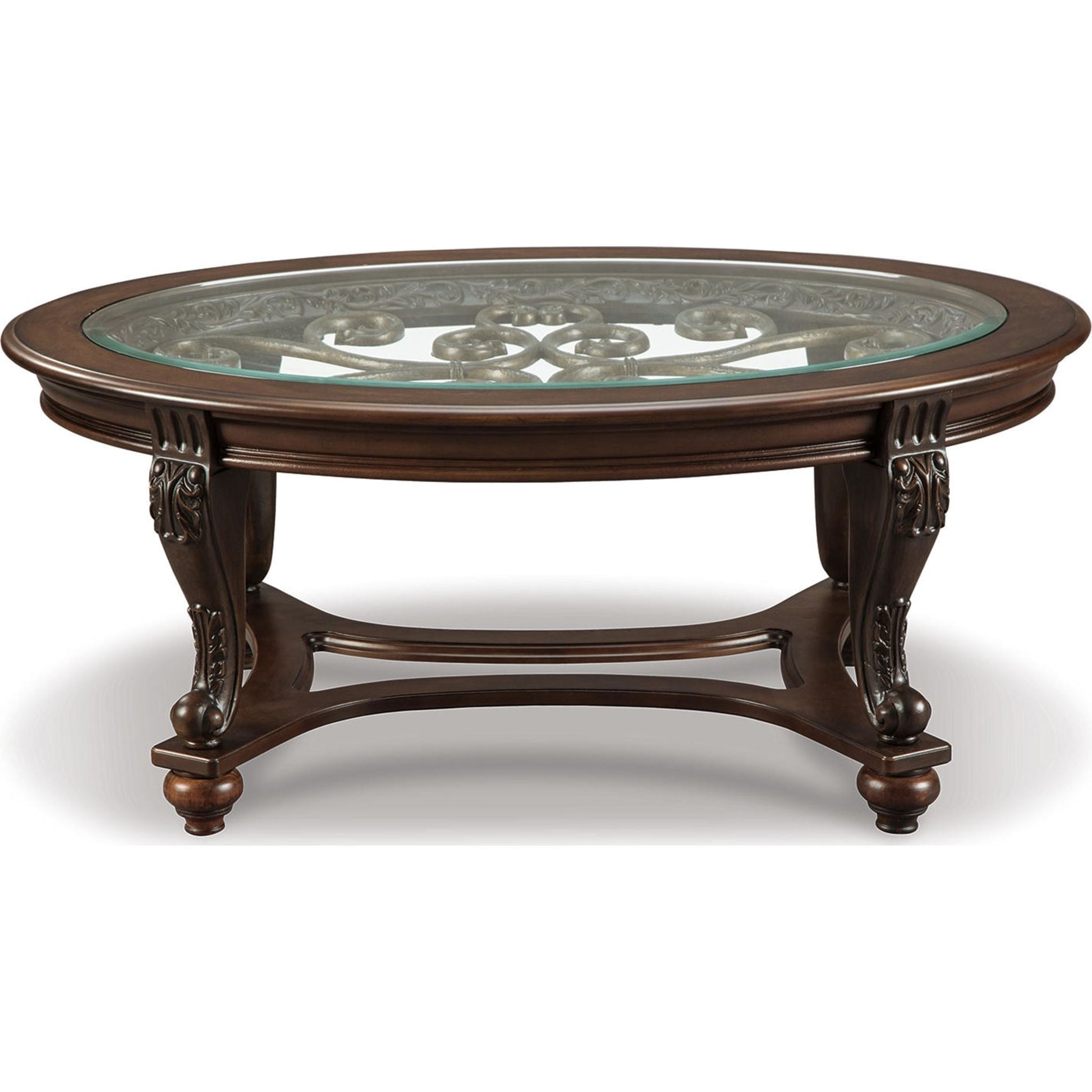 La table basse ovale Norcastle mérite d'être saluée pour l'harmonieuse combinaison de ses éléments. Des volutes métalliques apportent une belle profondeur au plateau en verre biseauté. Leur motif original se retrouve dans les sculptures et les courbes des pieds et des entretoises richement teintés.
