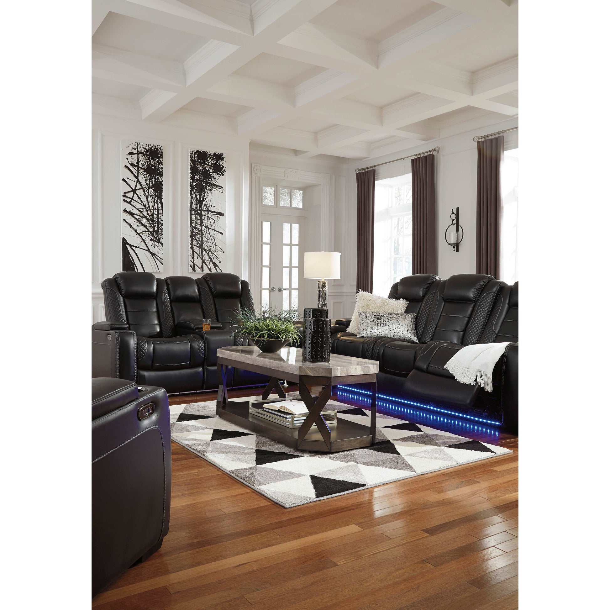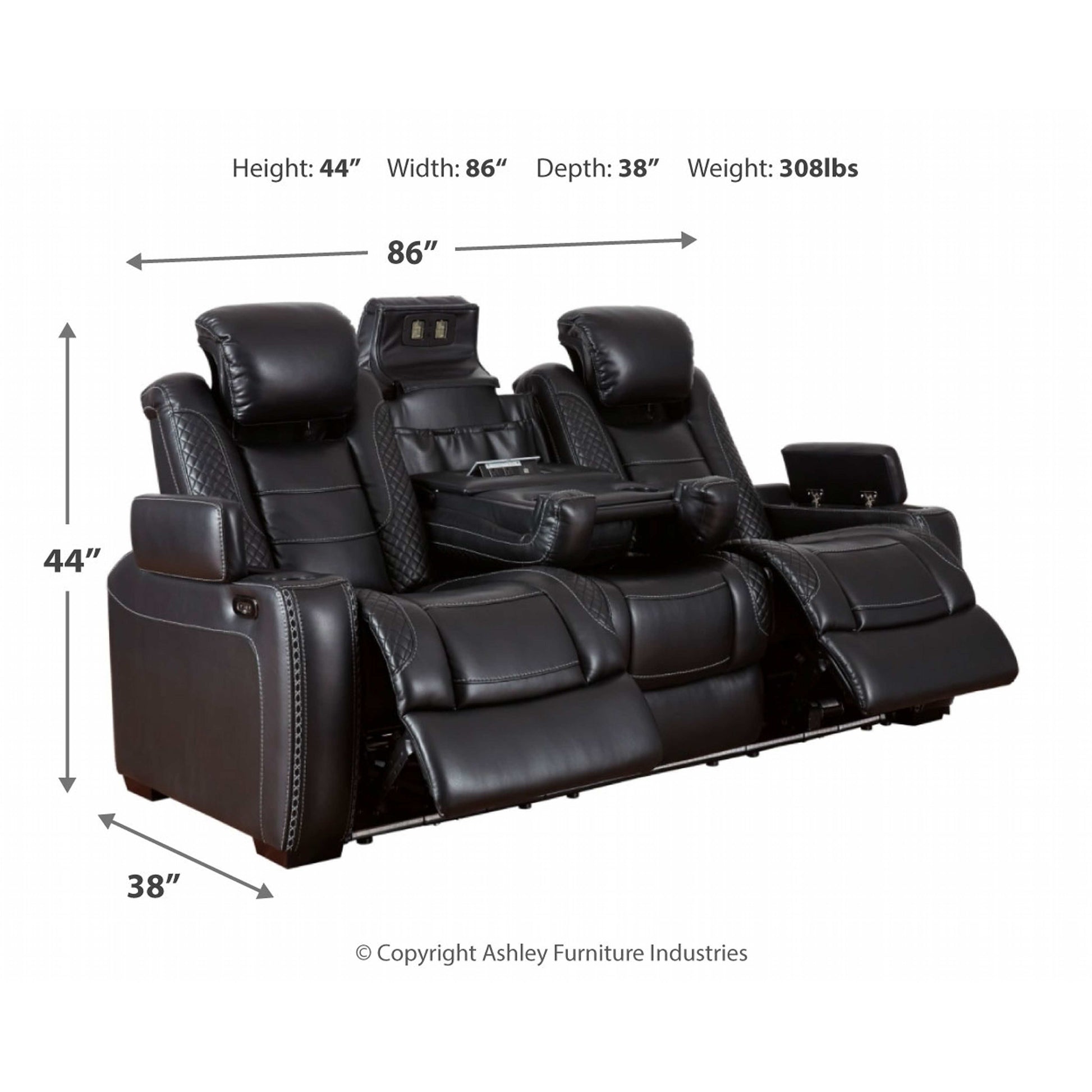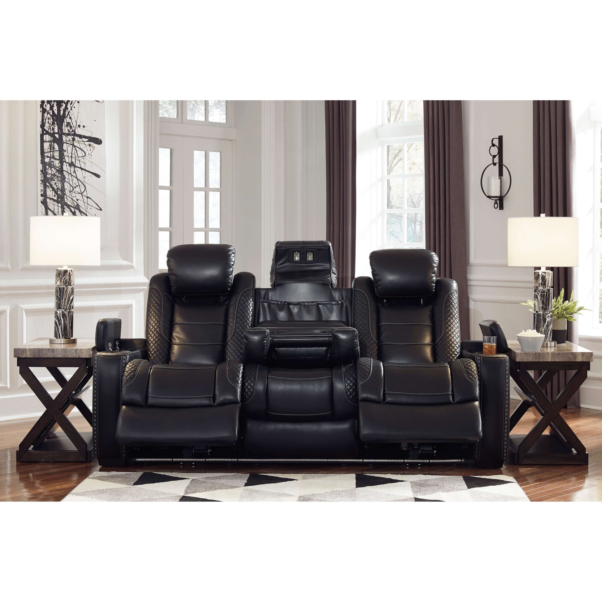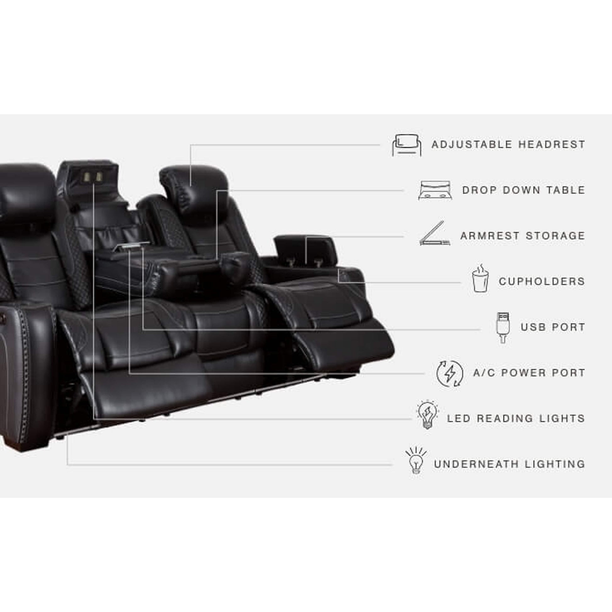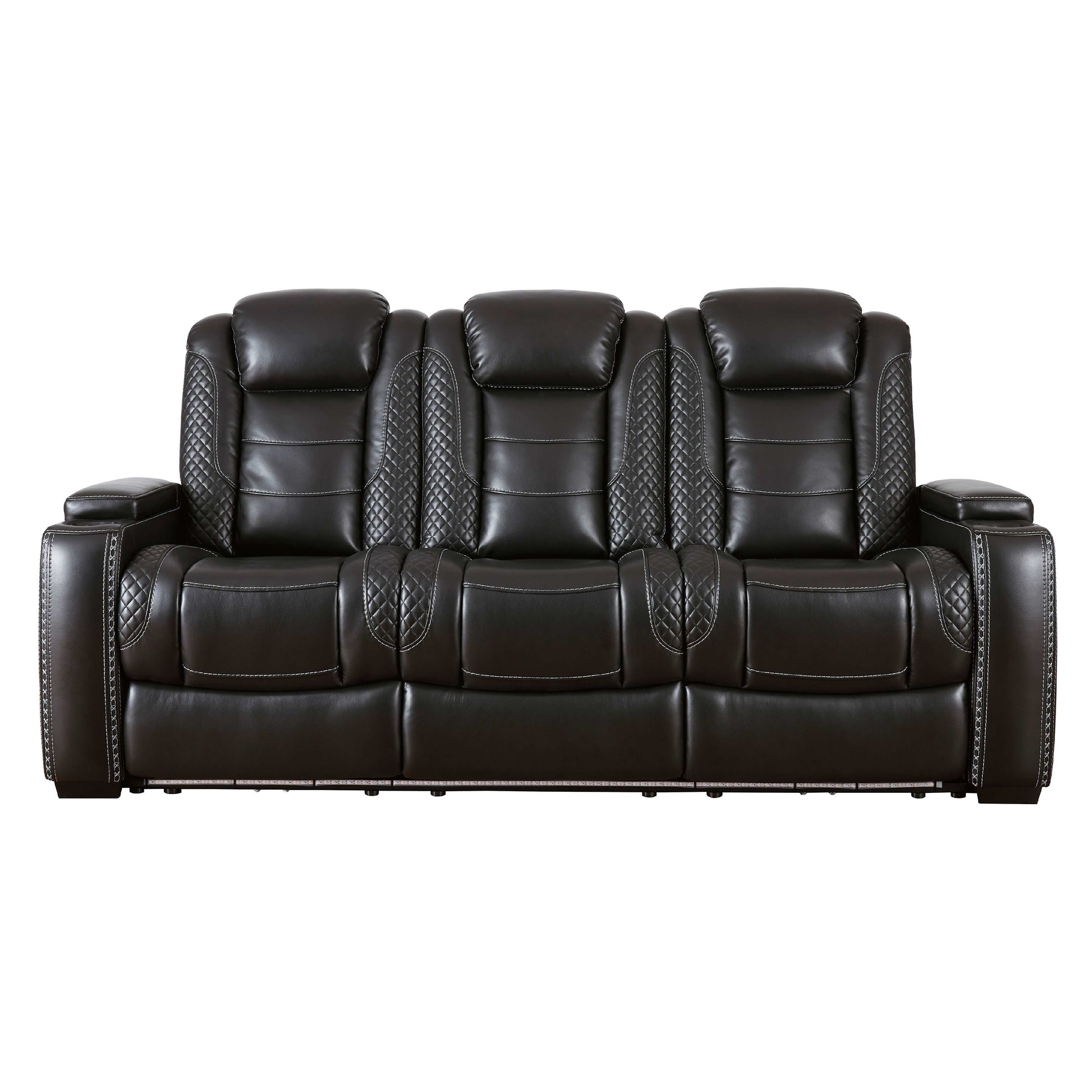 Le canapé inclinable électrique Party Time s'inspire des automobiles de luxe avec ses surpiqûres en treillis et en croisillons, pour une esthétique raffinée qui invite à la fête. Ses coussins somptueux et son revêtement en similicuir noir profond ajoutent une touche de luxe. Et pour des moments de détente, ses deux sièges baquets inclinables (le siège central est fixe), ses appuie-tête réglables électriquement Easy View™ et son siège central convertible en table vous offrent un confort optimal.