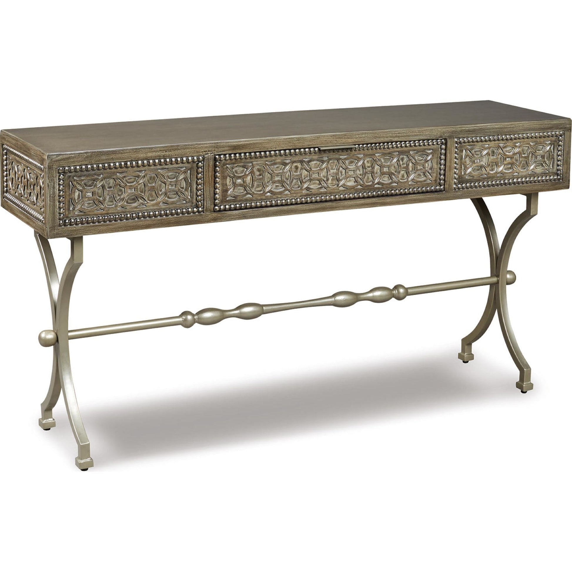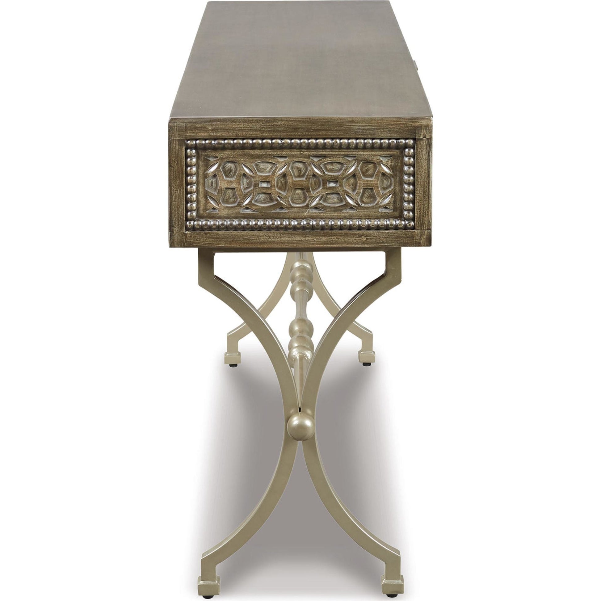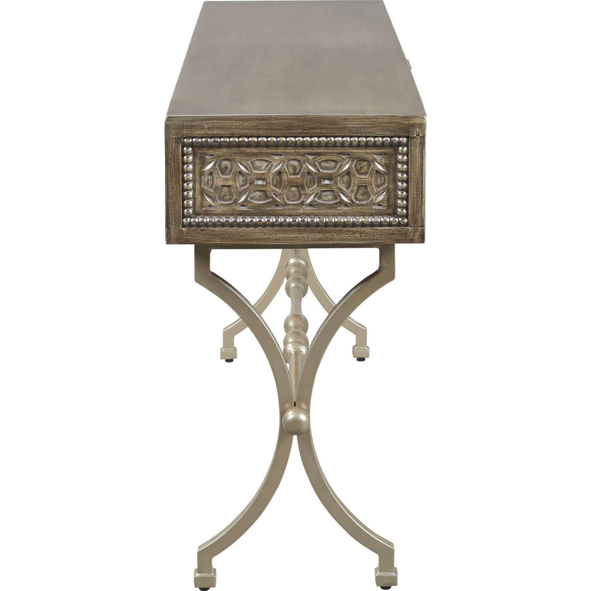 La console Quinnland allie style et fonctionnalité. Son allure décontractée est rehaussée d'un motif médaillon sur le devant. Le métal couleur champagne s'harmonise avec le bois à la finition gris vieilli. Exposez vos objets de décoration sur le plateau. Son piètement en X est aussi robuste qu'il en a l'air. Un tiroir fonctionnel vous permet de ranger vos petits objets à l'abri des regards.