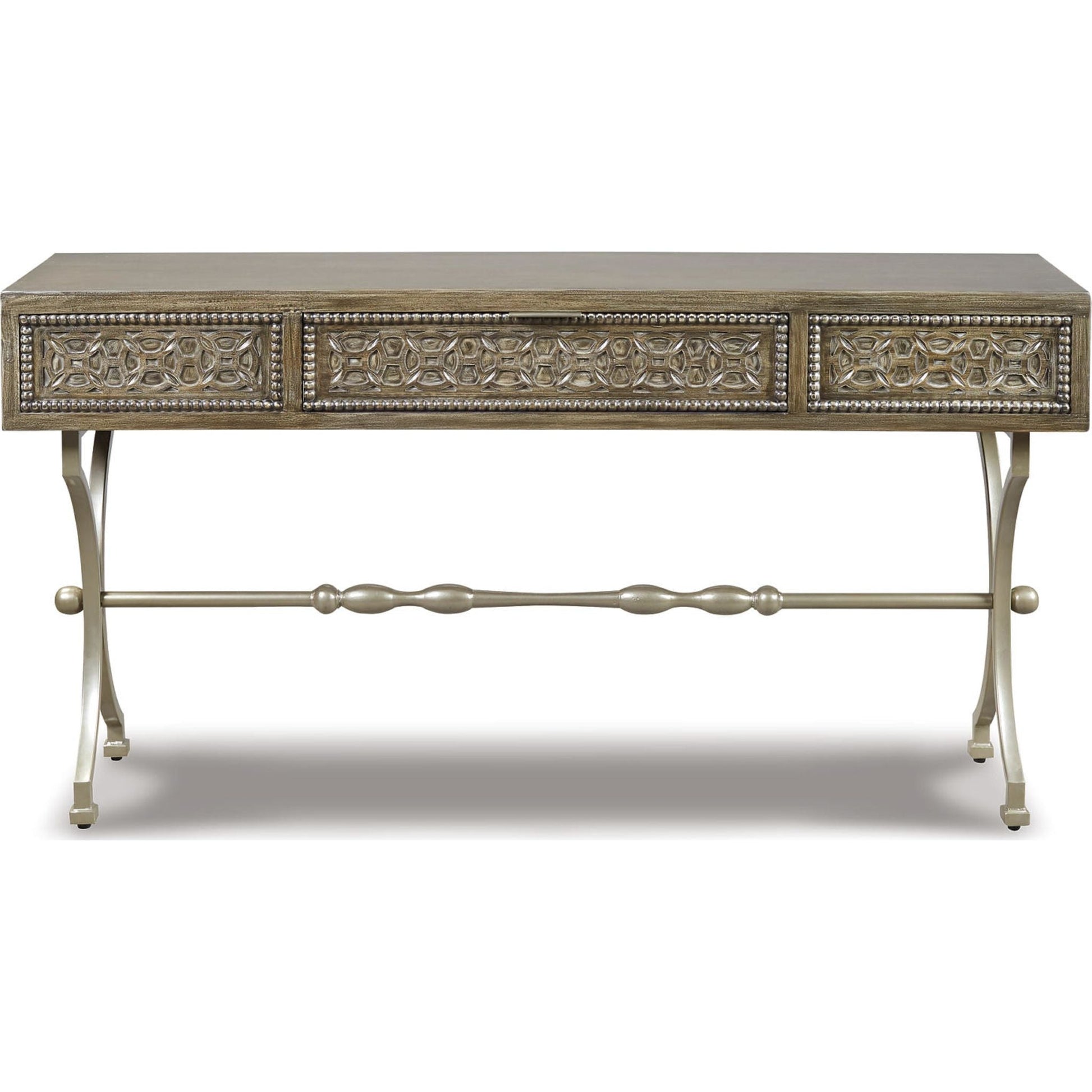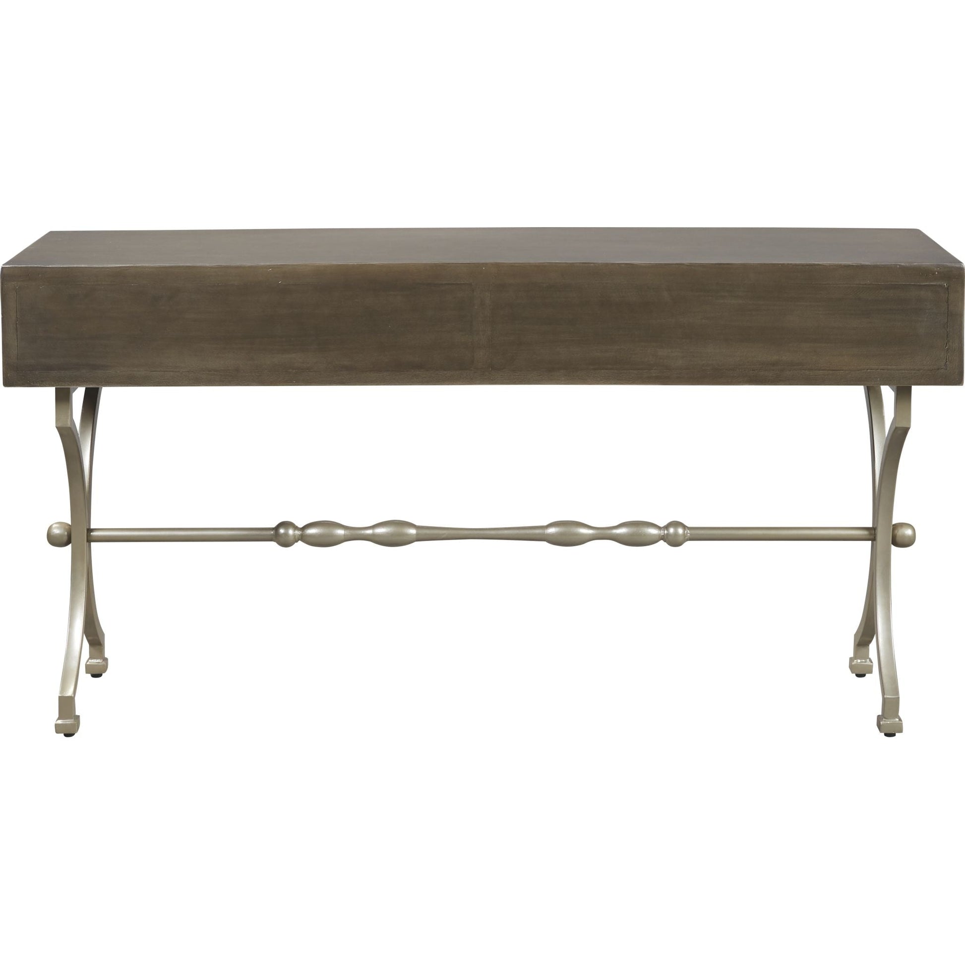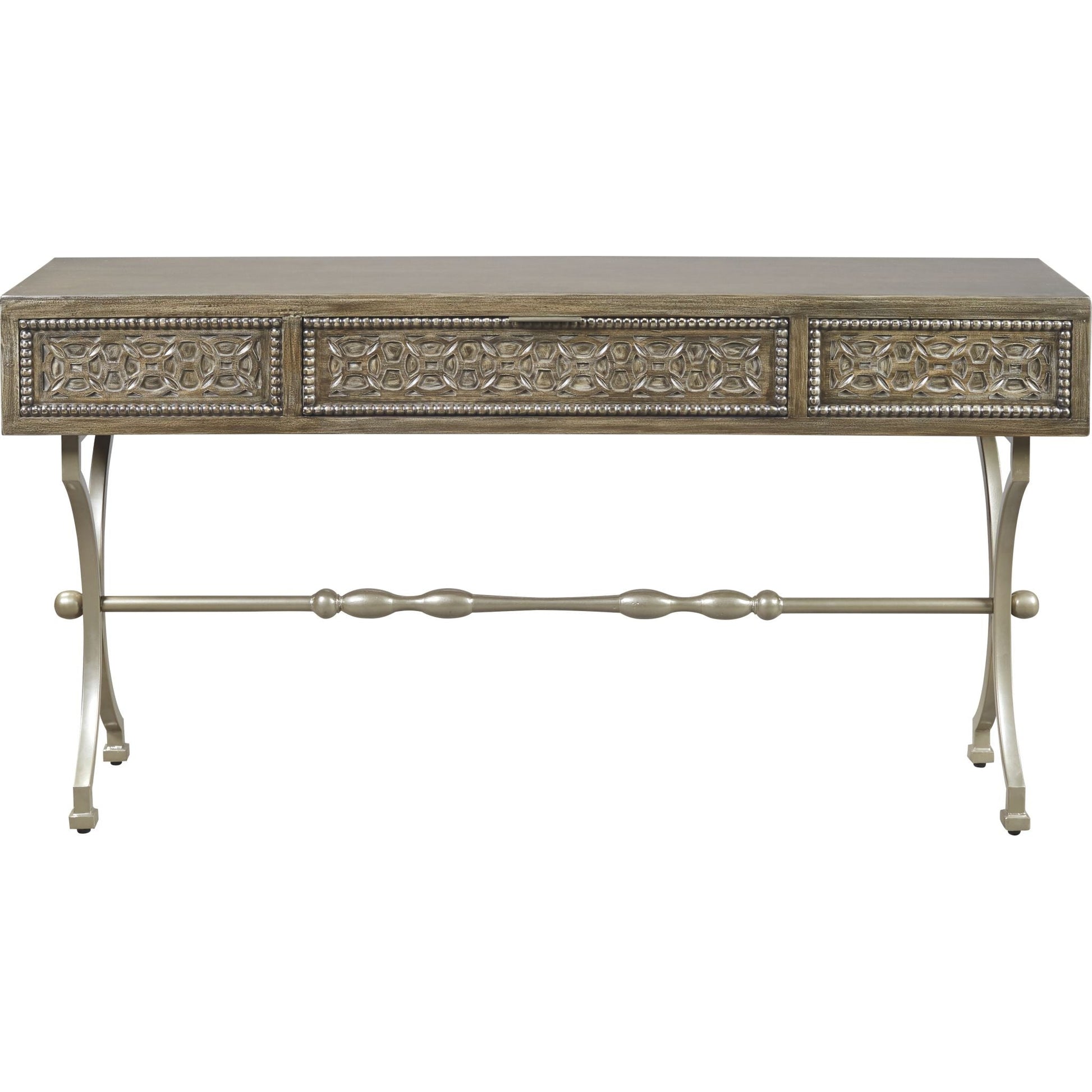 La console Quinnland allie style et fonctionnalité. Son allure décontractée est rehaussée d'un motif médaillon sur le devant. Le métal couleur champagne s'harmonise avec le bois à la finition gris vieilli. Exposez vos objets de décoration sur le plateau. Son piètement en X est aussi robuste qu'il en a l'air. Un tiroir fonctionnel vous permet de ranger vos petits objets à l'abri des regards.