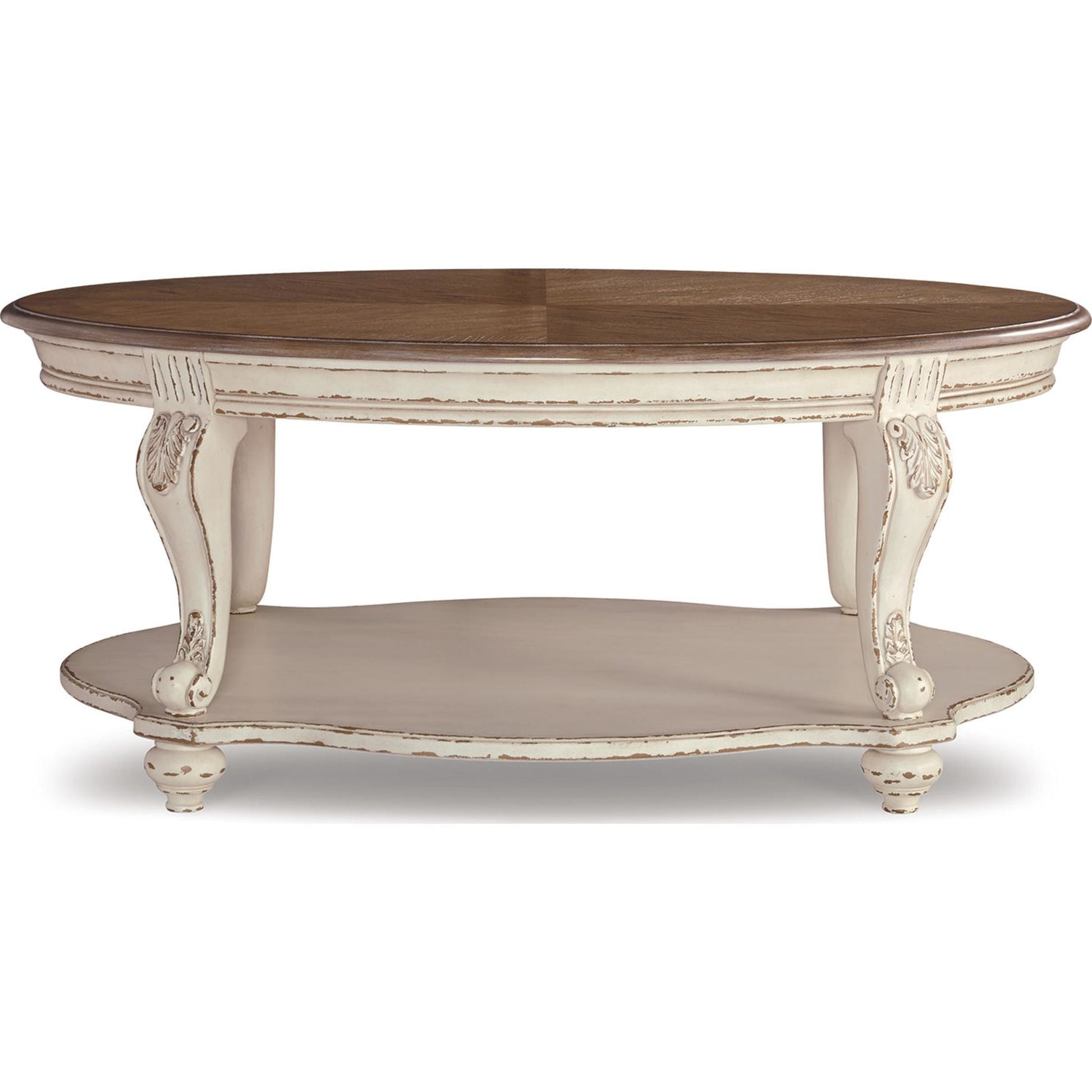 Sublimant le style cottage traditionnel, la table basse ovale Realyn vous accompagnera avec élégance pendant de nombreuses années. Son esthétique bicolore patinée associe un blanc écaillé à un plateau en bois vieilli pour un charme supplémentaire. Ses pieds cabriolet classiques et son étagère inférieure aux formes harmonieuses apportent une touche d'originalité. Des consoles décoratives ajoutent une note raffinée.