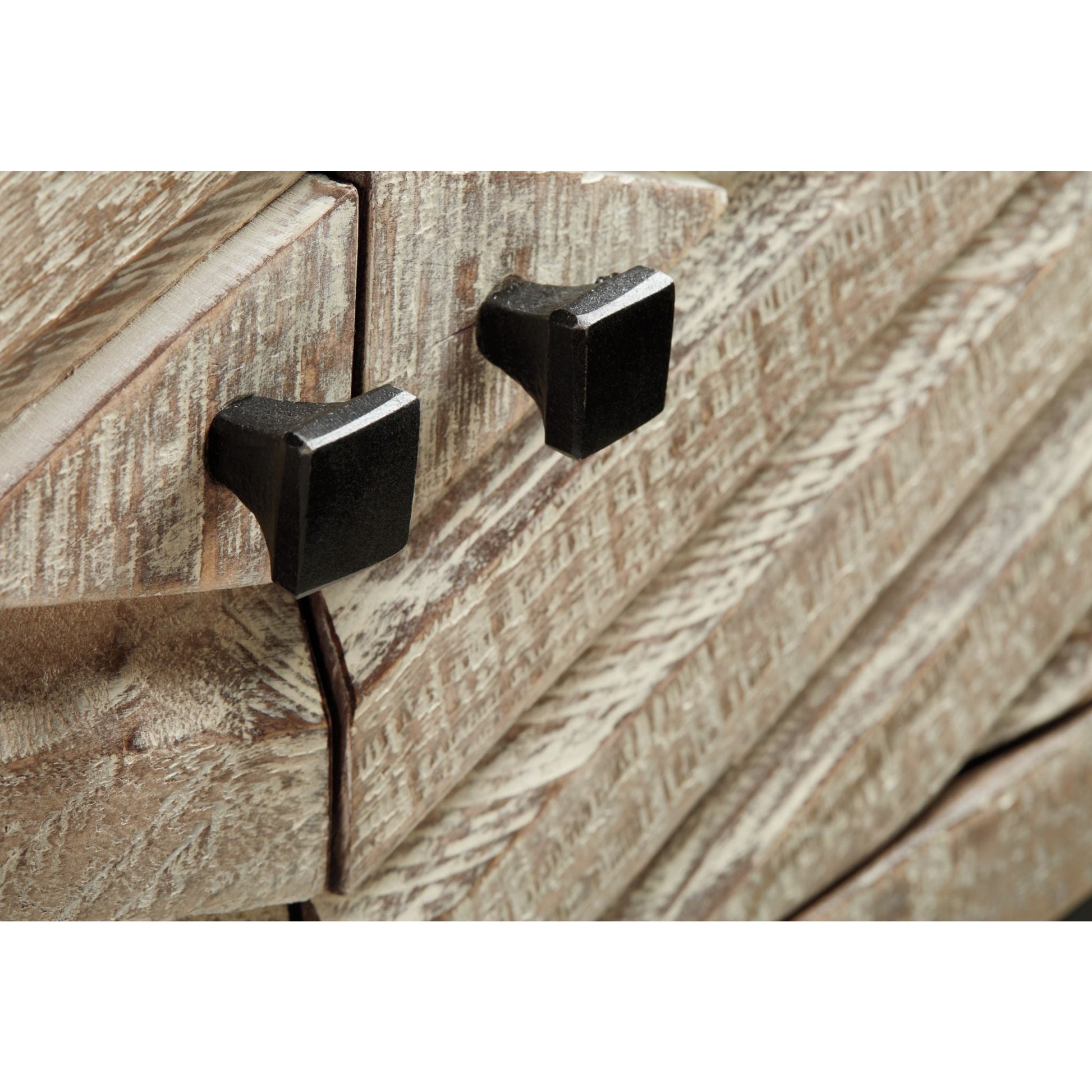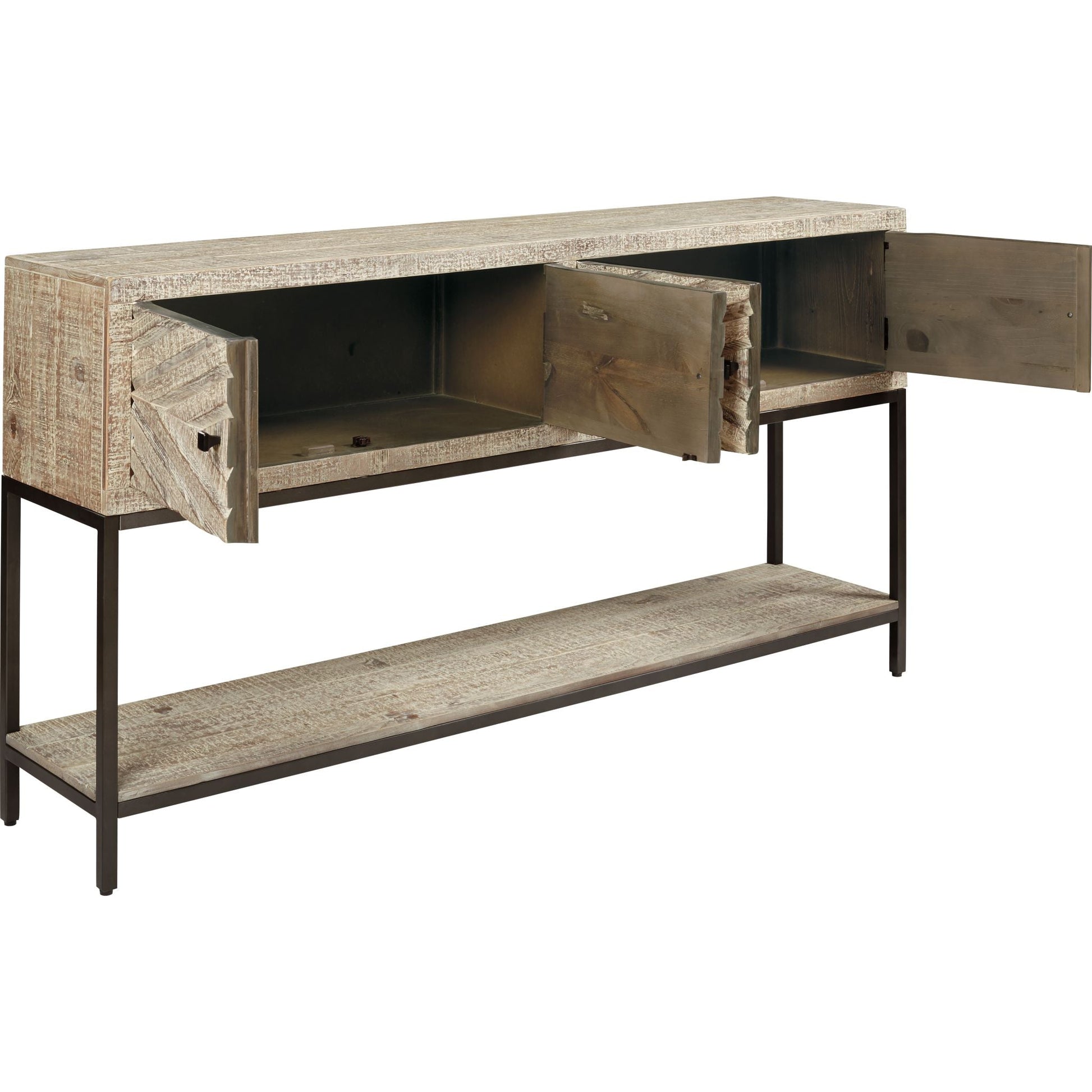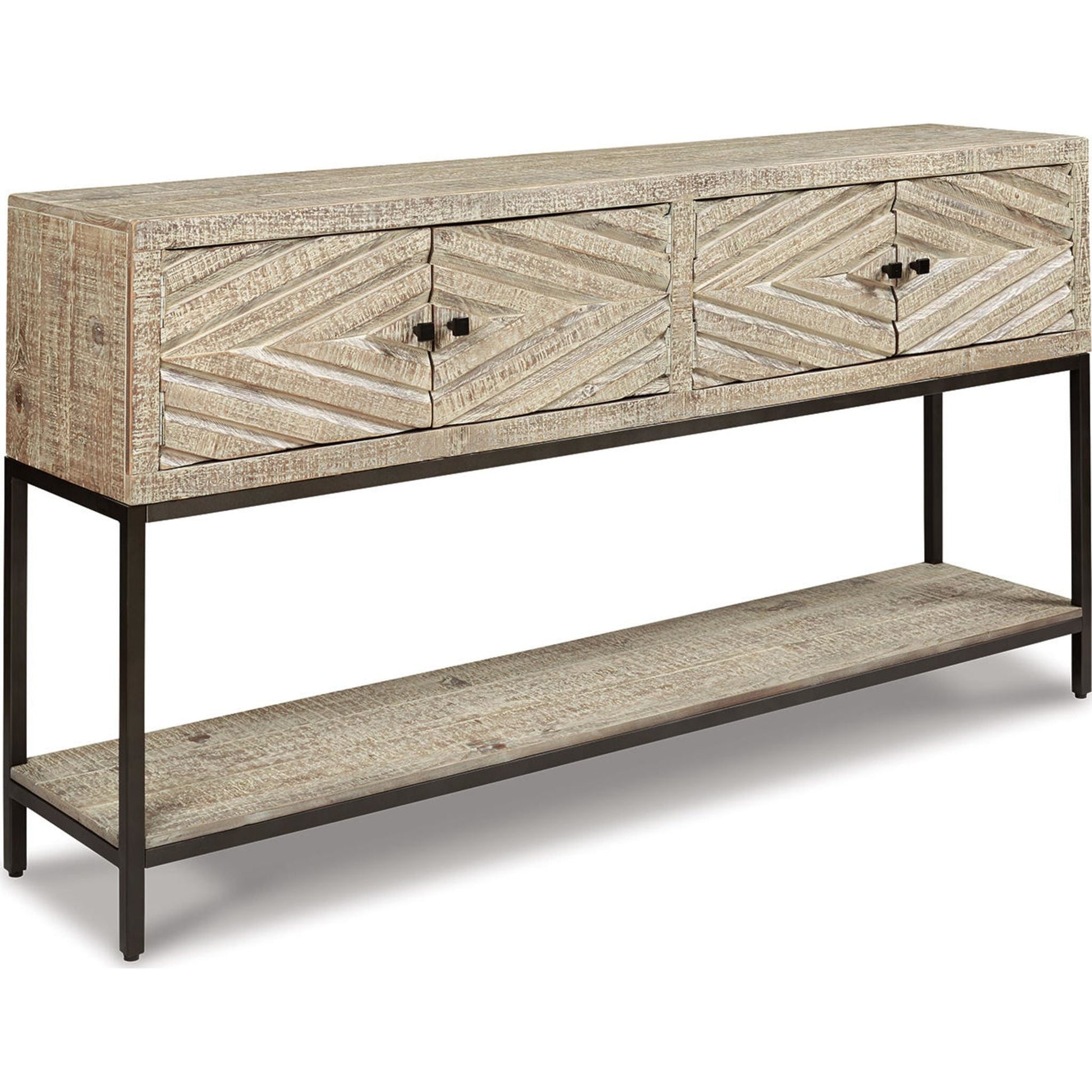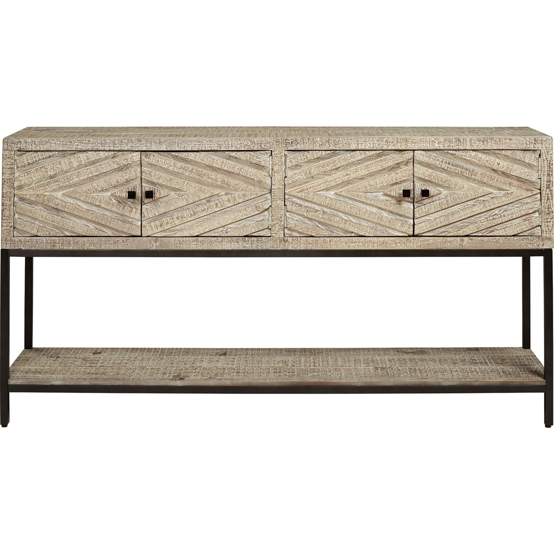 Affirmez votre style avec la console Roanley et son design contemporain. Ses portes d'armoire sculptées en losange, aux volumes généreux, en font un meuble design idéal pour une entrée, une salle à manger ou un salon. L'alliance du bois blanc vieilli et du métal noir est tout simplement saisissante.
