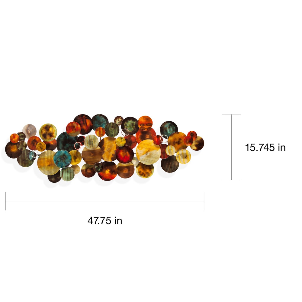 Illuminez votre intérieur avec cette sculpture brillante, réalisée en tôle et peinte à la main avec un vernis réfléchissant. Des cercles superposés, disposés sur des tubes métalliques, sont peints dans des tons multicolores pour un style contemporain unique.