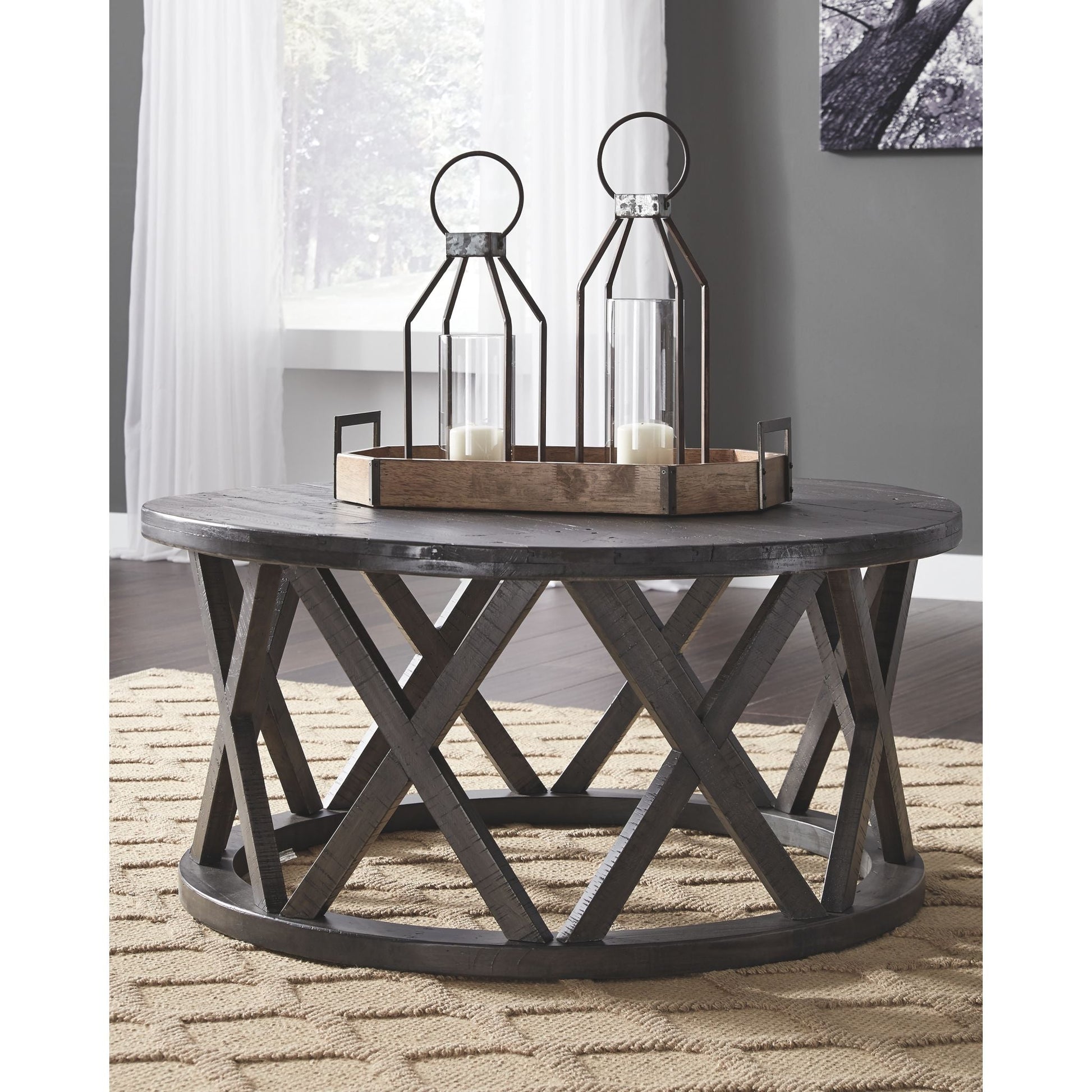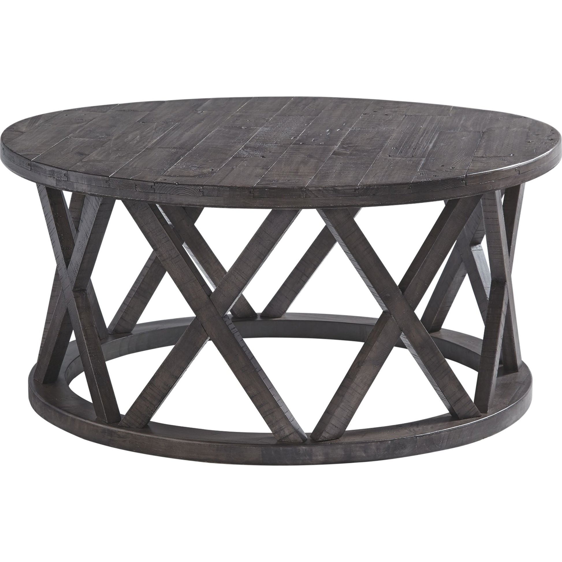 Affirmez votre style avec audace et élégance grâce à la table basse Sharzane, au charme rustique indéniable. Son design transitionnel lui confère une allure décontractée. Un piètement cylindrique orné de motifs en « X » répétés, unique en son genre, contraste avec le plateau rond à l'effet planches, riche en détails et à la finition patinée. Les rainures de scie apportent une touche de caractère à chaque motif en « X » du piètement, un atout indéniable pour créer une ambiance rustique et chaleureuse dans votre salon.