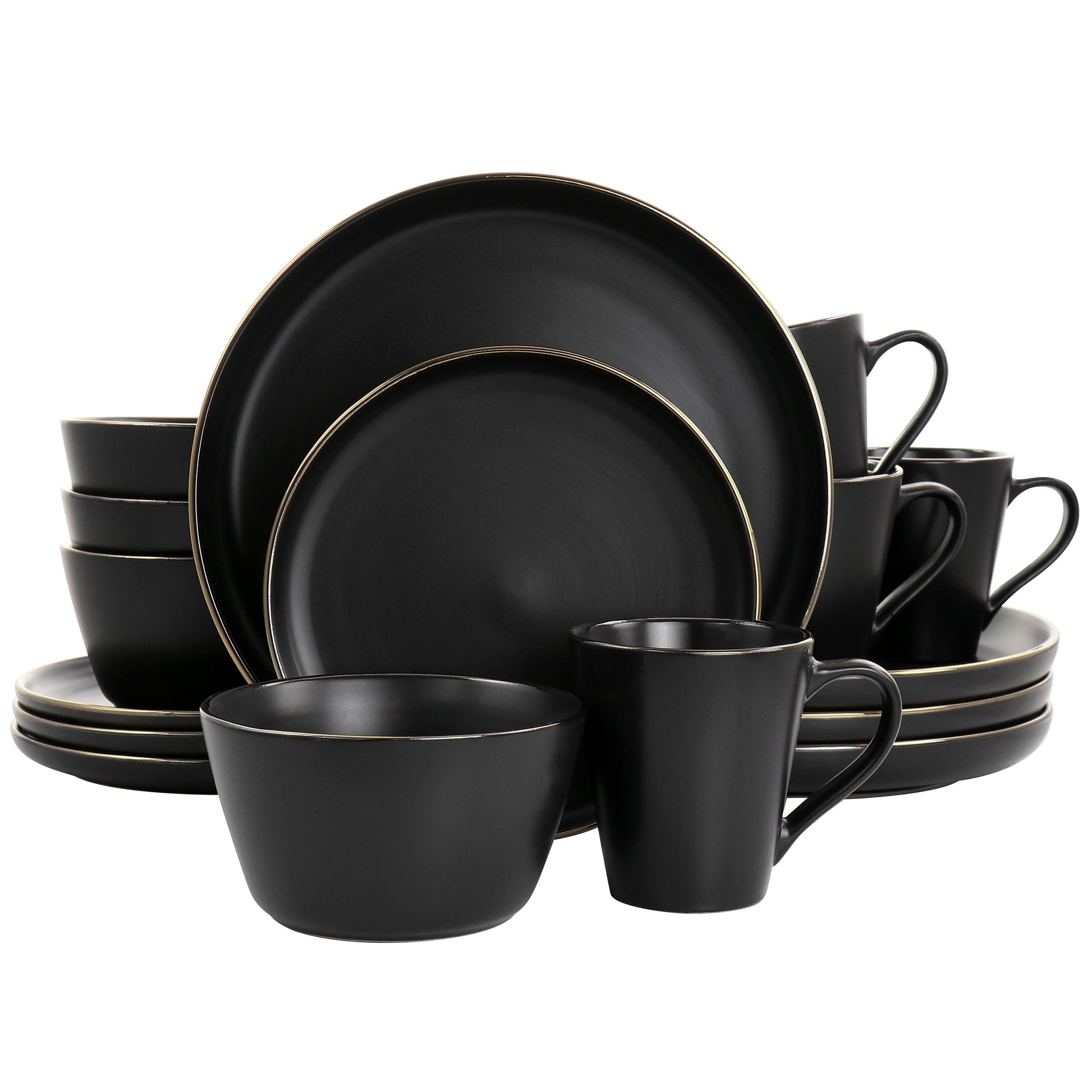 Sublimez votre table avec ce service de table rond en grès de 16 pièces, au fini noir mat sophistiqué et liseré doré. Chaque assiette, unique par sa base plate, son bord surélevé et sa bordure dorée, est une pièce maîtresse. Son élégant liseré doré apporte une touche de raffinement à votre table. Fabriqué en grès, ce service est idéal pour les grandes occasions et suffisamment robuste pour un usage quotidien. Chaque assiette passe au micro-ondes pour un réchauffage rapide et au lave-vaisselle pour un nettoyage facile.