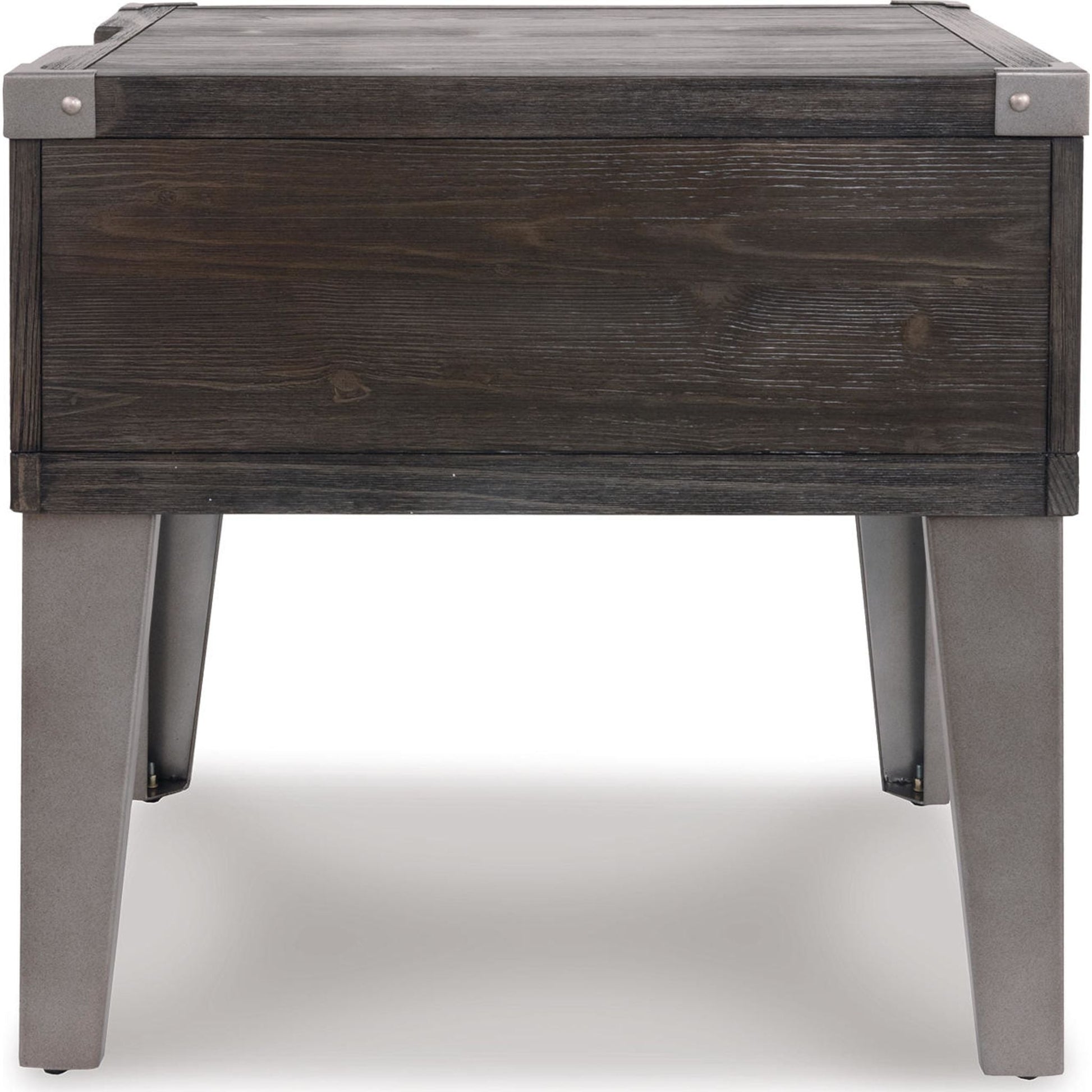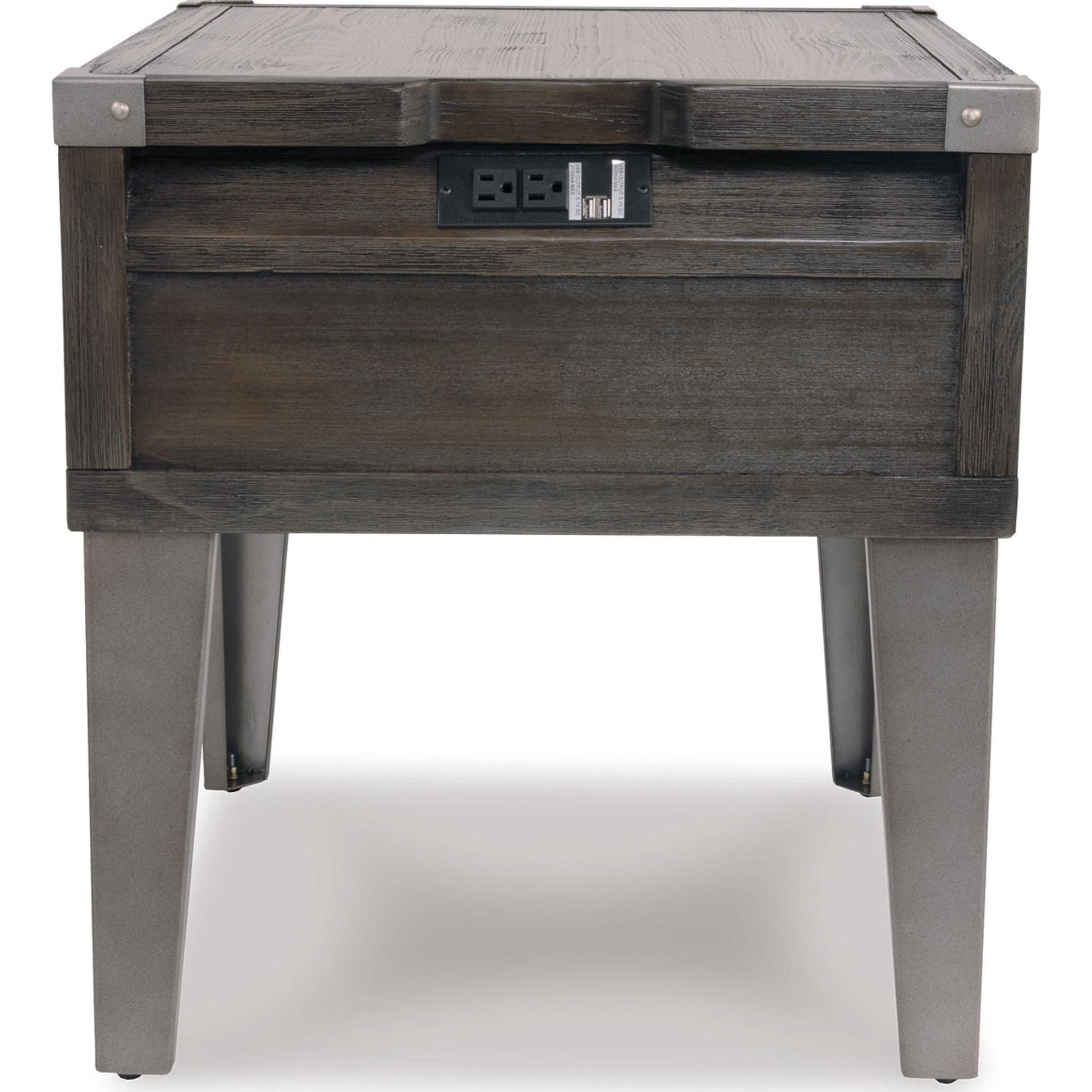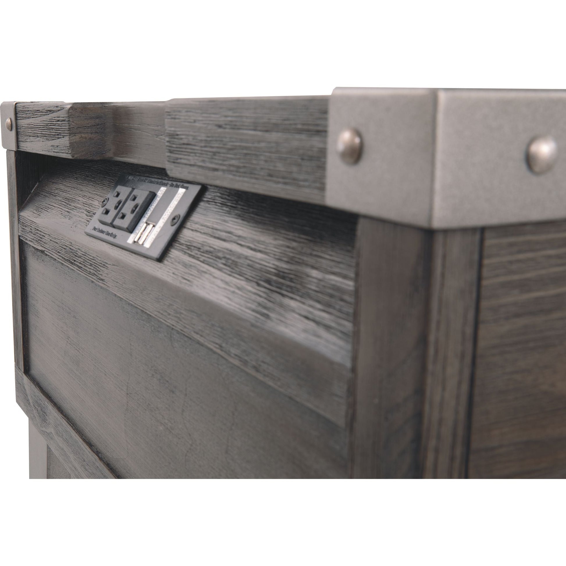 Affirmez votre style rustique-industriel avec cette table d'appoint mêlant différents matériaux. Le pin patiné et le placage contrastent avec les pieds en métal inclinés et les équerres d'angle, créant ainsi une fusion chic et unique entre charme naturel et style contemporain. Des prises électriques et des ports de chargement USB situés à l'arrière ajoutent une touche pratique à son esthétique remarquable.