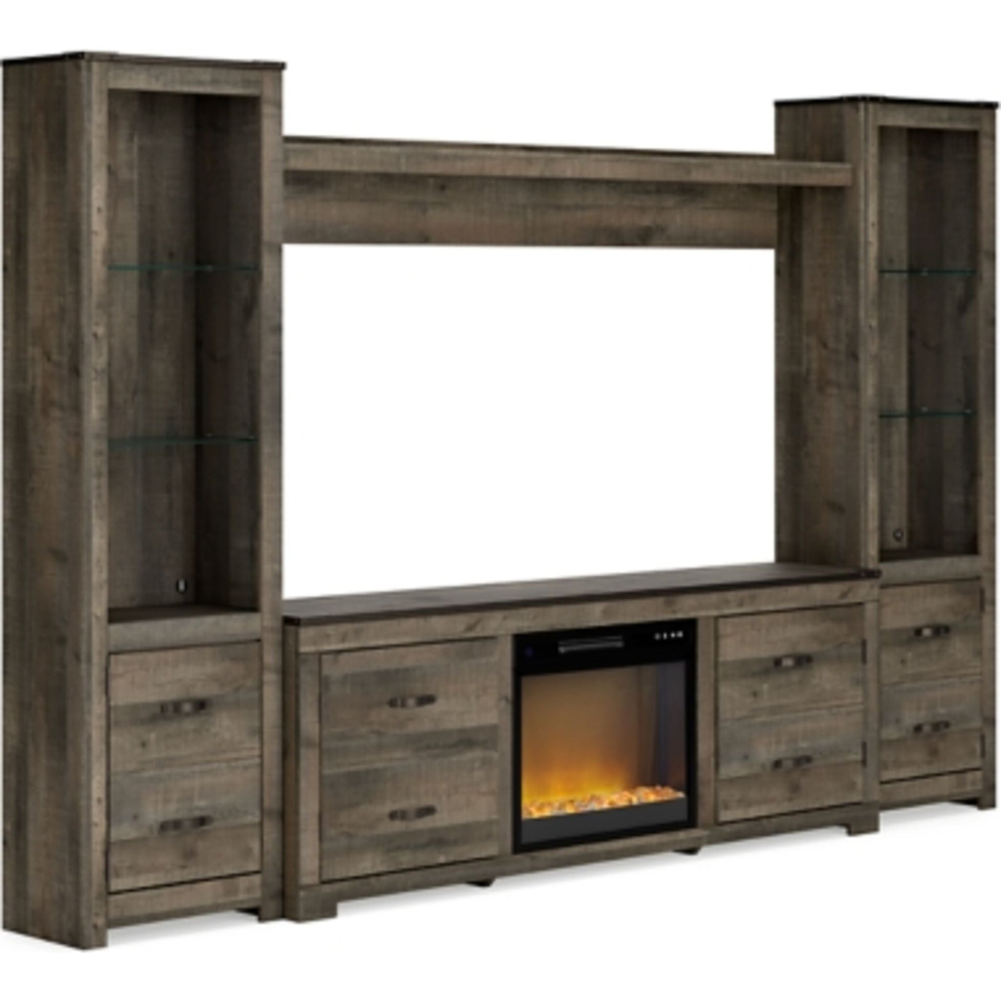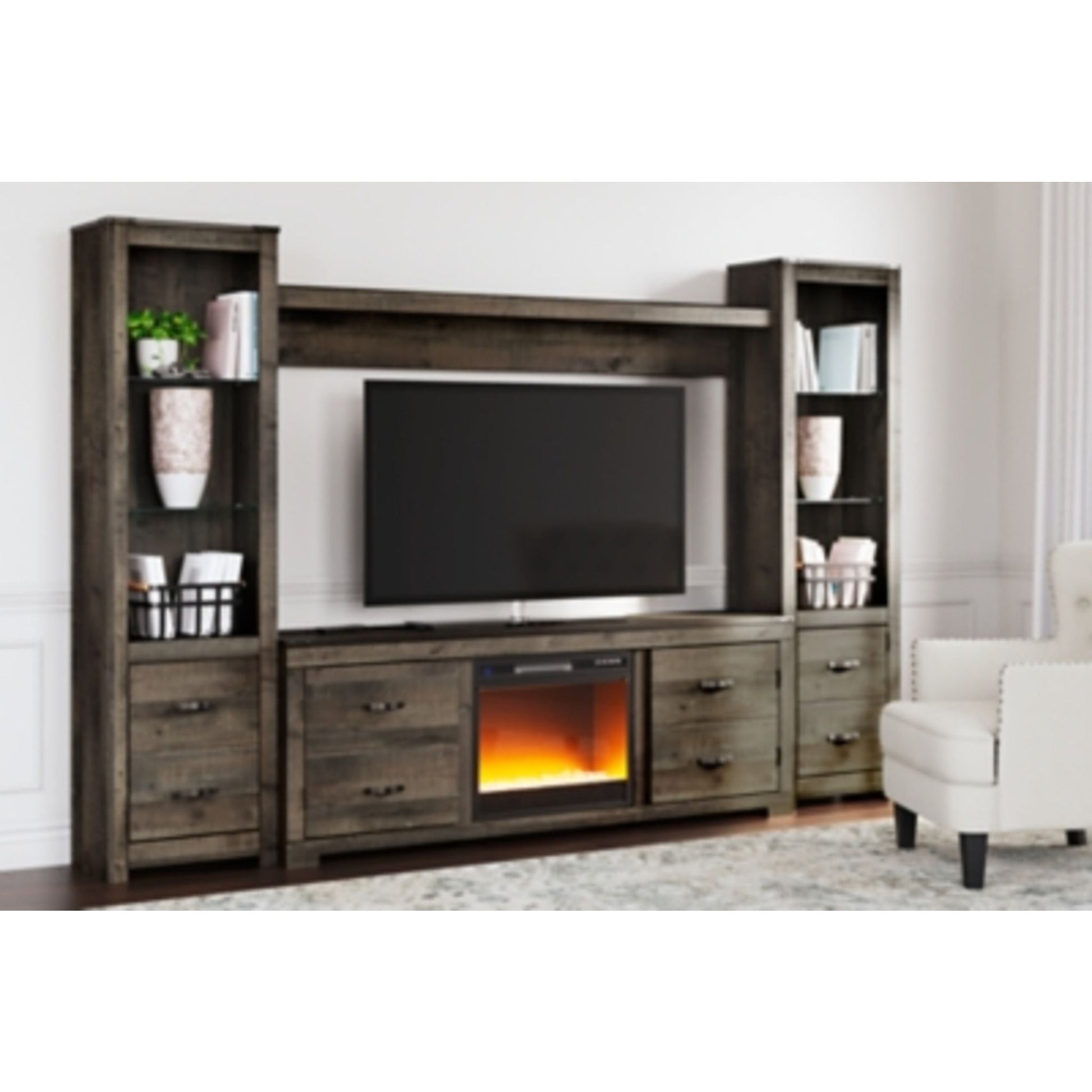 Affirmez votre style avec l'ensemble TV 4 pièces Trinell, alliant robustesse et élégance. Sa finition chaleureuse et ses détails façon planches évoquent le bois de grange recyclé, tandis que les bandes métalliques ornées de clous décoratifs apportent une touche industrielle moderne. Ses lignes épurées lui confèrent une élégance intemporelle, aussi bien à la campagne qu'en ville. Pour une touche d'exception, optez pour un insert de cheminée LED, utilisable avec ou sans chauffage, doté de six niveaux de température, d'une télécommande et d'une protection contre la surchauffe pour une sécurité accrue. L'insert est fourni avec des cristaux de verre et des pierres naturelles (en option), vous permettant ainsi de personnaliser l'aspect du foyer.