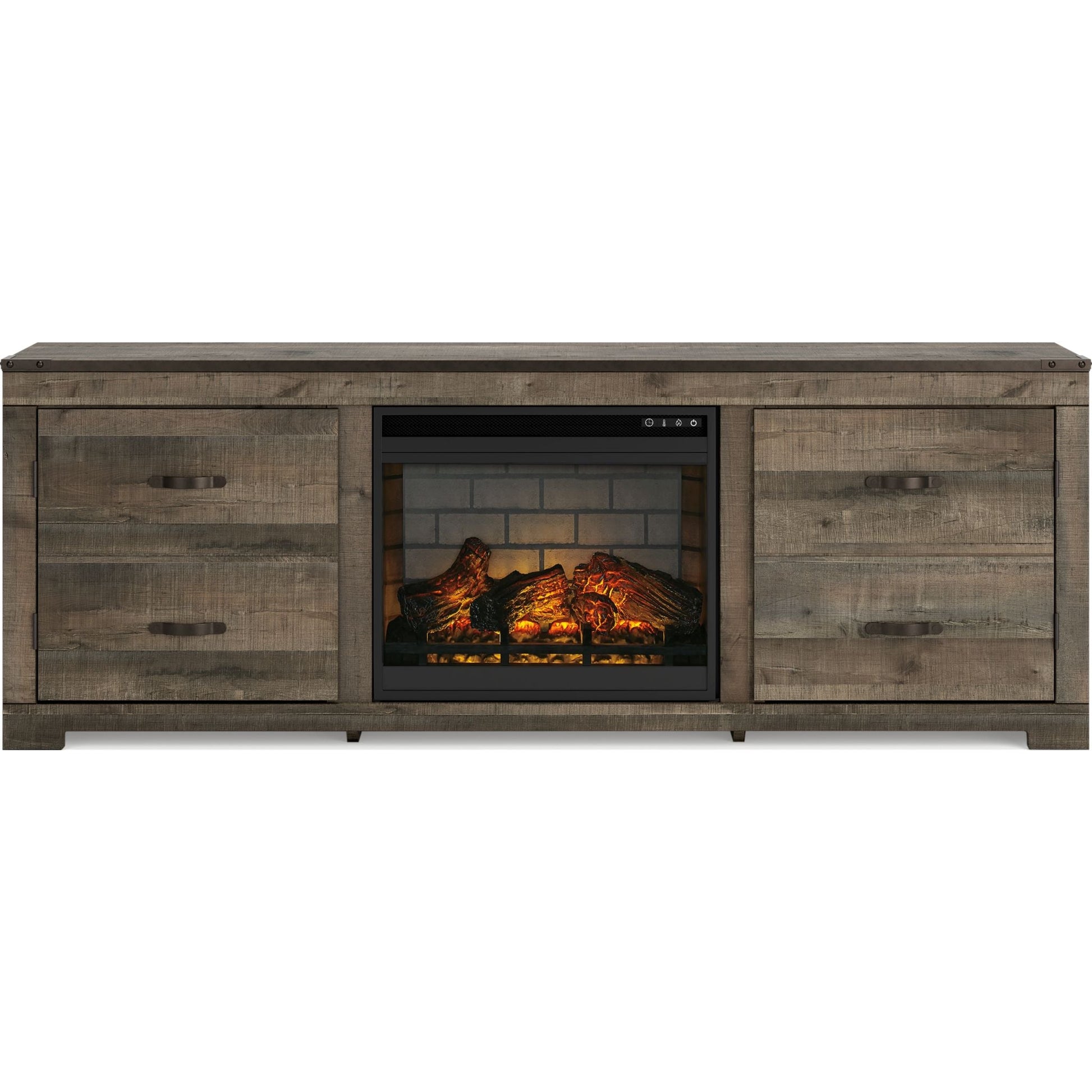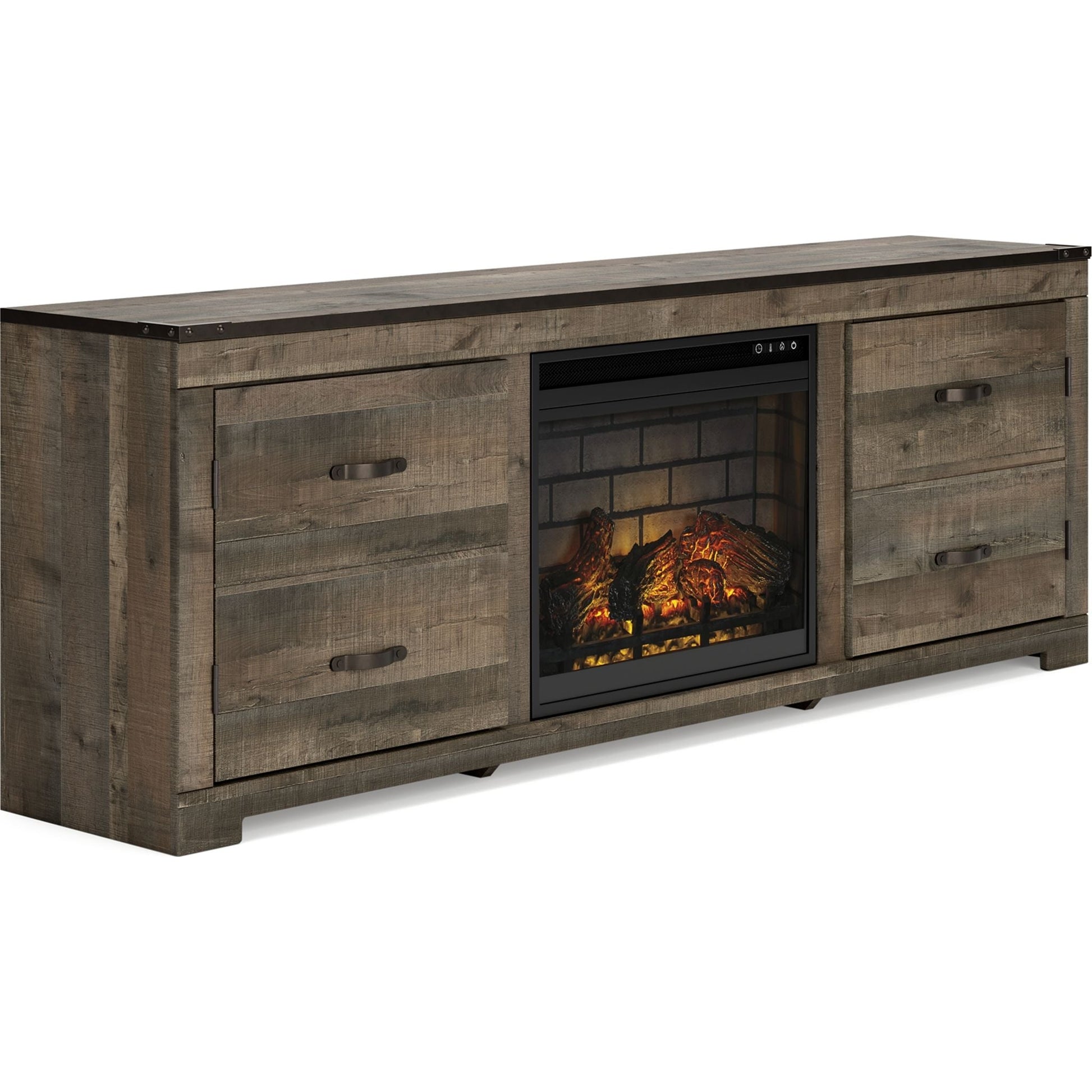 Affirmez votre style à la fois rustique et raffiné avec le grand meuble TV Trinell et son insert de cheminée. Sa finition chaleureuse et ses détails façon planches évoquent le bois de grange recyclé, tandis que les bandes métalliques ornées de clous décoratifs apportent une touche industrielle et moderne. Ses lignes épurées lui confèrent une élégance intemporelle, s'intégrant aussi bien à la campagne qu'en ville. Pour une ambiance encore plus chaleureuse, découvrez son insert de cheminée électrique infrarouge, entouré de fausses briques réfractaires. Fonctionnant avec ou sans chauffage infrarouge, il offre un réglage multi-flammes, 7 niveaux de température, 5 niveaux de luminosité et un effet de braises incandescentes à LED.